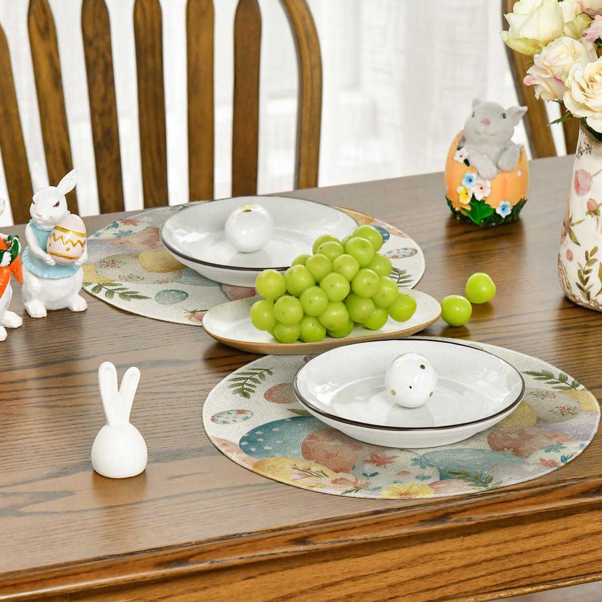 Artoid Mode Rabbit Bunny Eggs Leaves Flowers Round Easter Placemats Set of 4, 14 Inch Spring Round Table Mats for Dining Decoration(Beige)