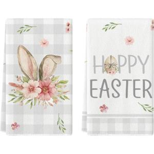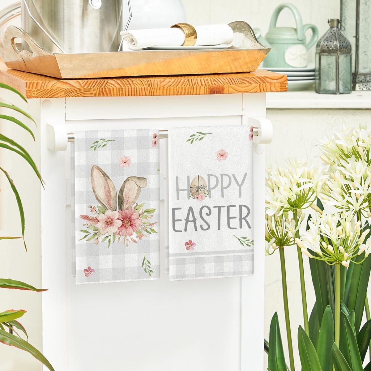 Artoid Mode Happy Easter Bunny Flower Kitchen Dish Towels, 18 x 26 Inch Seasonal Spring Easter Rabbit Ultra Absorbent Drying Cloth Tea Towels for Cooking Baking Set of 2(Beige)