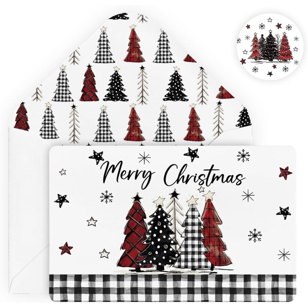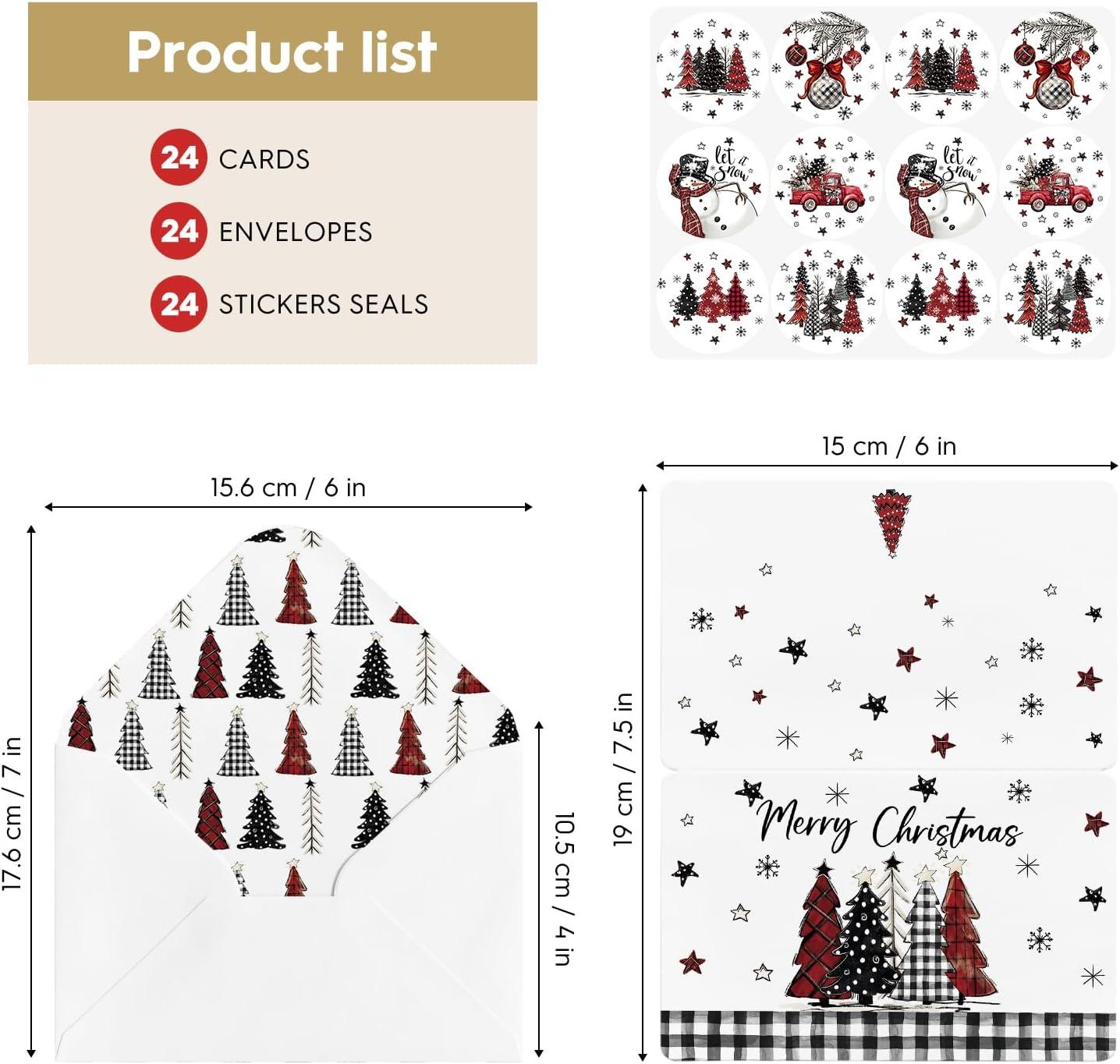 Artoid Mode 24 Pack Merry Christmas Thank You Cards Star Red Black Xmas Tree Greeting Cards Gift With Envelope Sticker Blank Note Cards for Birthday Wedding Baby Shower Bridal Shower, 4 x 6 Inch(Black/White)