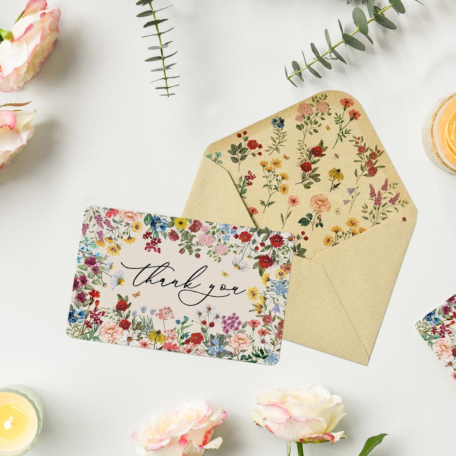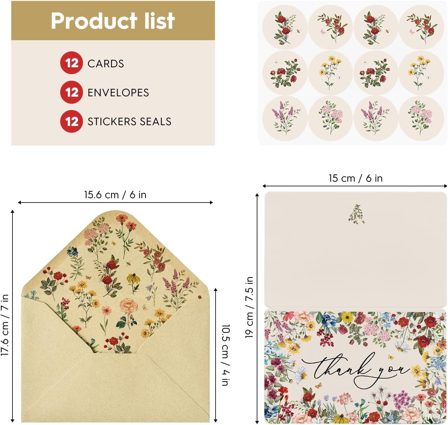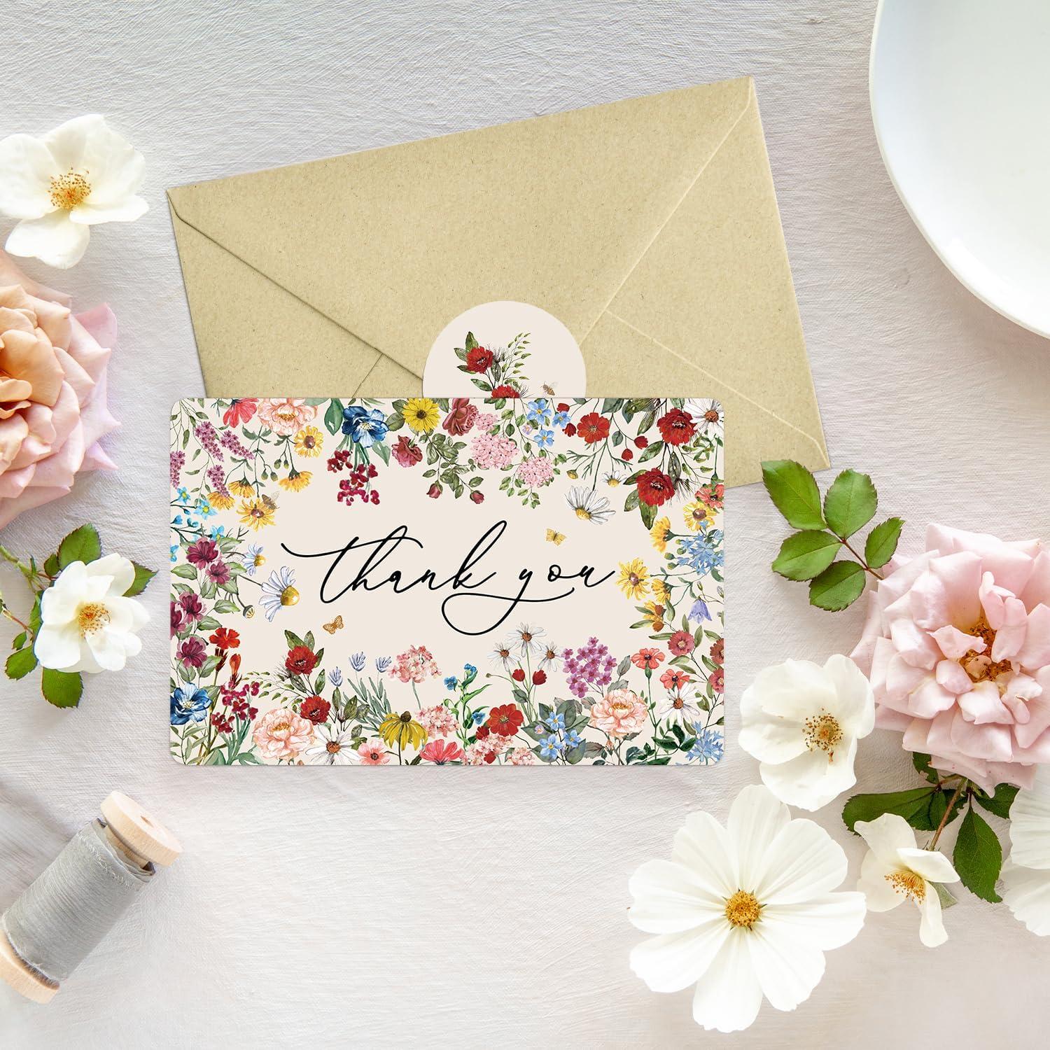 Artoid Mode 24 Pack Vintage Wildflower Thank You Cards Flower Greeting Cards Gift With Envelope Sticker Blank Note Cards for Birthday Wedding Baby Shower Bridal Shower, 4 x 6 Inch(Brown)