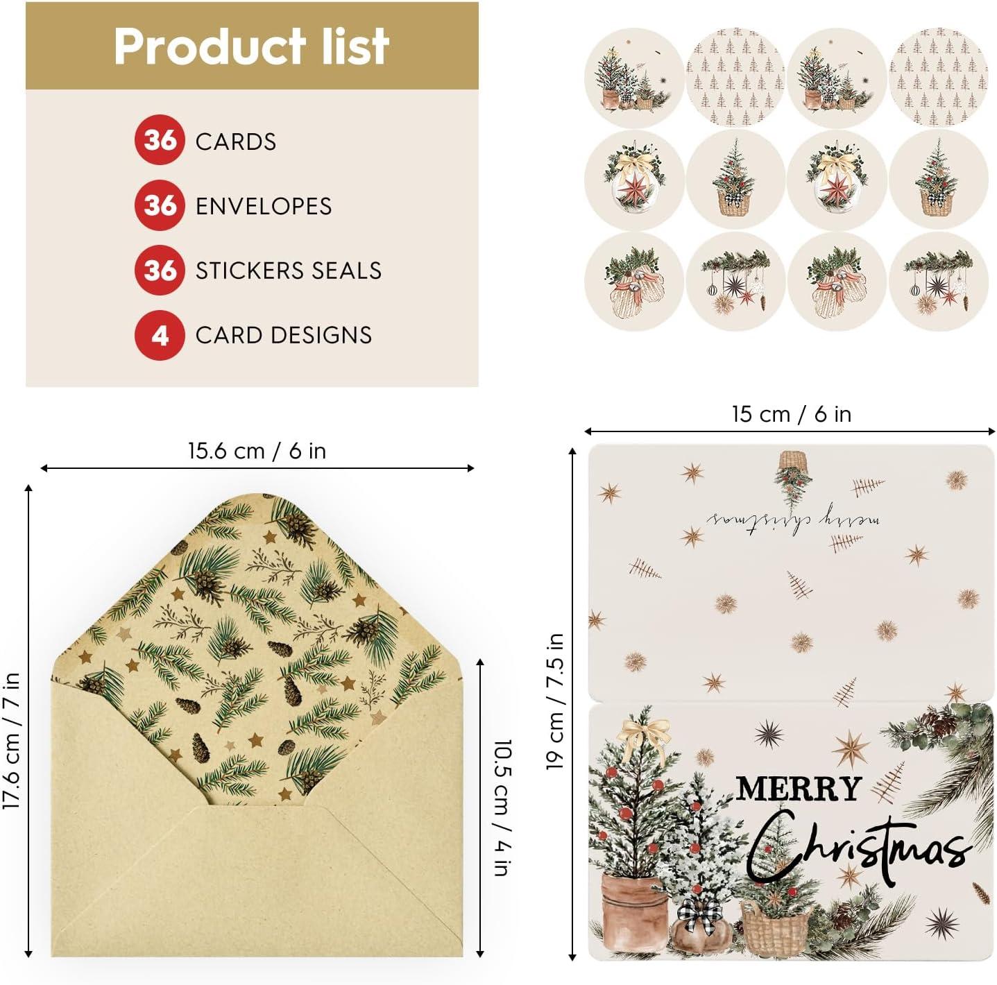 Artoid Mode 36 Pack Merry Christmas Thank You Cards Gloves Basket Xmas Tree Greeting Cards Gift With Envelope Sticker Blank Note Cards for Birthday Wedding Baby Shower Bridal Shower, 4 x 6 Inch