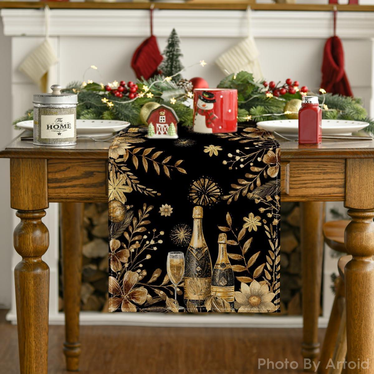 Artoid Mode Black and Golden Floral Fireworks Champagne 2026 Happy New Year Table Runner, Festival Kitchen Dining Table Decoration for Home Party Decor 13×72 Inch