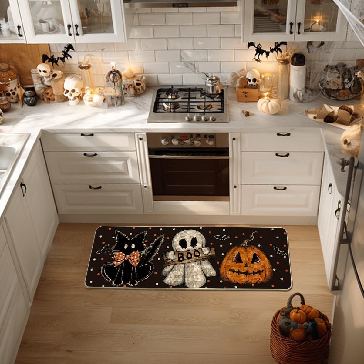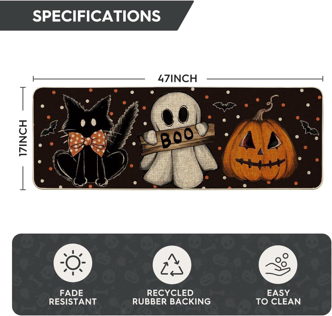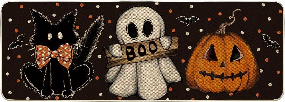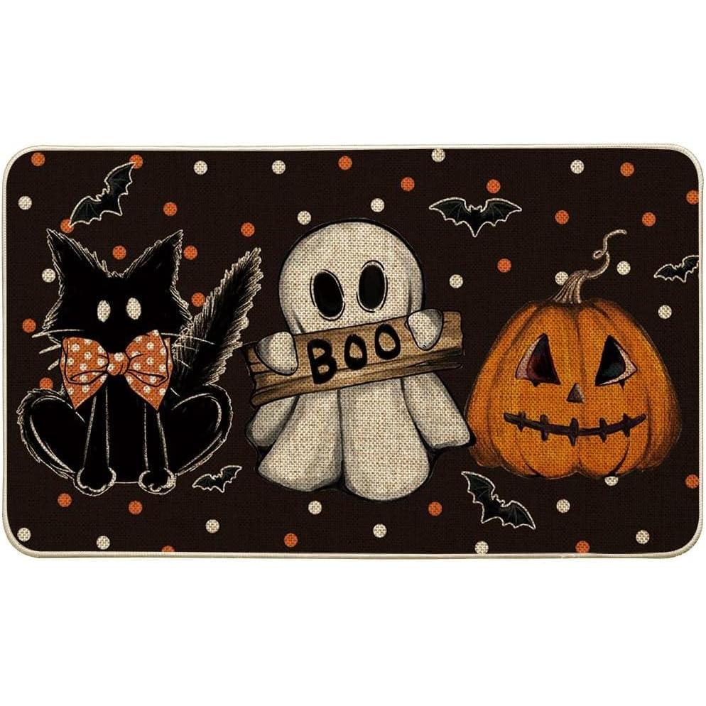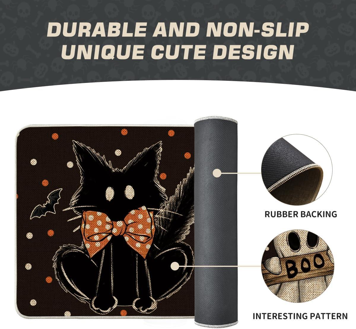 Artoid Mode Black Cat Jack-O’-Lantern Ghost Pumpkins Halloween Doormat, Seasonal Low-Profile Floor Switch Mat for Indoor Outdoor 17×29 Inch(Black)