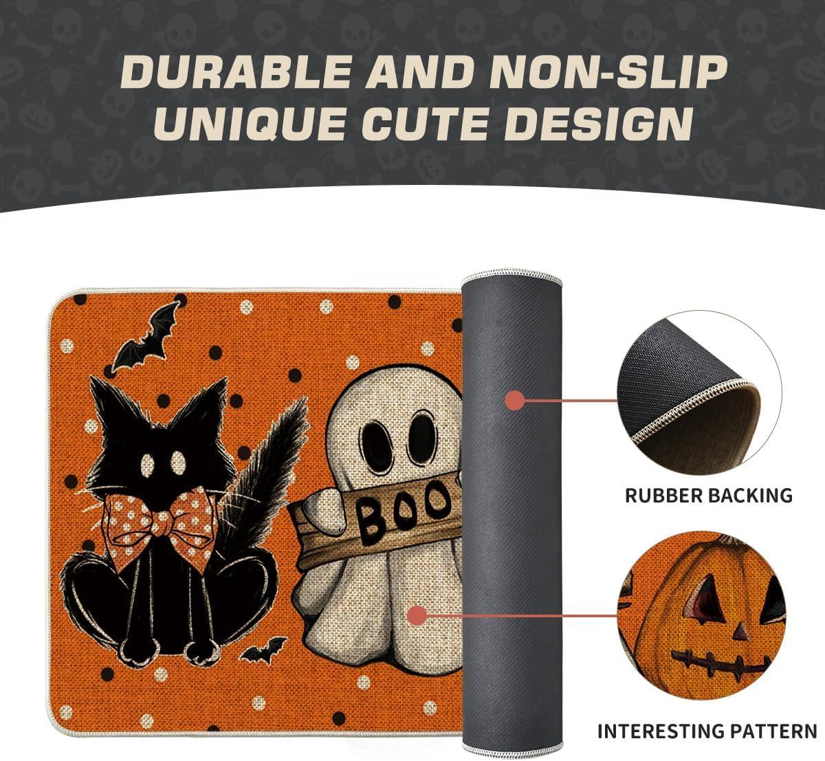 Artoid Mode Black Cat Jack-O’-Lantern Ghost Pumpkins Halloween Doormat, Seasonal Low-Profile Floor Switch Mat for Indoor Outdoor 17×29 Inch(Orange)