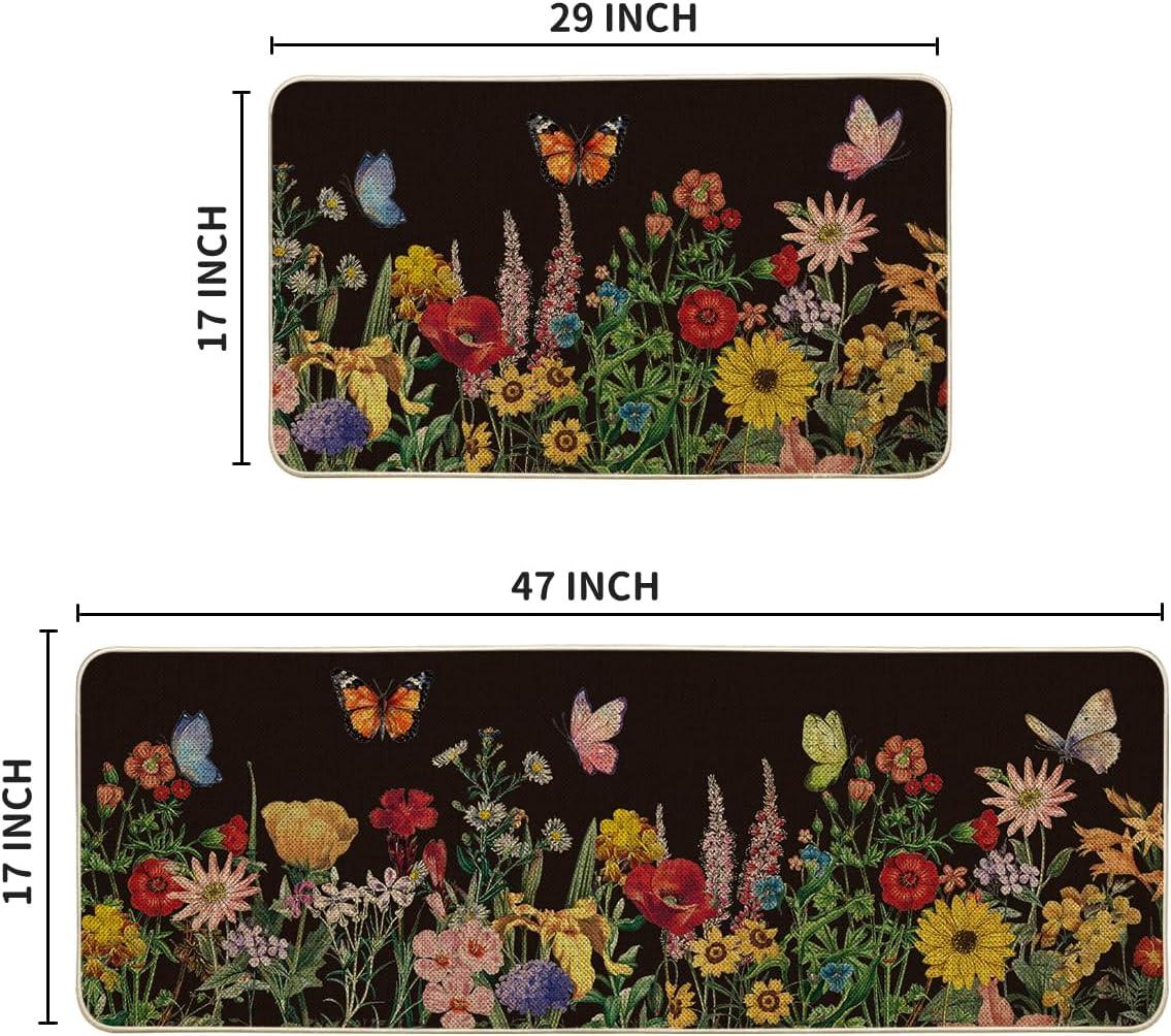 Artoid Mode Black Flowers Butterfly Spring Kitchen Mats Set of 2, Seasonal Home Decor Leaves Low-Profile Kitchen Rugs for Floor – 17×29 and 17×47 Inch(Black)