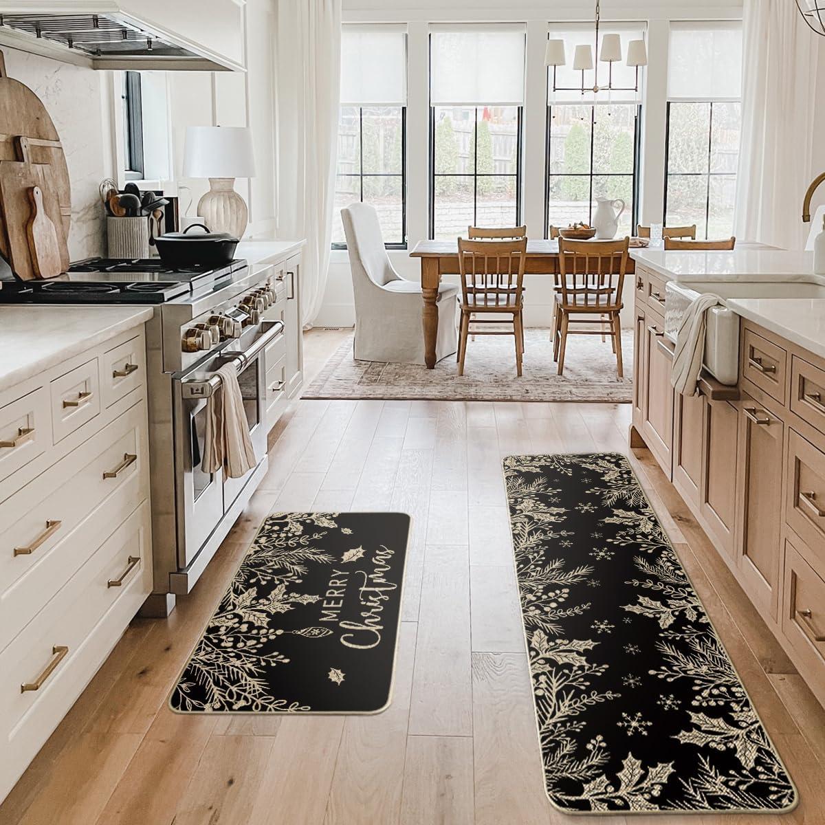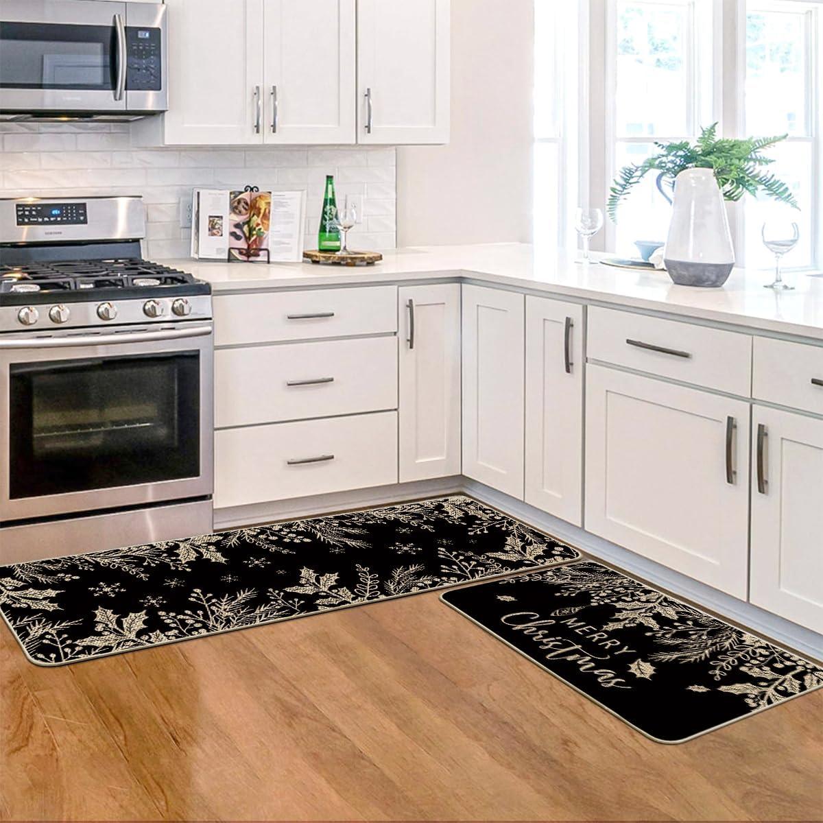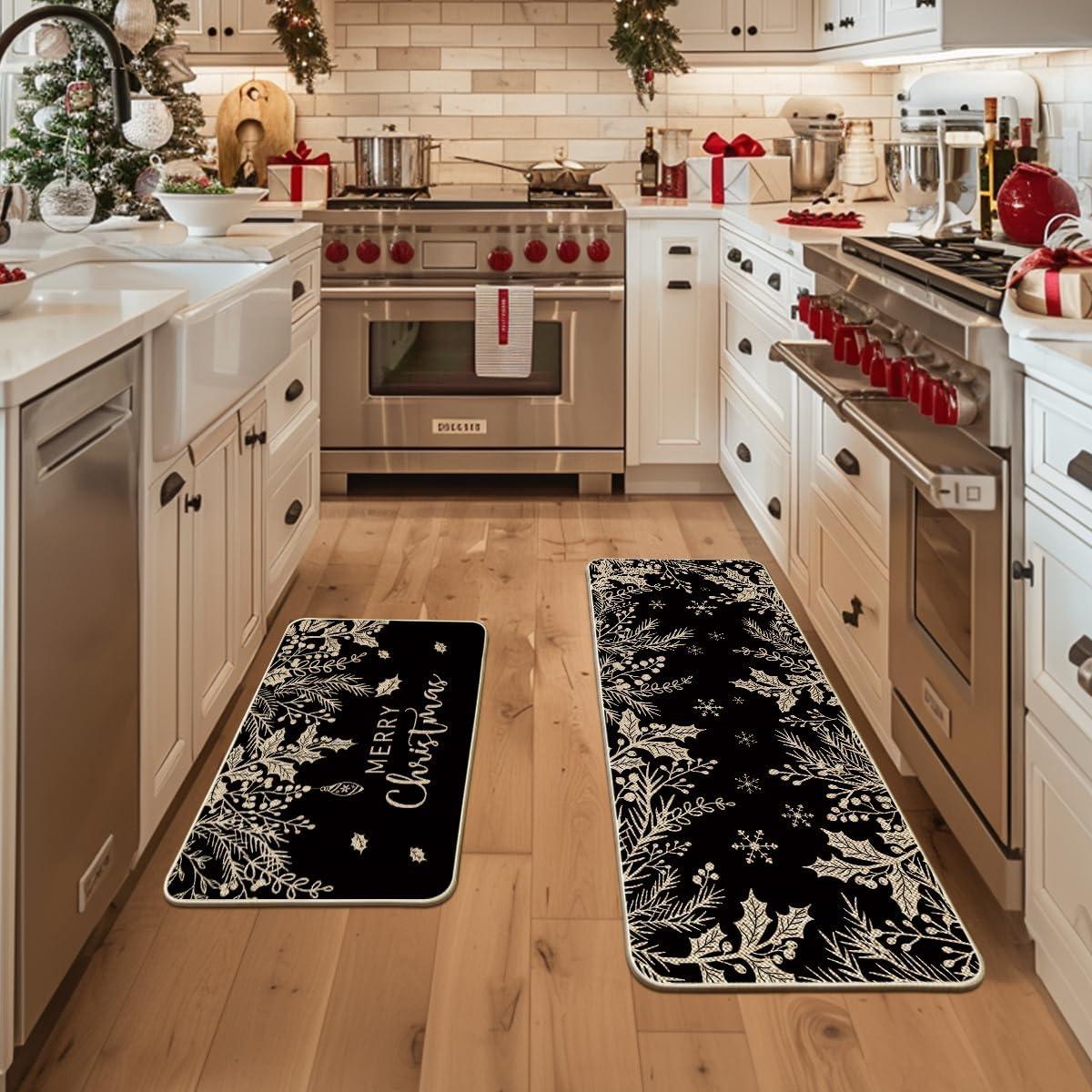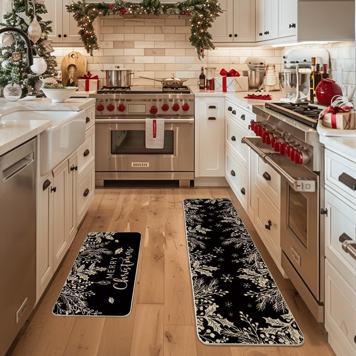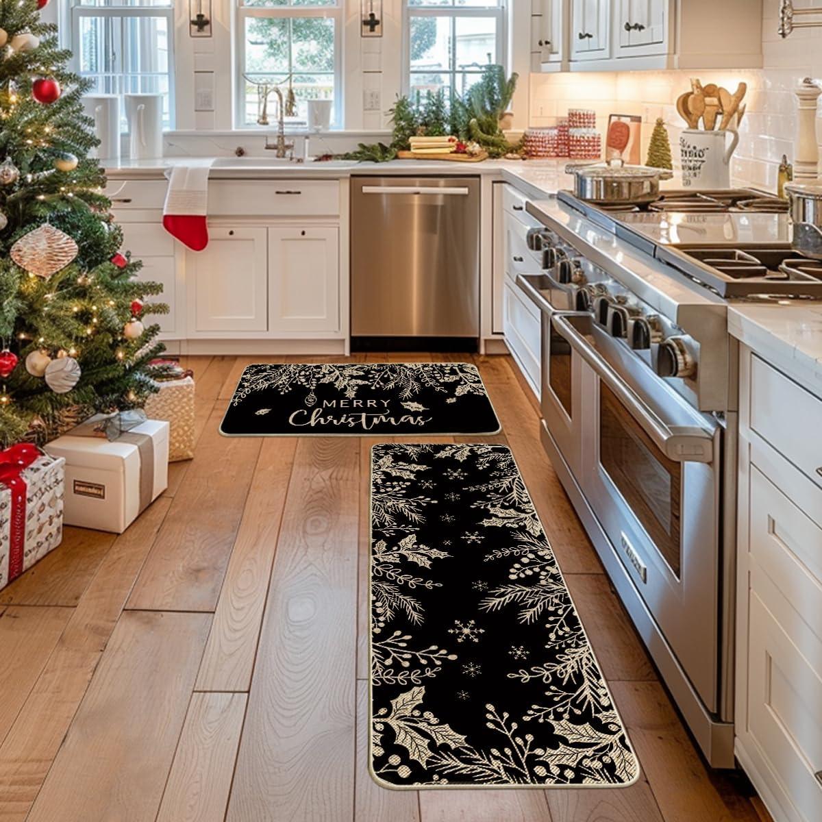 Artoid Mode Black Holly Pine Branches Merry Christmas Kitchen Mats Set of 2, Winter Decor Low-Profile Kitchen Rugs for Floor – 17×29 and 17×47 Inch(Black)