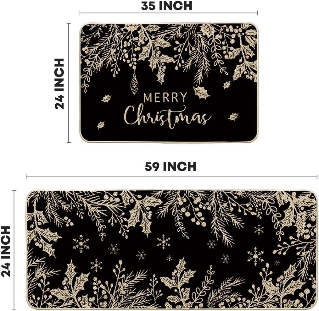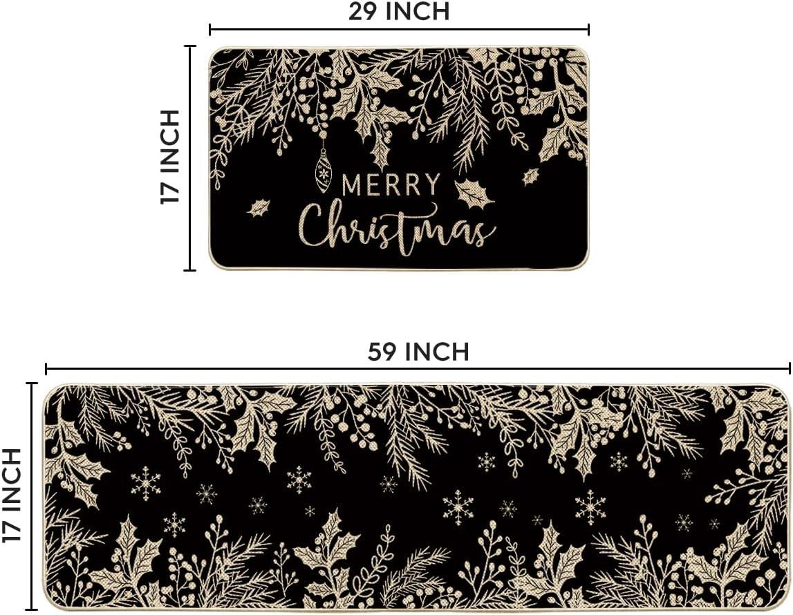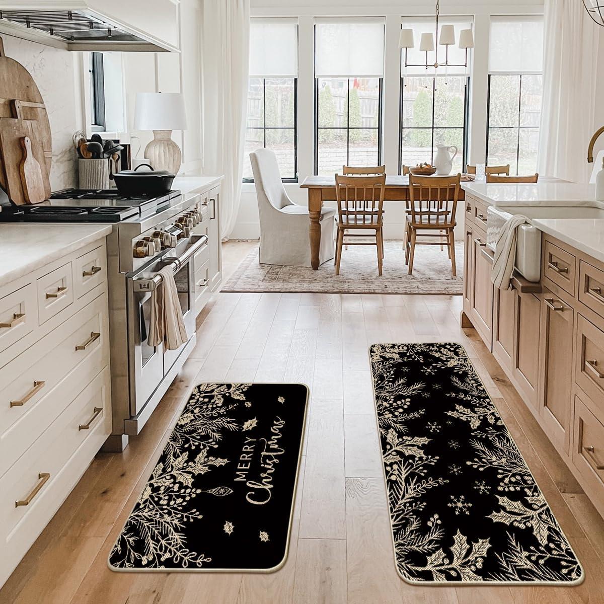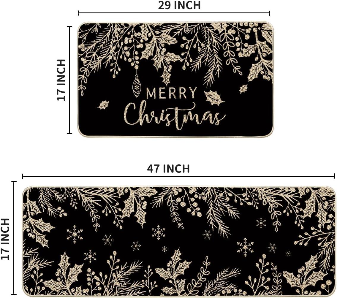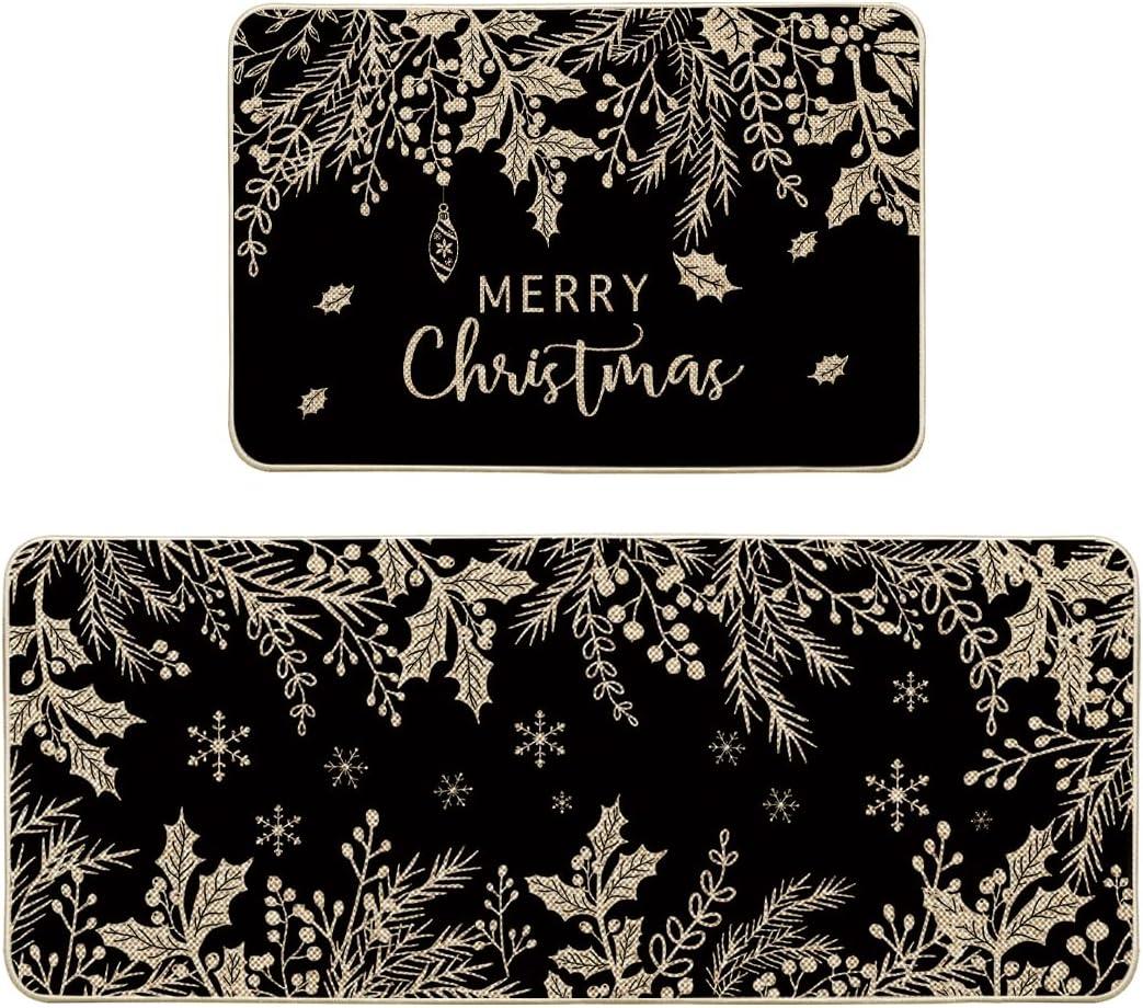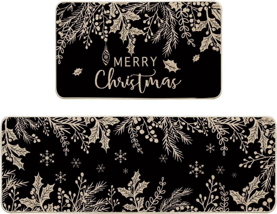 Artoid Mode Black Holly Pine Branches Merry Christmas Kitchen Mats Set of 2, Winter Decor Low-Profile Kitchen Rugs for Floor – 17×29 and 17×47 Inch(Black)