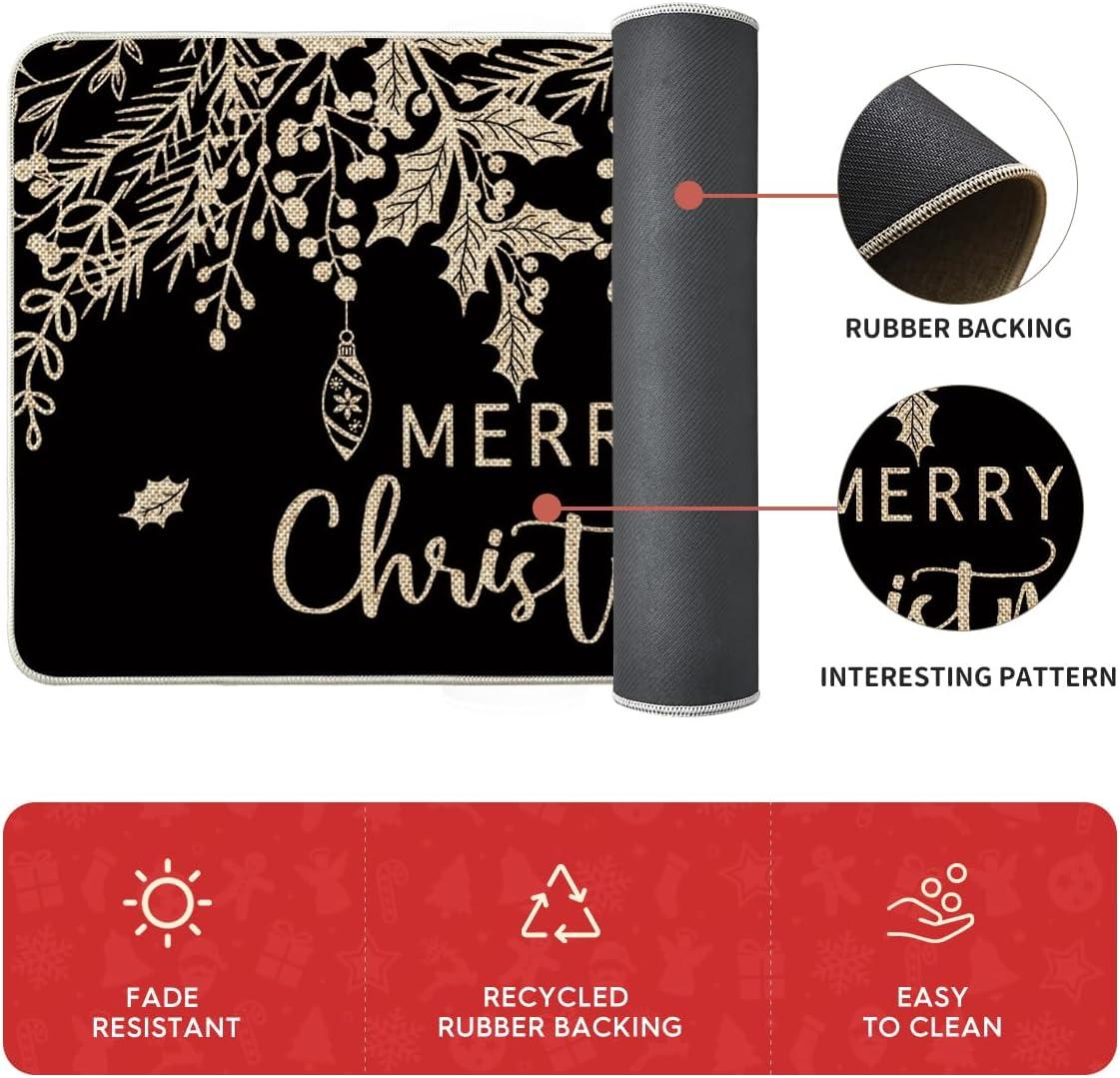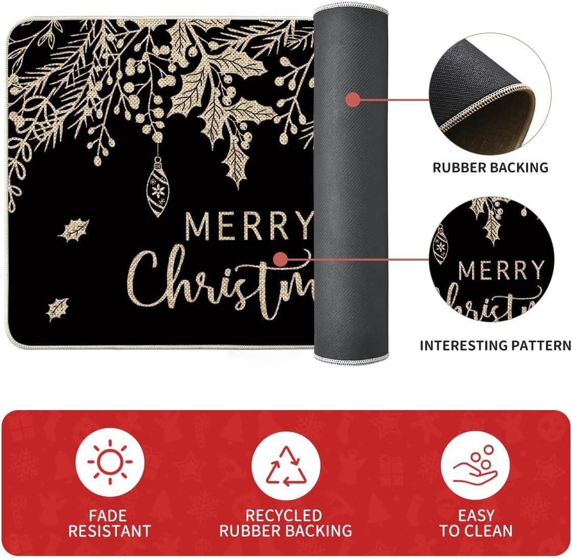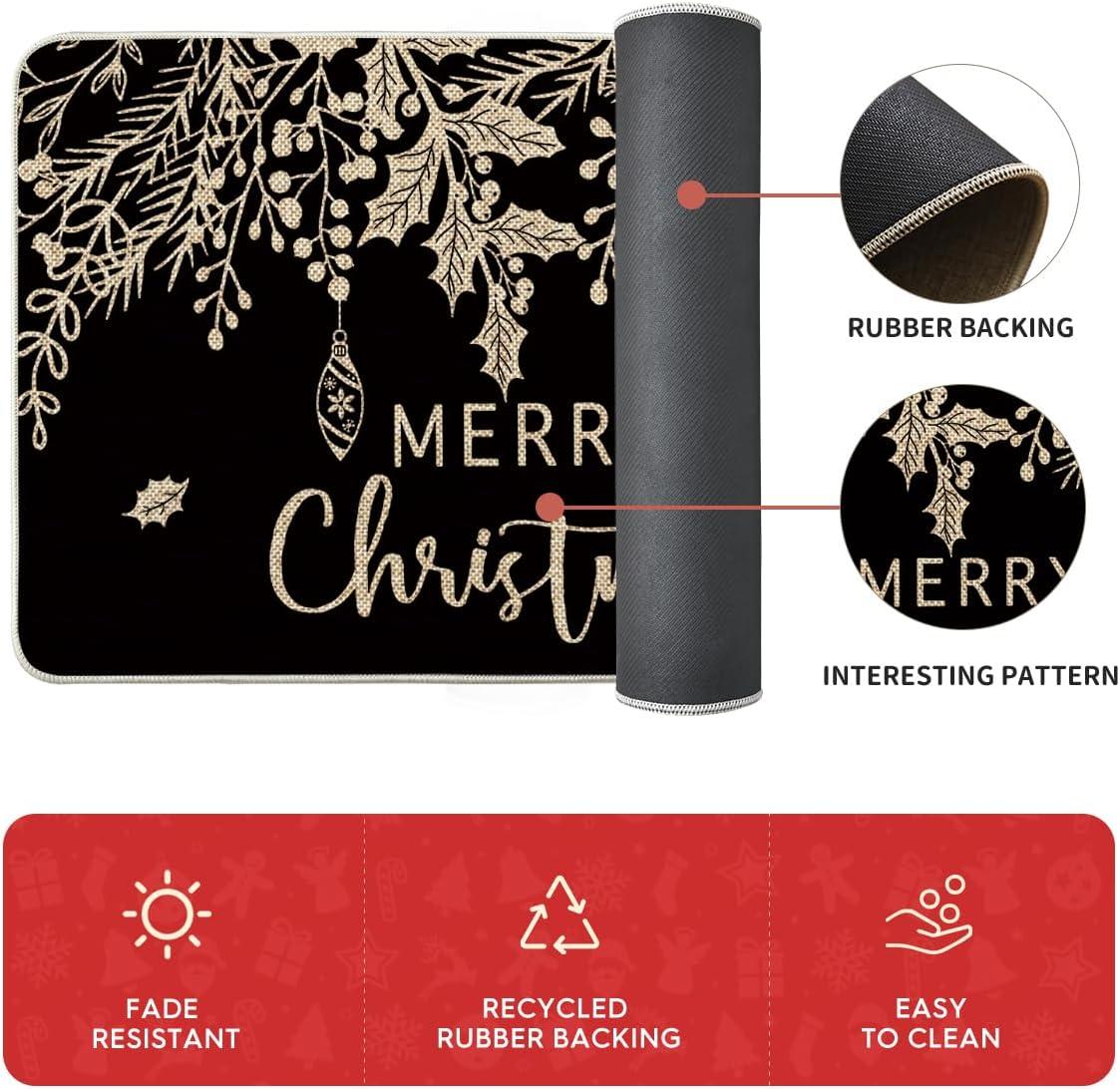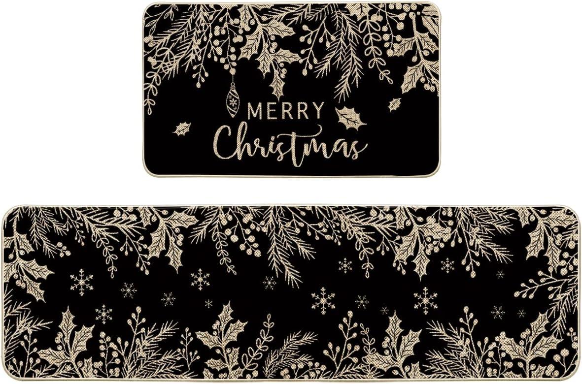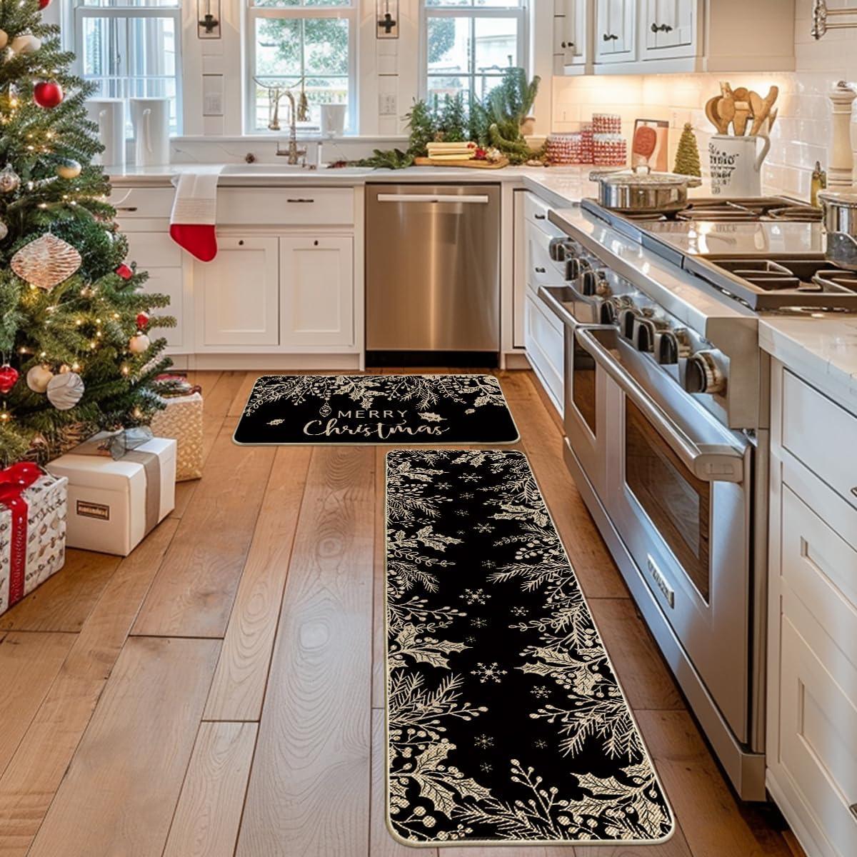 Artoid Mode Black Holly Pine Branches Merry Christmas Kitchen Mats Set of 2, Winter Decor Low-Profile Kitchen Rugs for Floor – 17×29 and 17×47 Inch(Black)