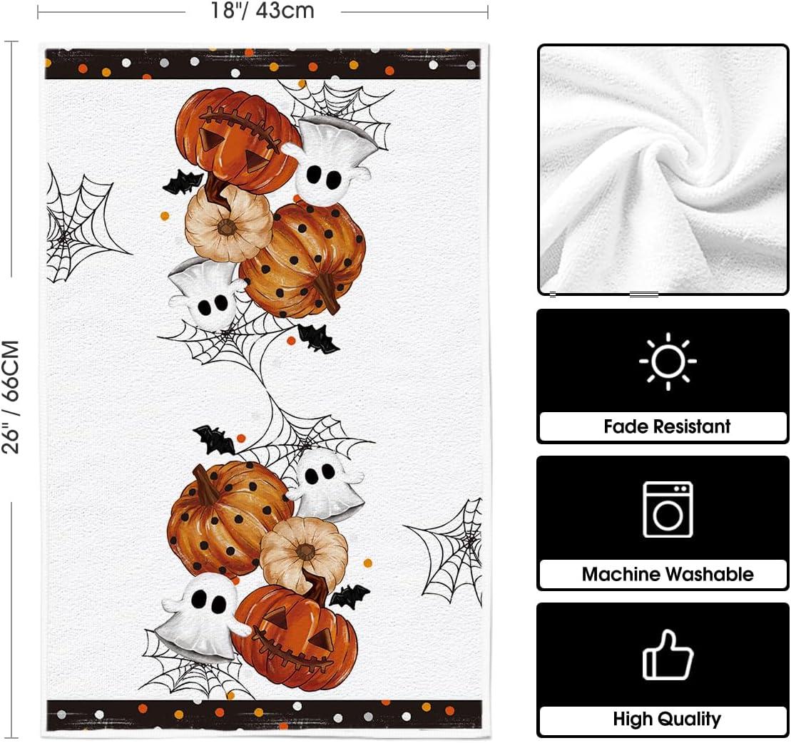 Artoid Mode Black Polka Dot Pumpkin Ghost Halloween Kitchen Towels Dish Towels, 18×26 Inch Farmhouse Bat Cobweb Decoration Hand Towels Set of 4(Black)