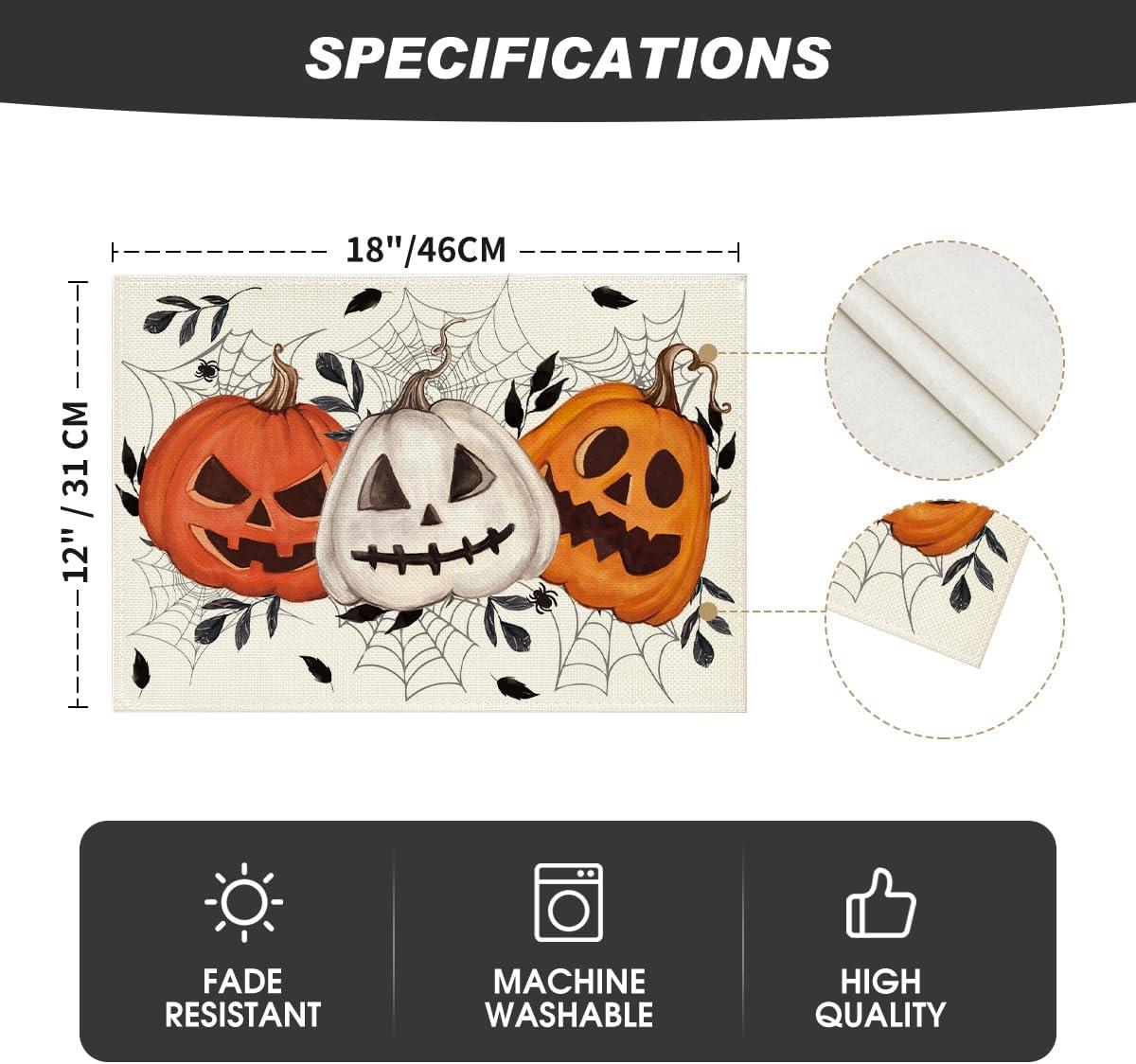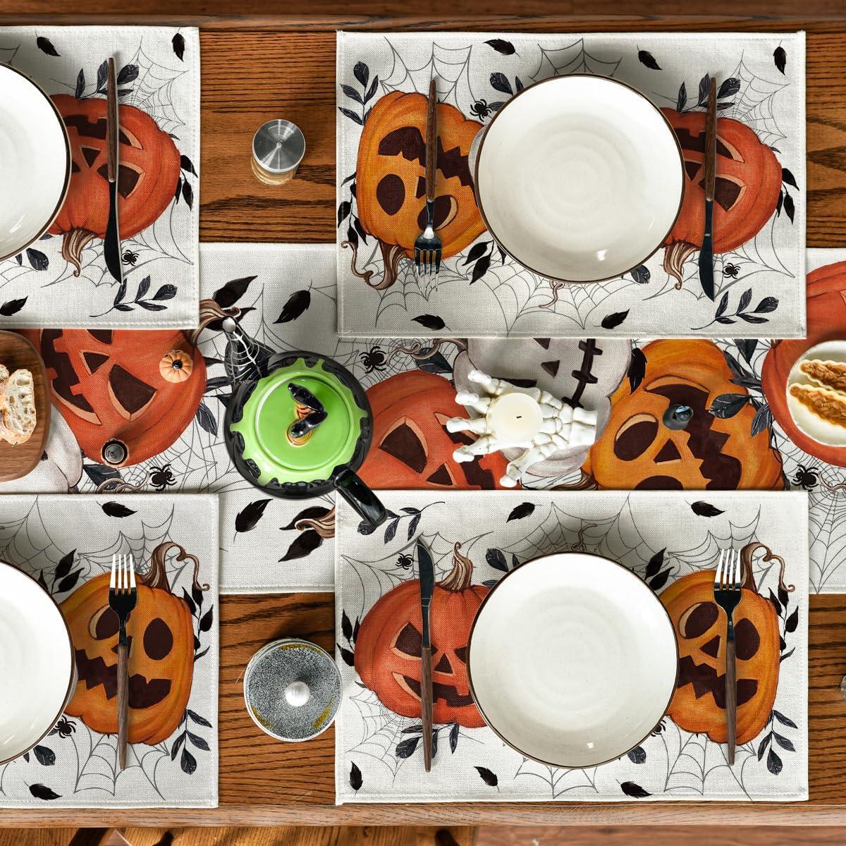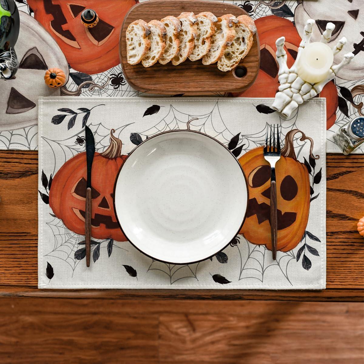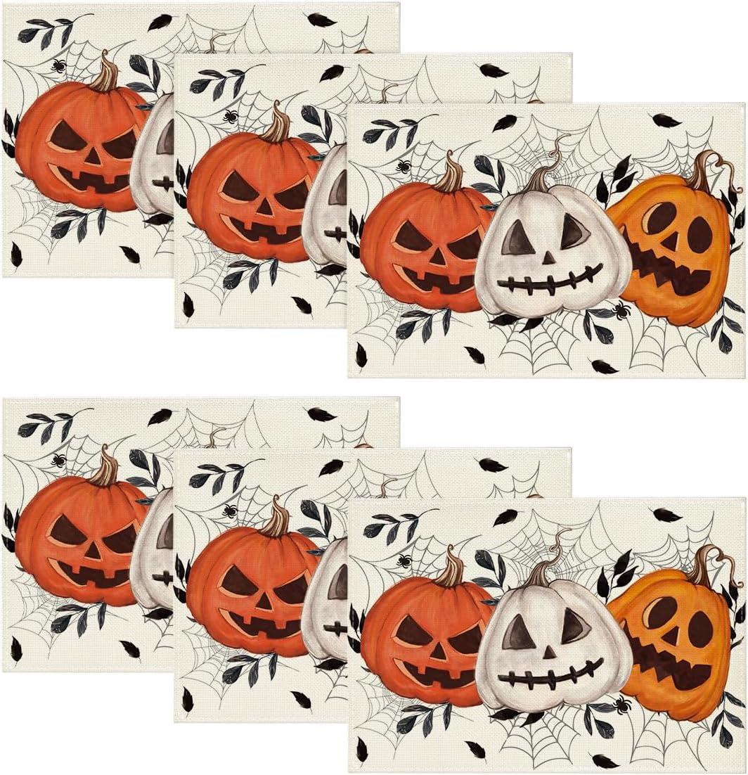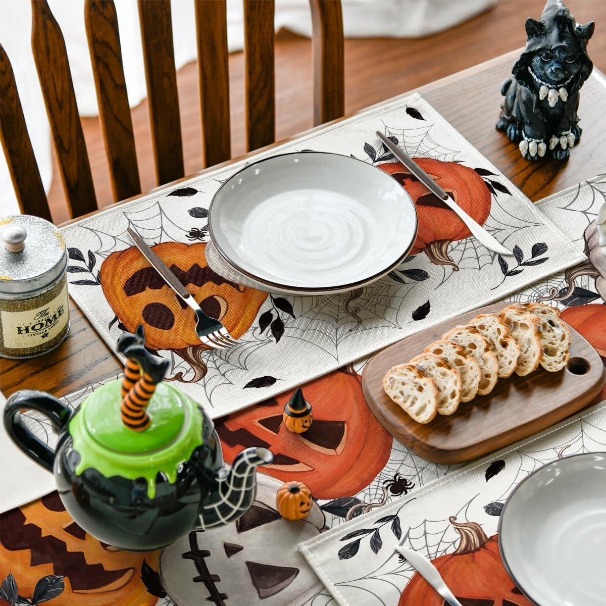 Artoid Mode Black Pumpkins Spider Web Halloween Placemats Set of 6, 12×18 Inch Seasonal Fall Holiday Table Mats for Party Kitchen Dining Decoration(Beige)