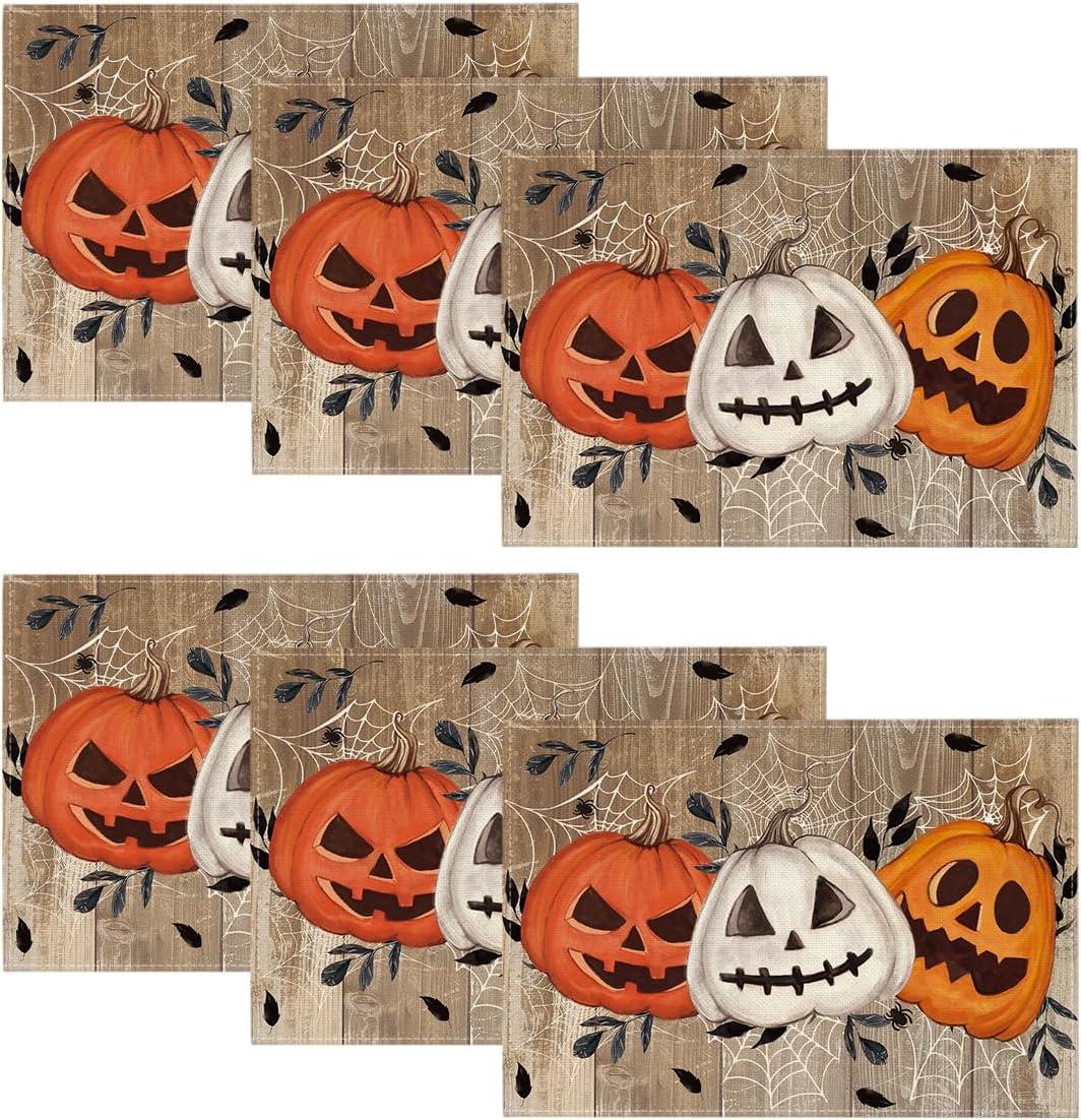 Artoid Mode Black Pumpkins Spider Web Halloween Placemats Set of 6, 12×18 Inch Seasonal Fall Holiday Table Mats for Party Kitchen Dining Decoration(Wood)