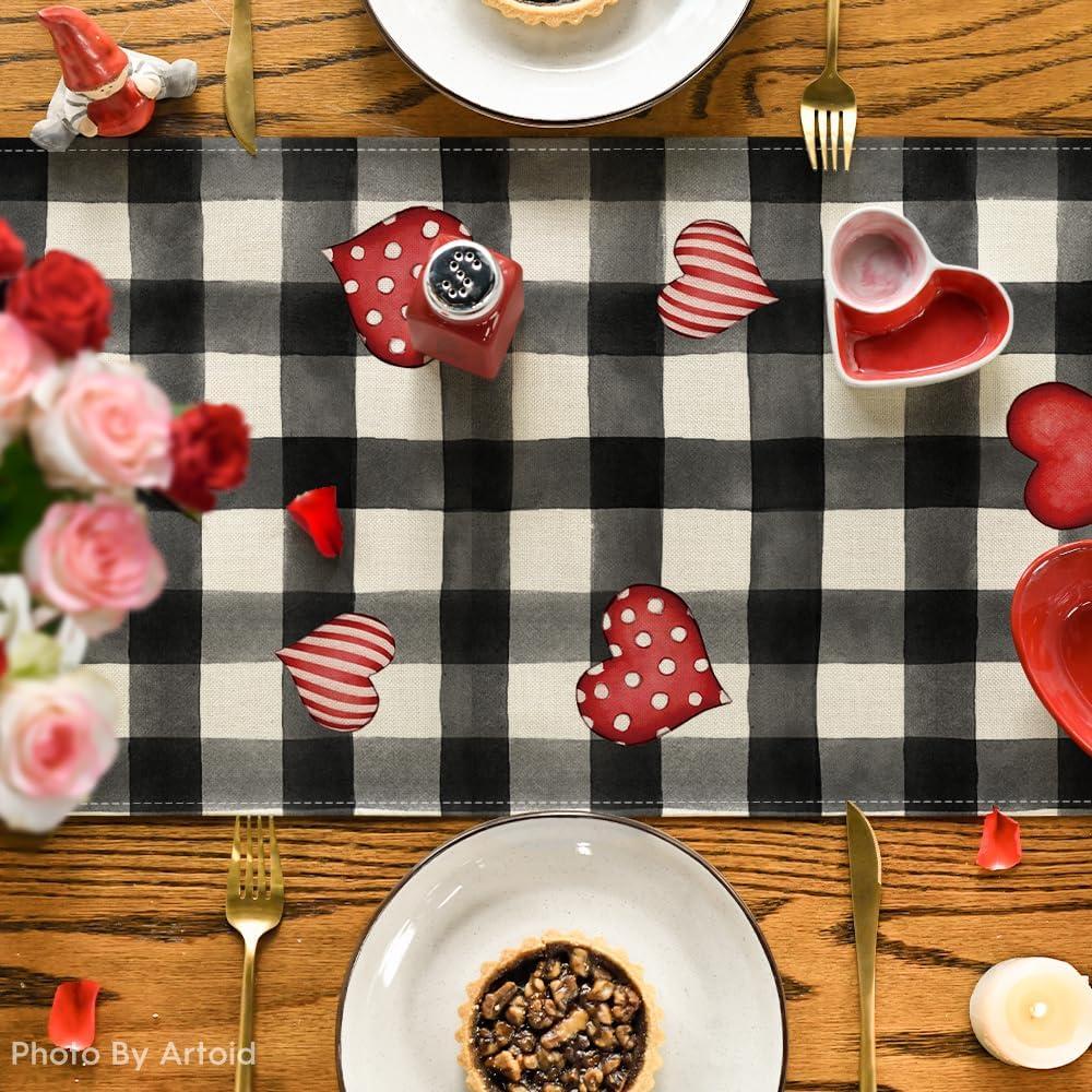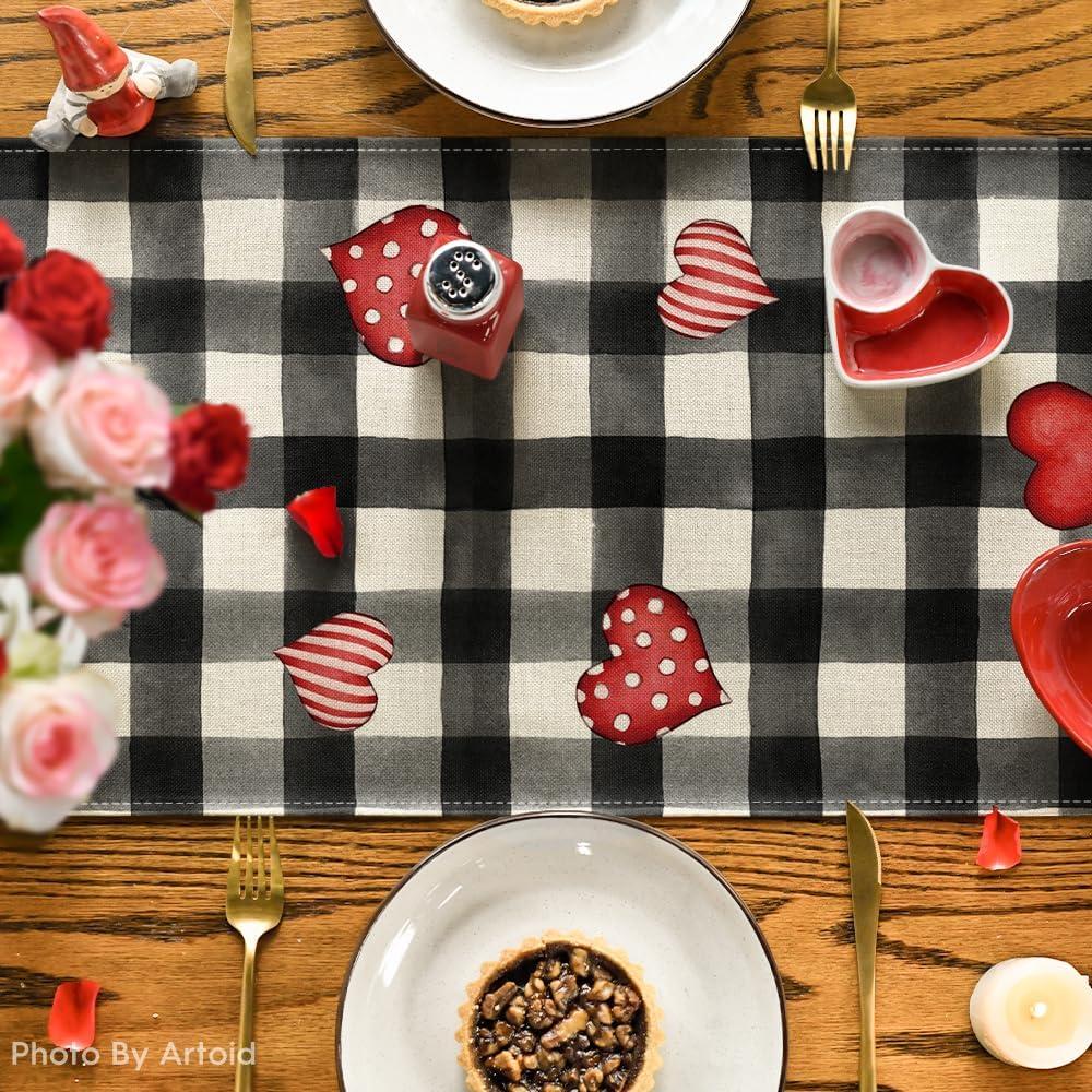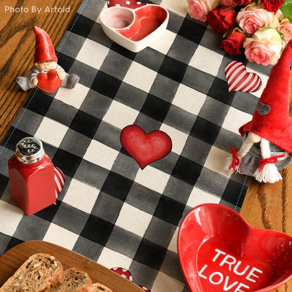 Artoid Mode Black Red Buffalo Plaid Hearts Truck Love Valentine’s Day Table Runner, Kitchen Dining Table Decoration for Home Party Decor 13×72 Inch(Black/White)