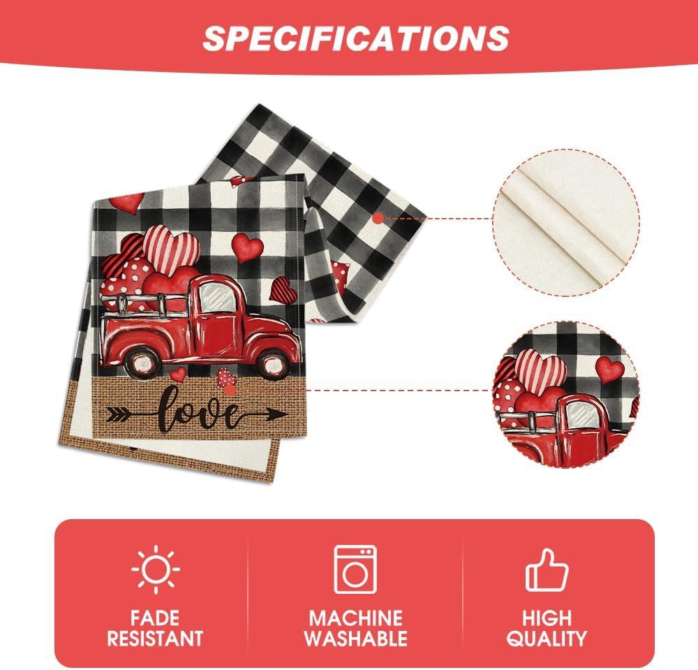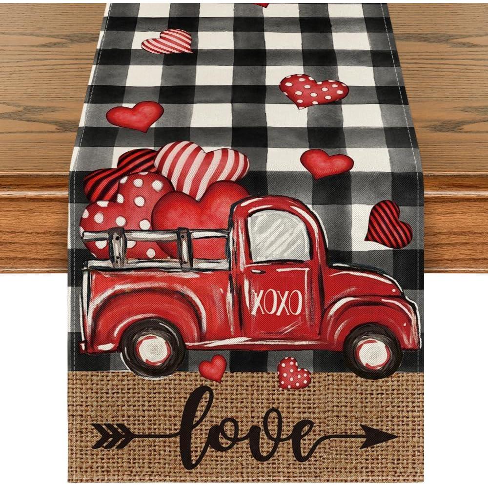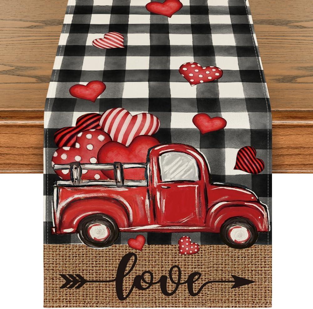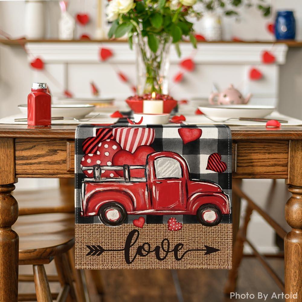 Artoid Mode Black Red Buffalo Plaid Hearts Truck Love Valentine’s Day Table Runner, Kitchen Dining Table Decoration for Home Party Decor 13×72 Inch(Black/White)
