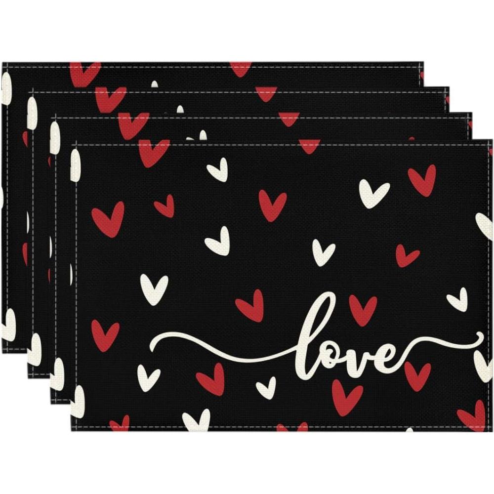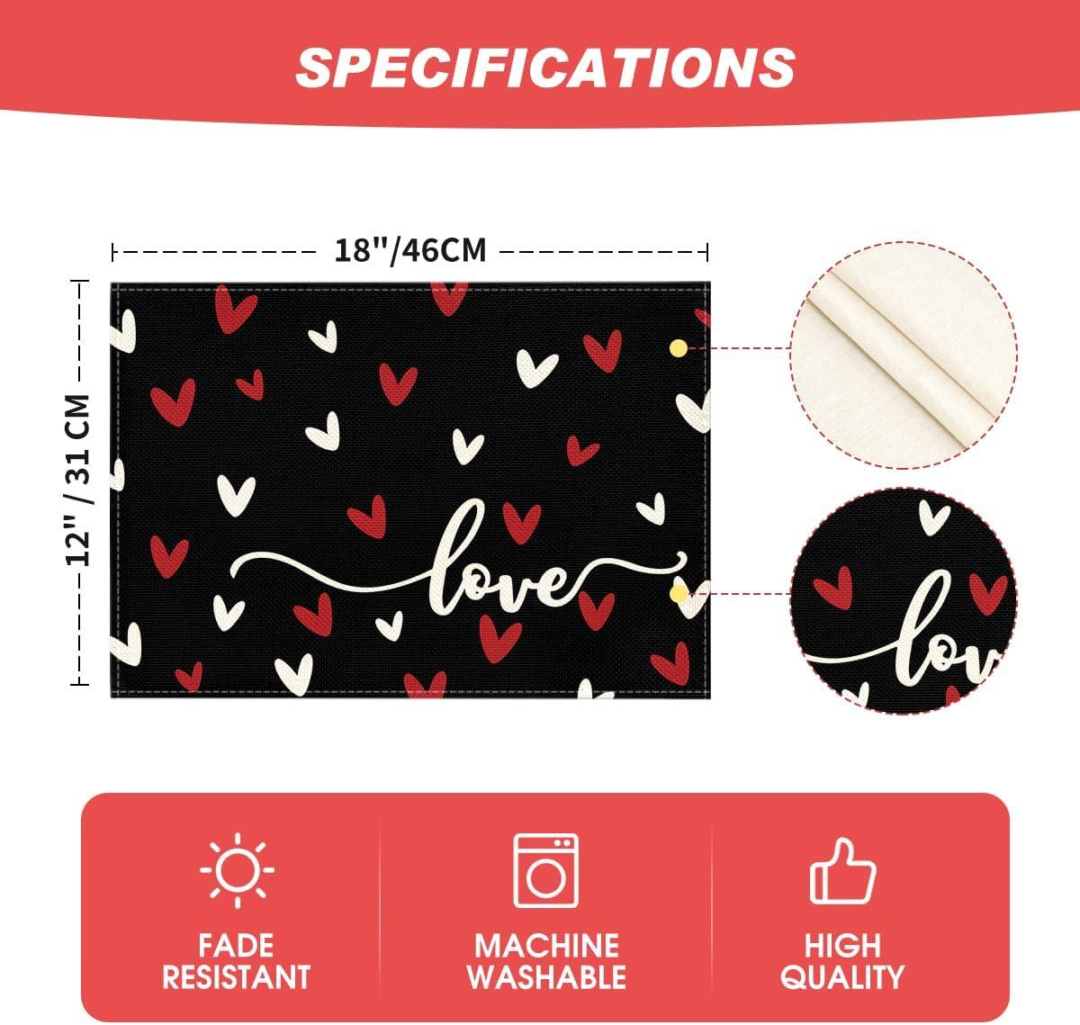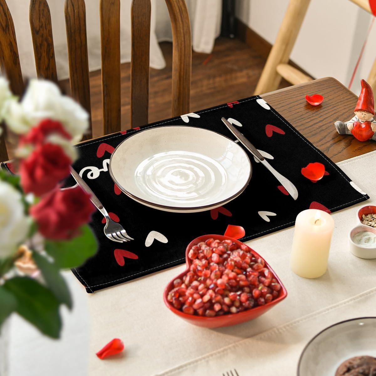 Artoid Mode Black Red Buffalo Plaid Love Valentine Placemats Set of 4, 12×18 Inch Seasonal Anniversary Holiday Table Mats for Party Kitchen Dining Decoration(Black)