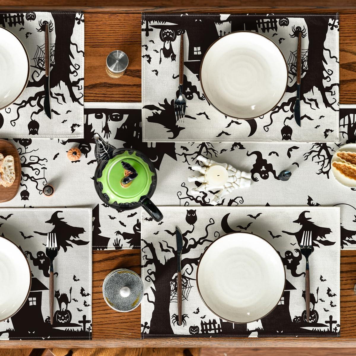 Artoid Mode Black White Spooky Haunted House Tree Ghost Witch Halloween Placemats Set of 4, 12×18 Inch Seasonal Fall Holiday Table Mats for Party Kitchen Dining Decoration(Beige)