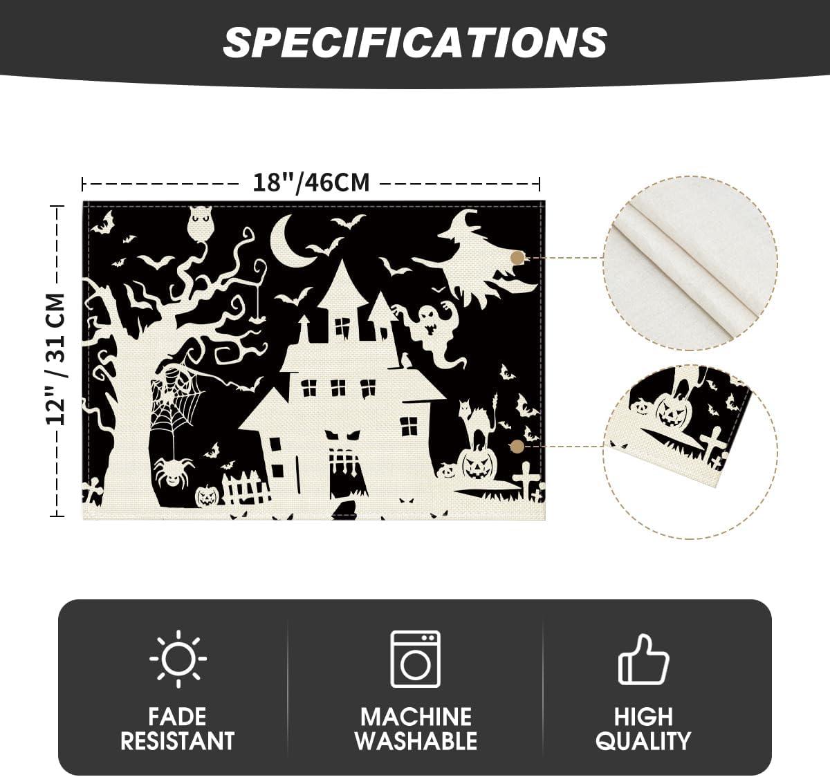 Artoid Mode Black White Spooky Haunted House Tree Ghost Witch Halloween Placemats Set of 4, 12×18 Inch Seasonal Fall Holiday Table Mats for Party Kitchen Dining Decoration(Black)