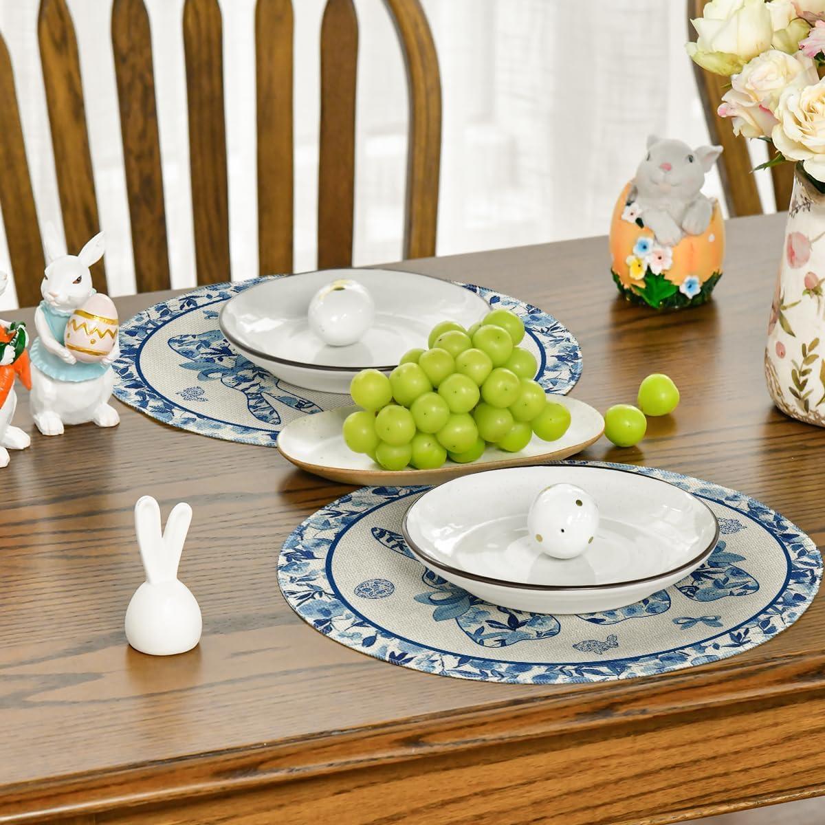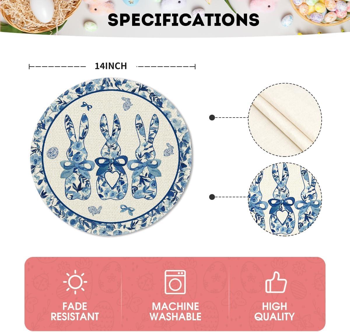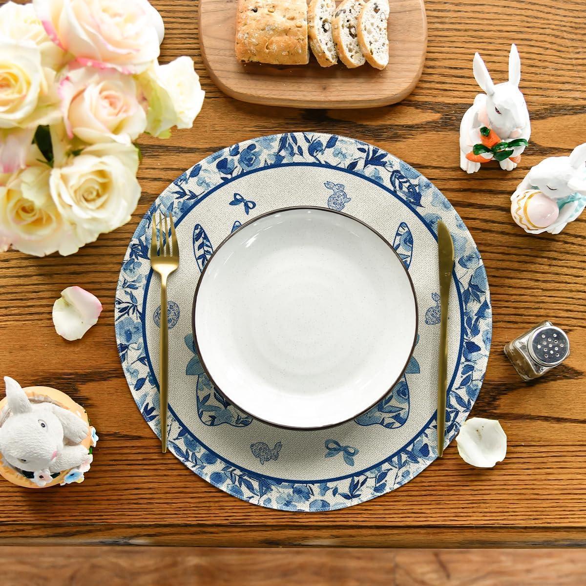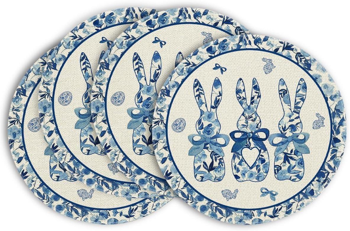 Artoid Mode Blue and White Porcelain Bunny Rabbit Easter Placemats Set of 4, 14 Inch Spring Round Table Mats for Party Kitchen Dining Decoration(Blue)
