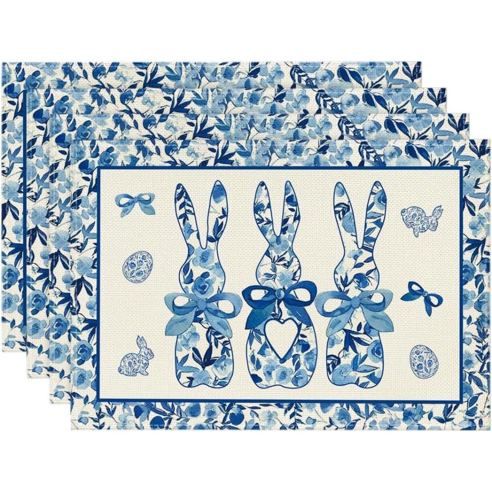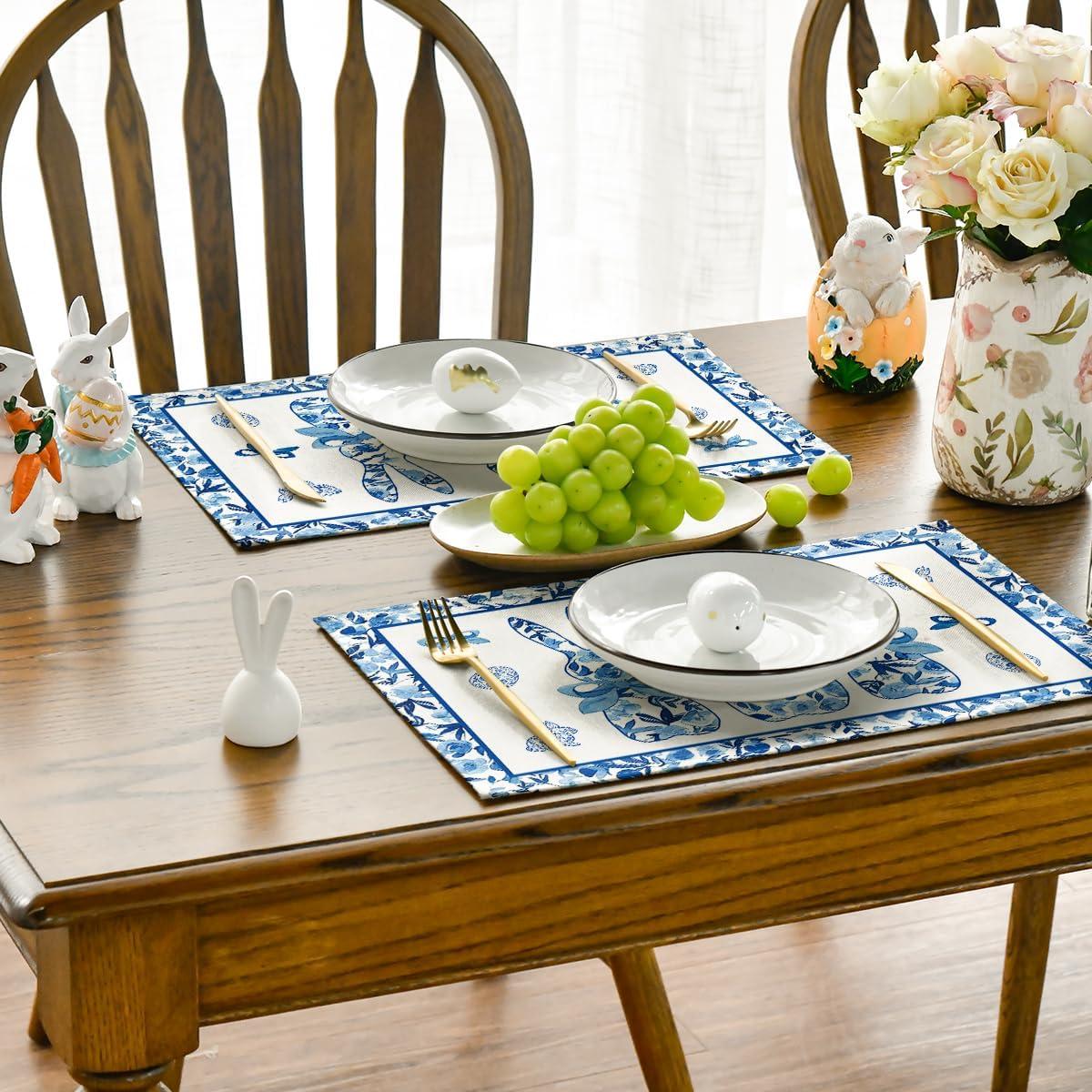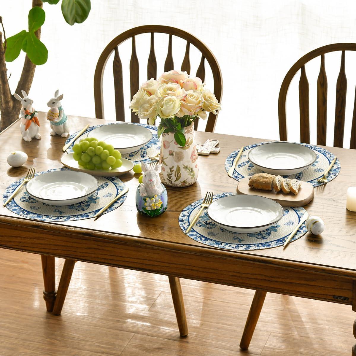 Artoid Mode Blue and White Porcelain Bunny Rabbit Easter Placemats Set of 4, 14 Inch Spring Round Table Mats for Party Kitchen Dining Decoration(Blue)