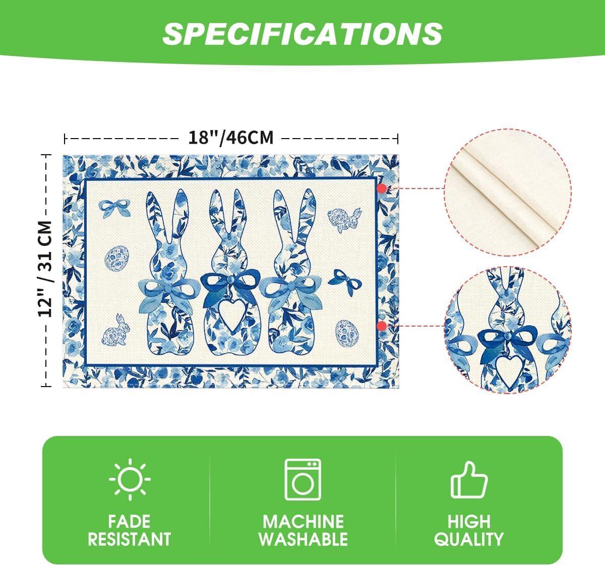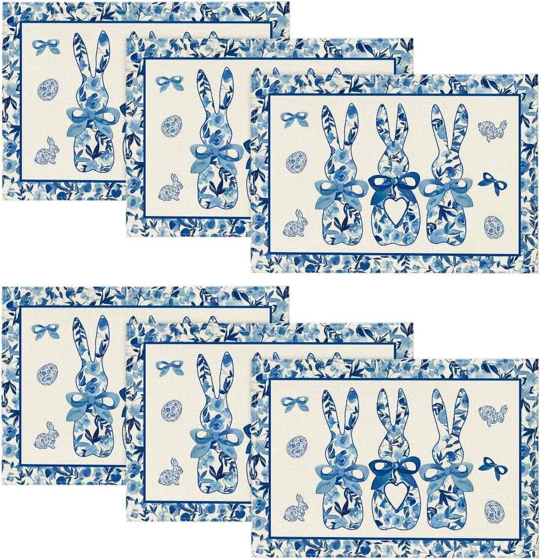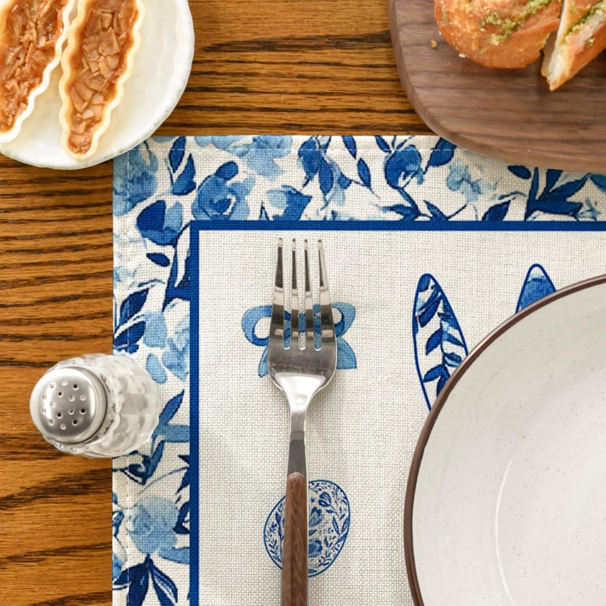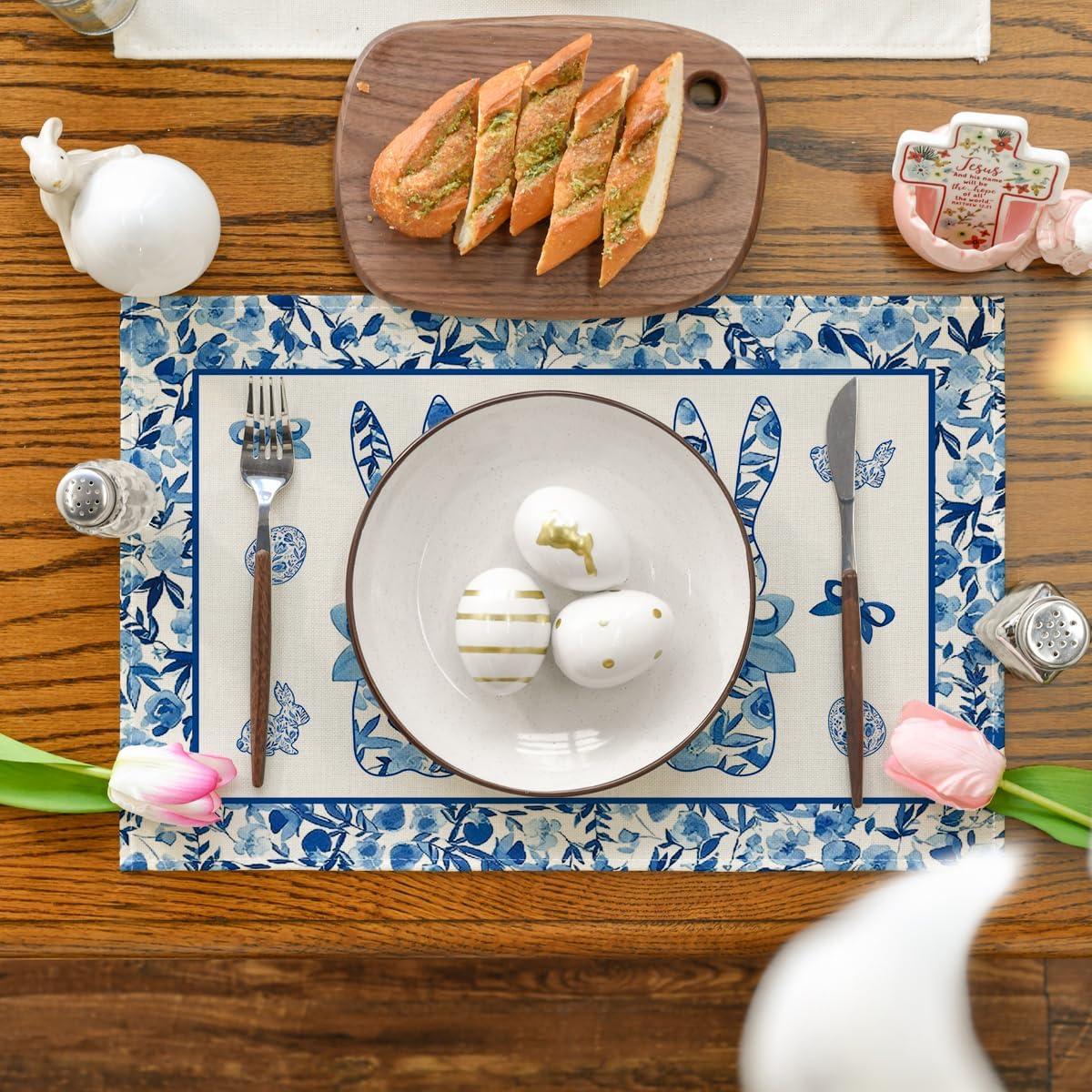 Artoid Mode Blue and White Porcelain Bunny Rabbit Easter Placemats Set of 4, 14 Inch Spring Round Table Mats for Party Kitchen Dining Decoration(Blue)