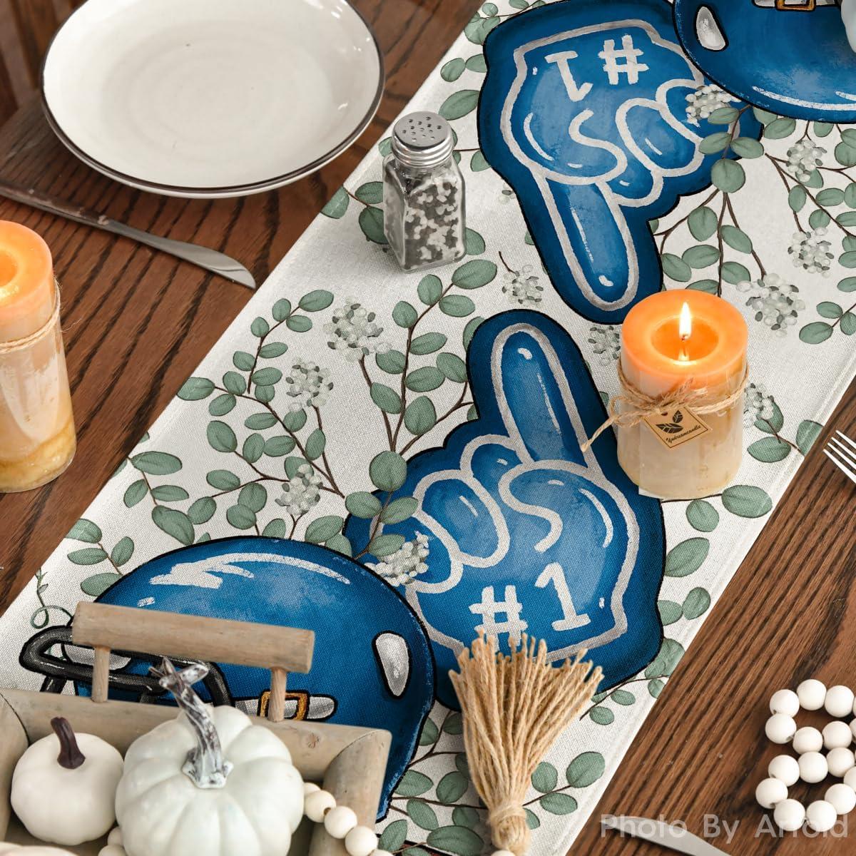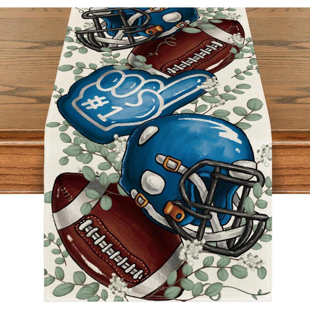 Artoid Mode Blue Helmet Finger Eucalyptus Football Fall Table Runner, Seasonal Rugby Sport Kitchen Dining Table Decoration for Home Party Decor 13×72 Inch(Blue/Beige)