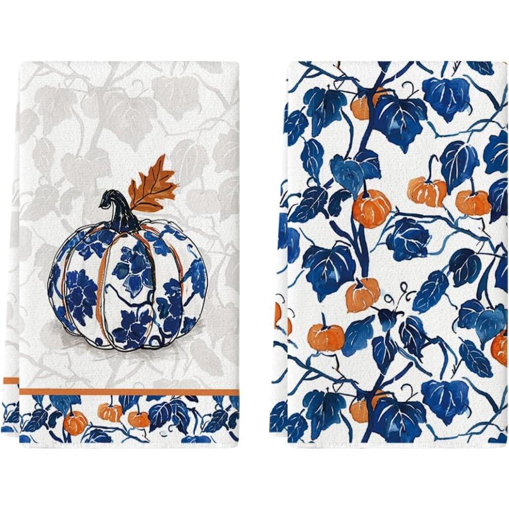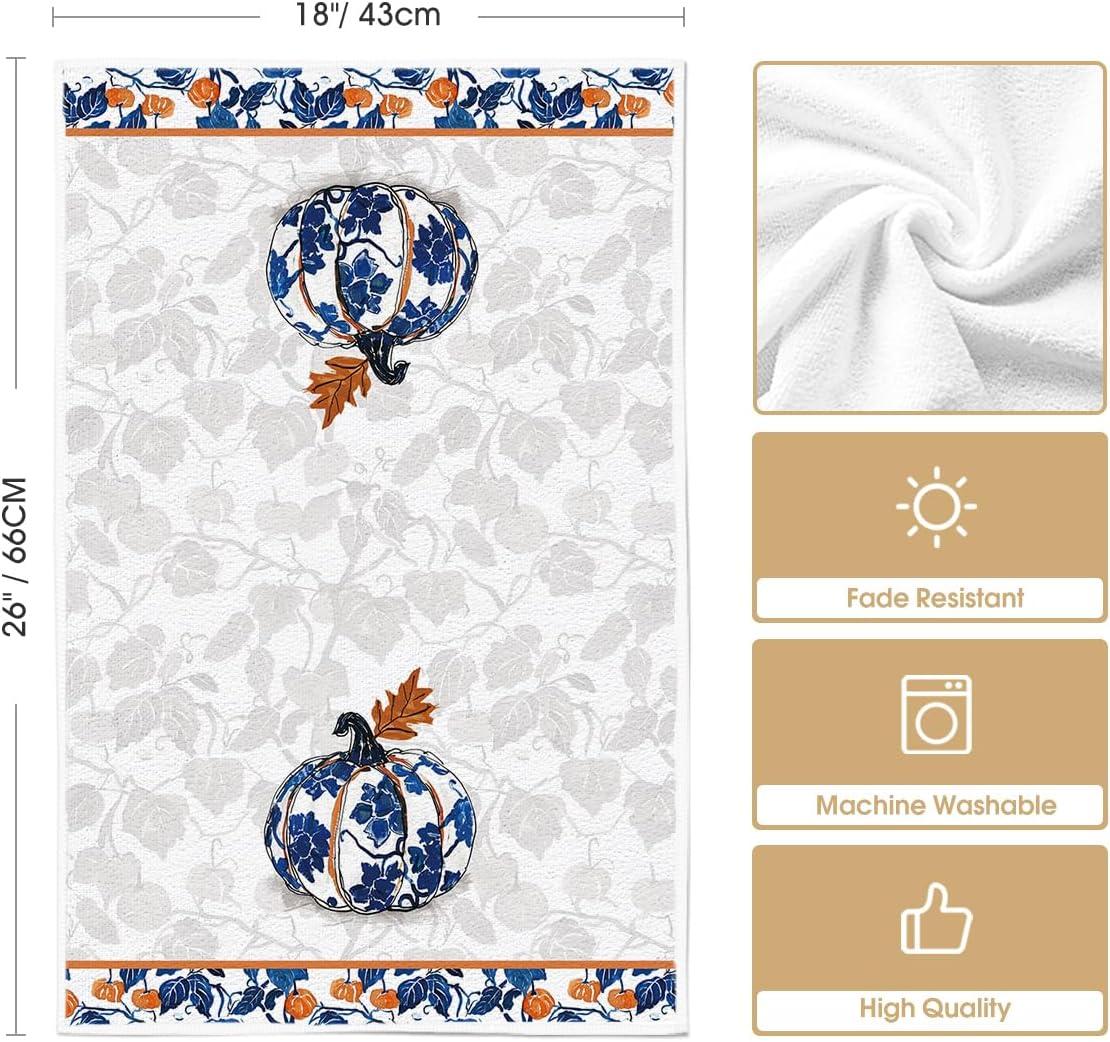 Artoid Mode Blue Pumpkin Fall Kitchen Towels Dish Towels, 18×26 Inch Autumn Floral Leaves Thanksgiving Decoration Hand Towels Set of 2