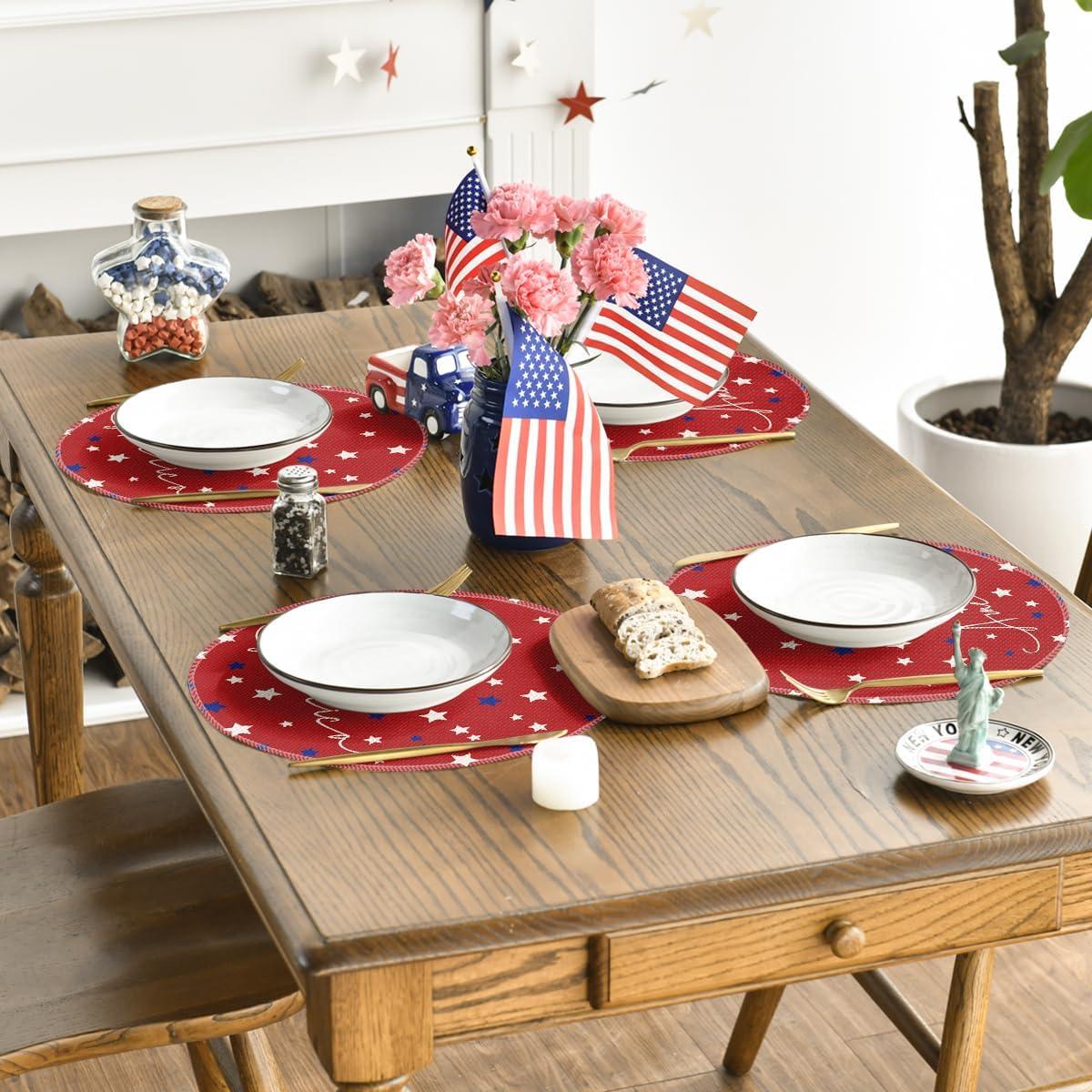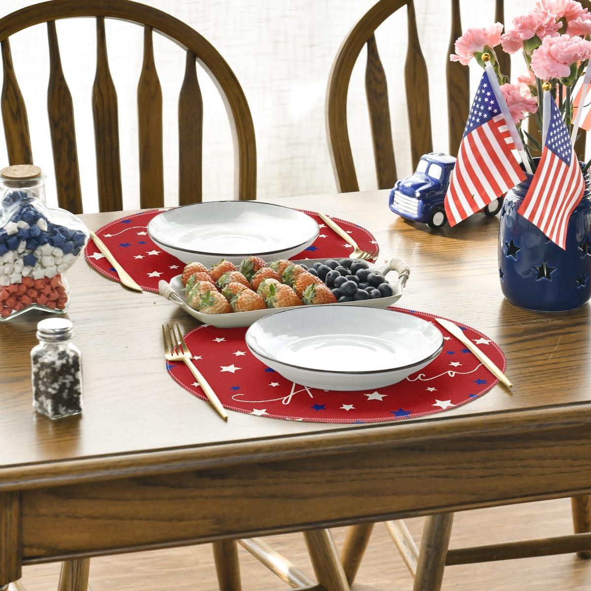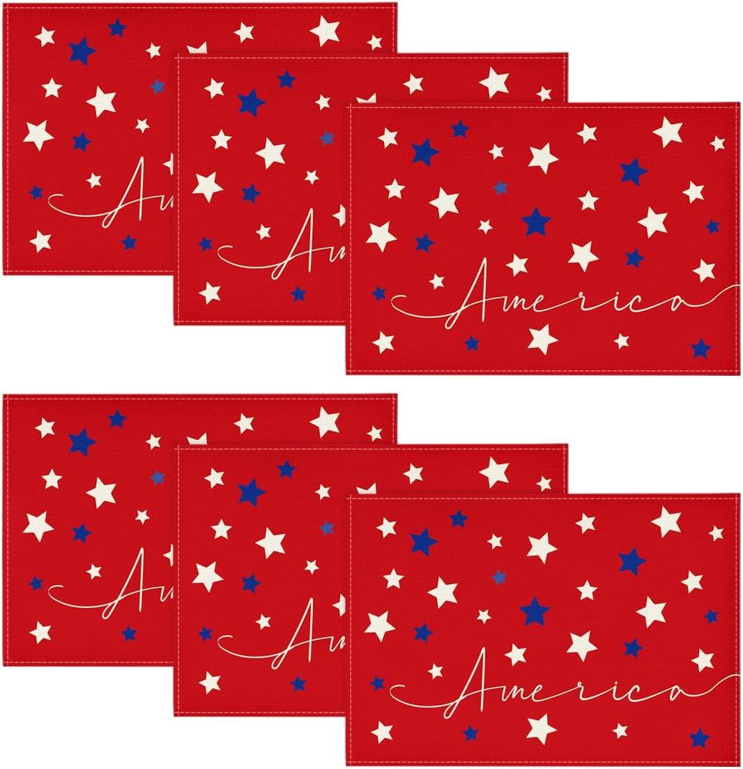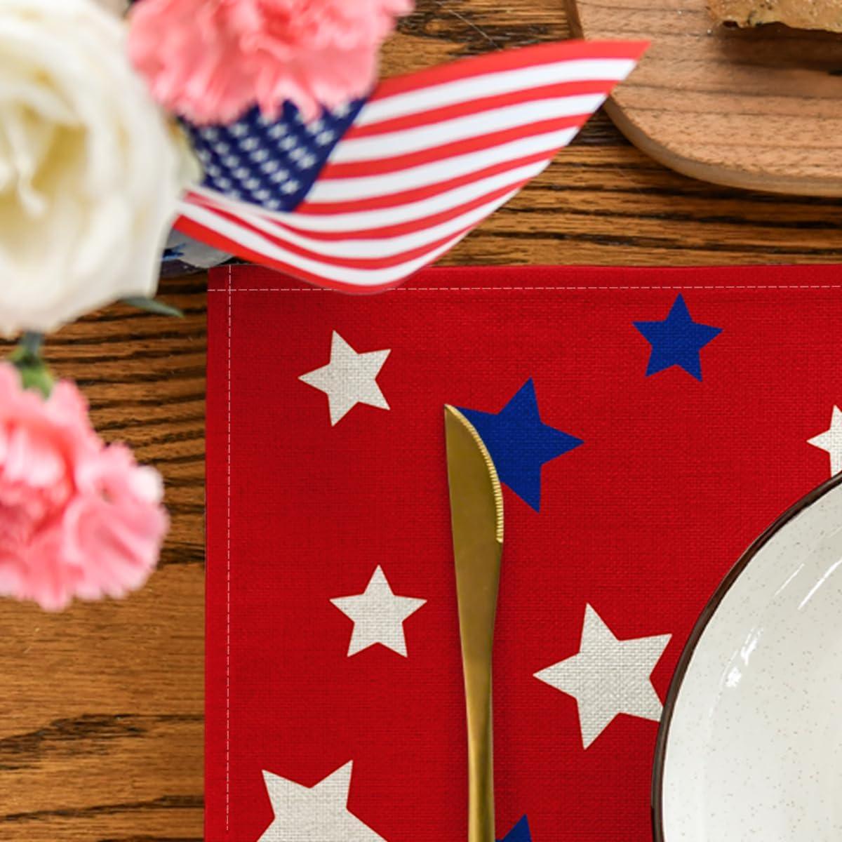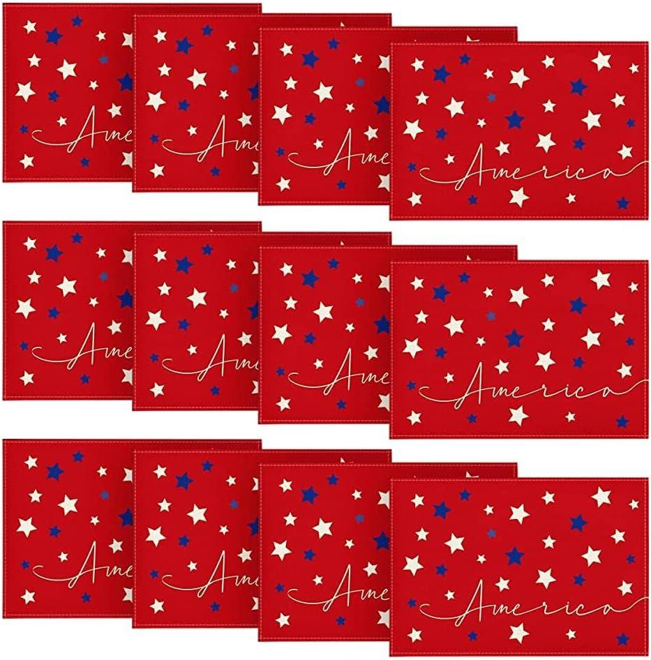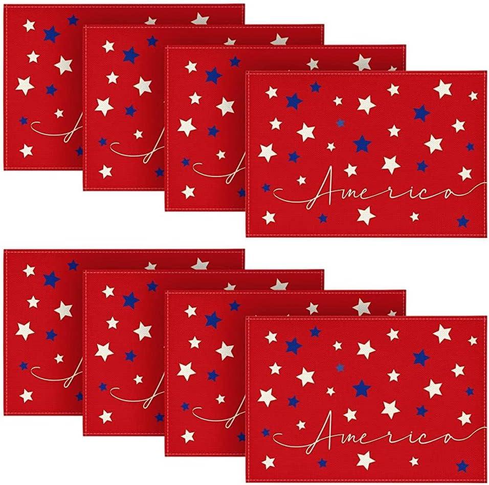 Artoid Mode Blue Red White Stars America 4th of July Patriotic Placemats for Dining Table, 12 x 18 Inch Summer Memorial Day Seasonal Holiday Rustic Vintage Washable Table Mats Set of 4(Red)