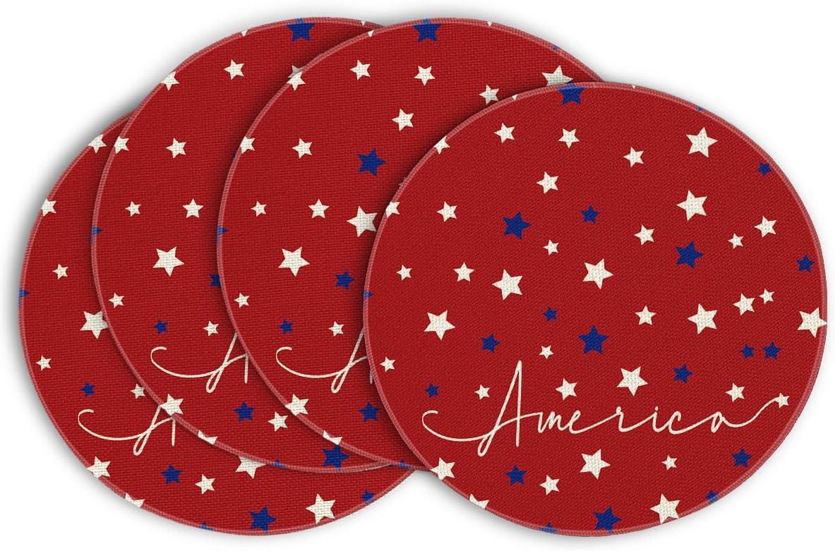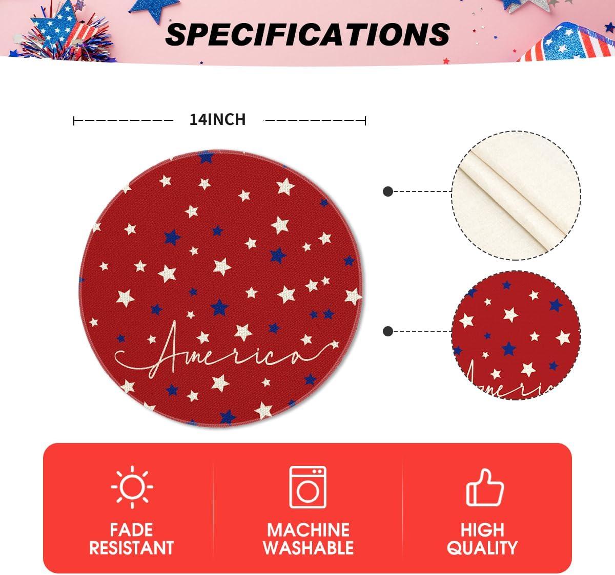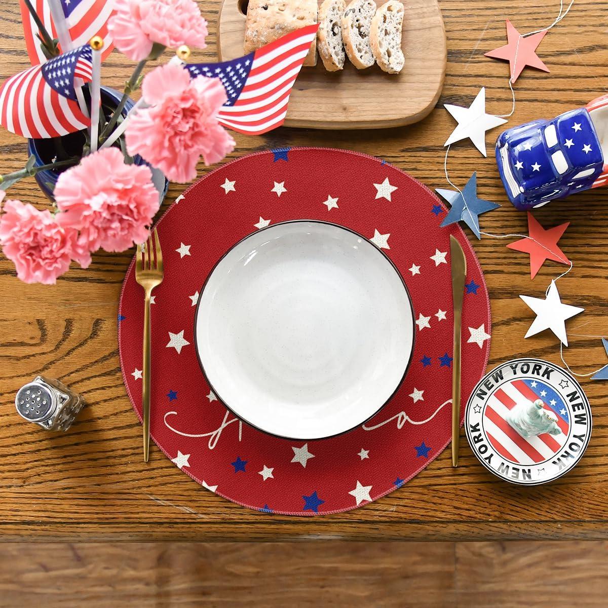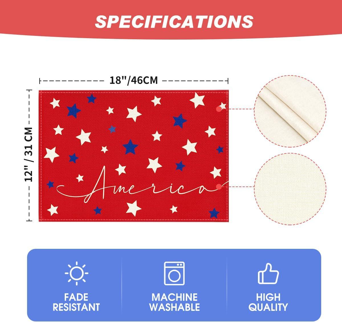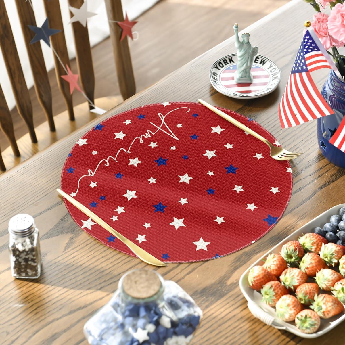 Artoid Mode Blue Red White Stars America 4th of July Patriotic Placemats for Dining Table, 12 x 18 Inch Summer Memorial Day Seasonal Holiday Rustic Vintage Washable Table Mats Set of 4(Red)