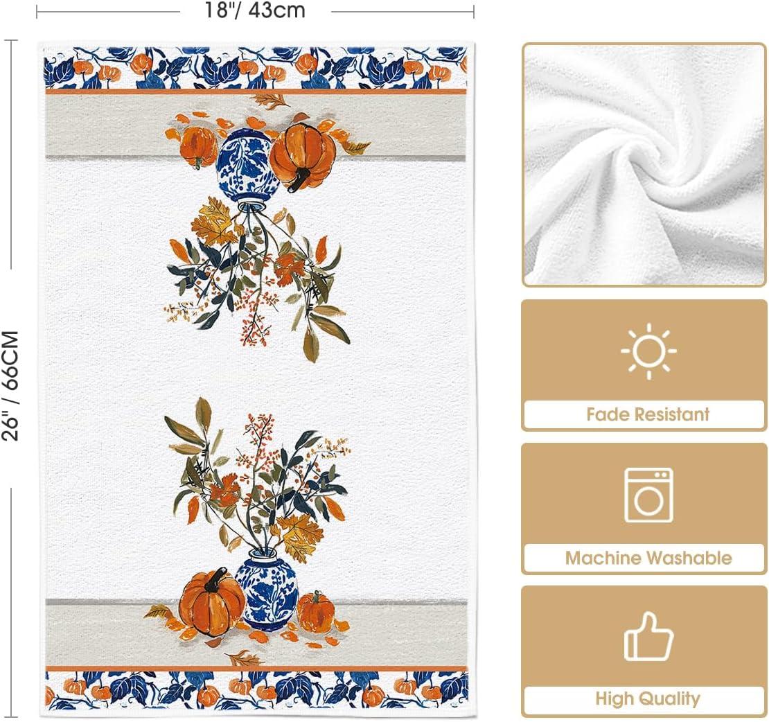 Artoid Mode Blue Vase Pumpkin Fall Kitchen Towels Dish Towels, 18×26 Inch Farmhouse Leaves Autumn Decoration Hand Towels Set of 2