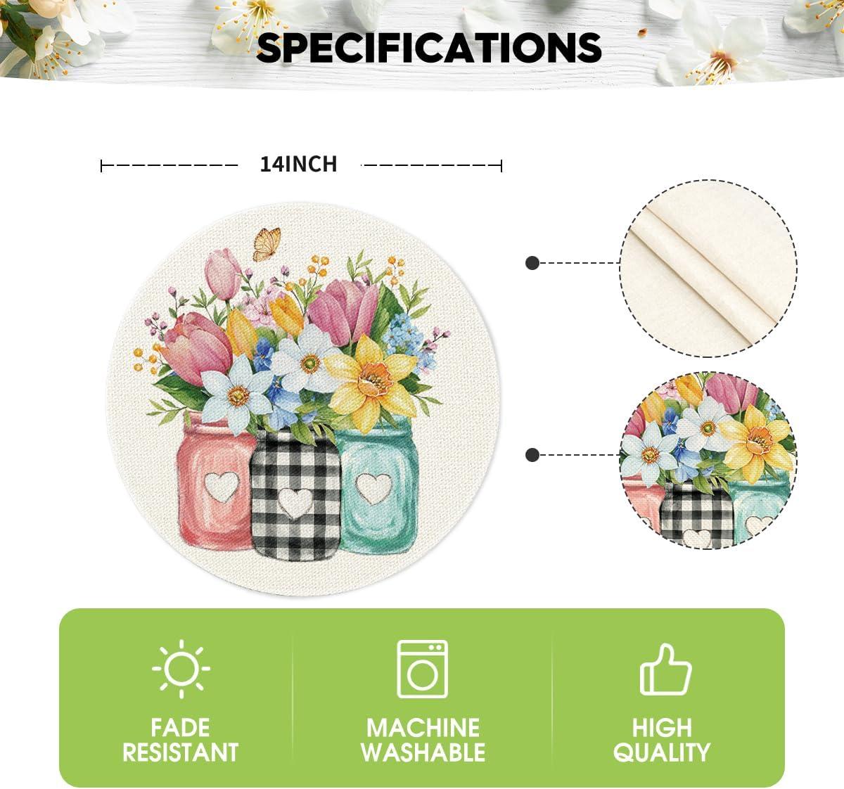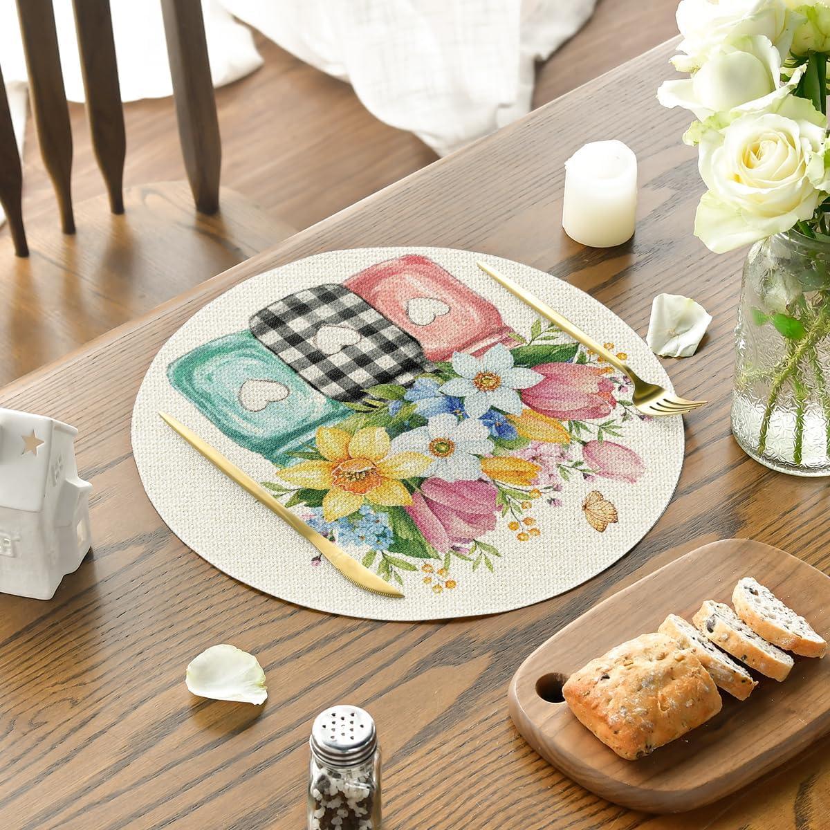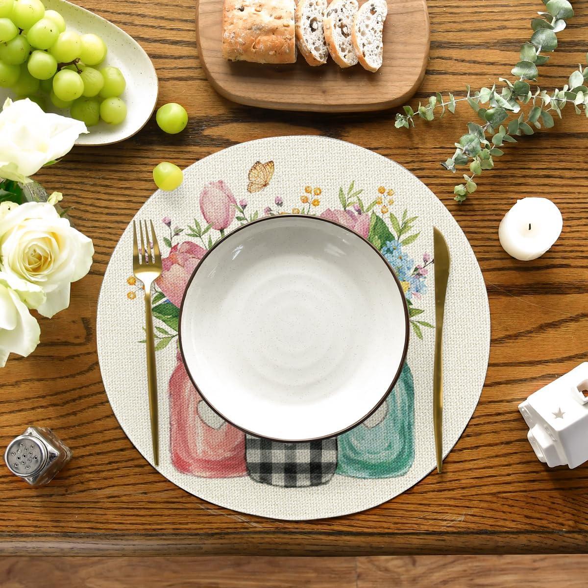 Artoid Mode Bottle Wild Flowers Butterfly Round Spring Placemats Set of 4, 14 Inch Summer Round Table Mats for Dining Decoration(Beige)
