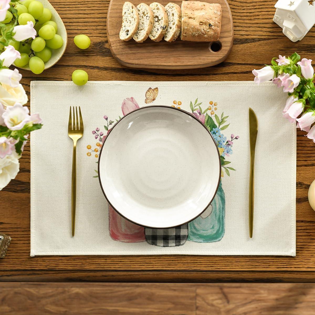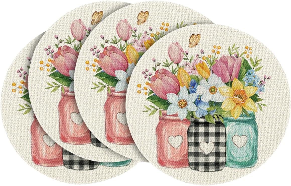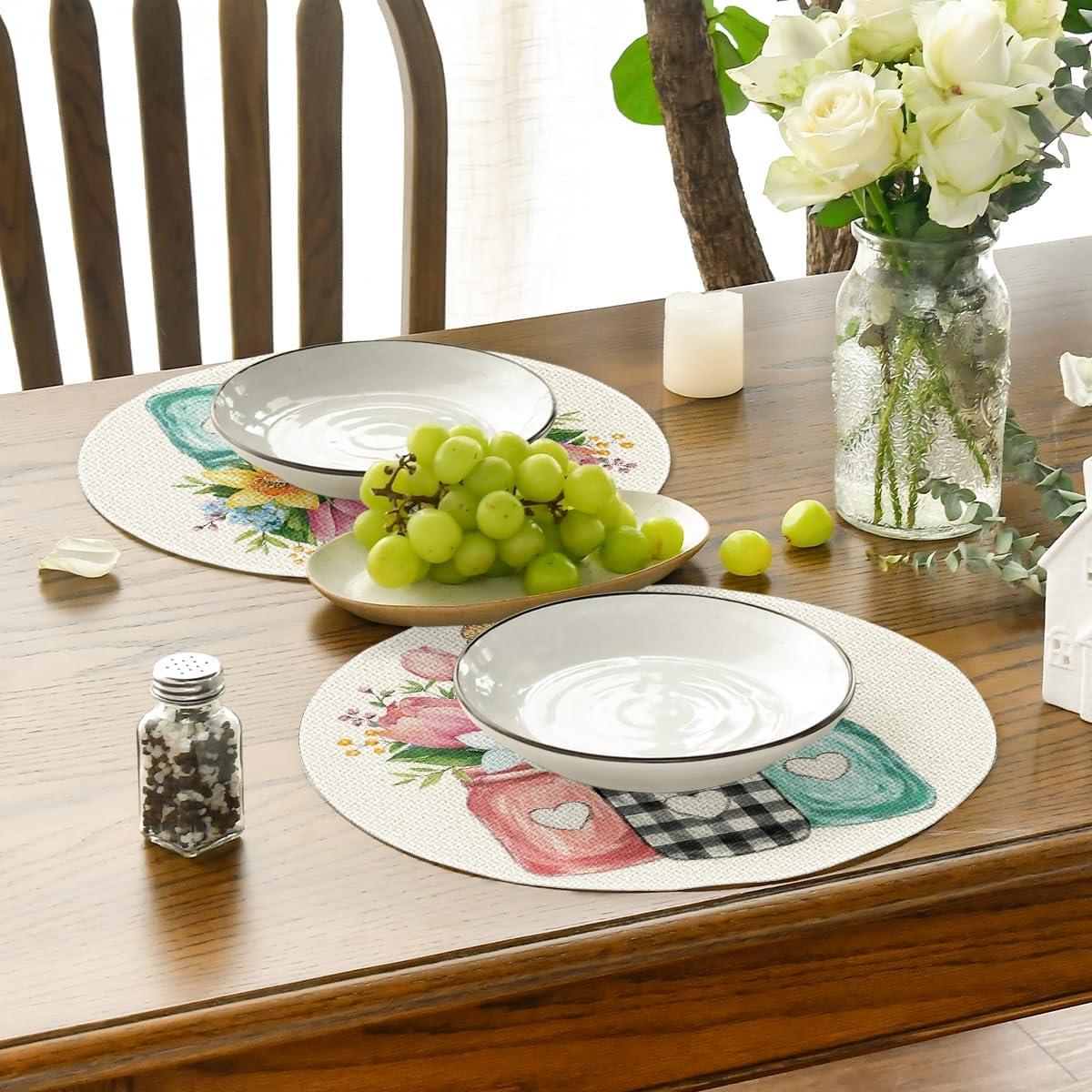 Artoid Mode Bottle Wild Flowers Butterfly Round Spring Placemats Set of 4, 14 Inch Summer Round Table Mats for Dining Decoration(Beige)