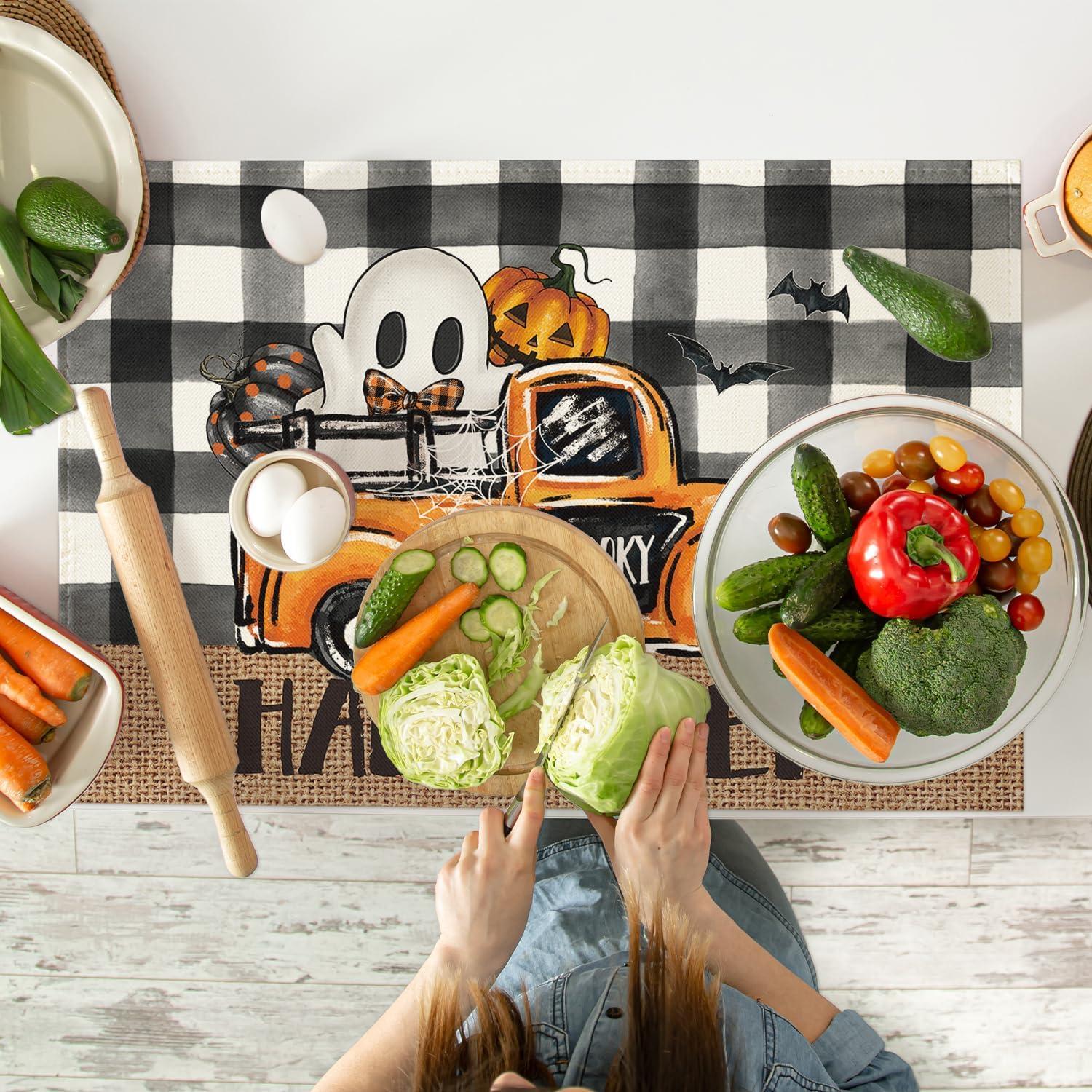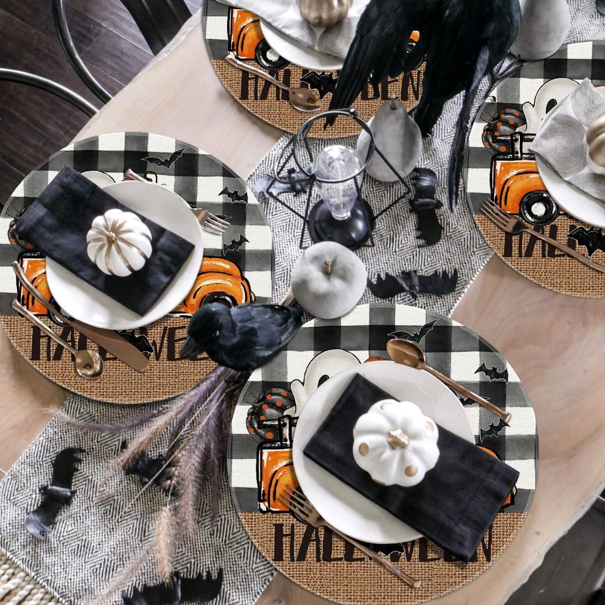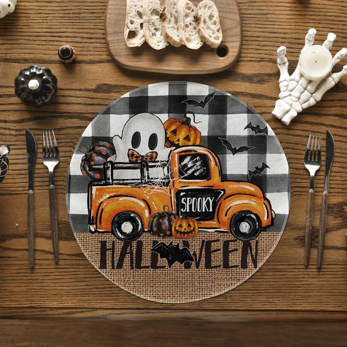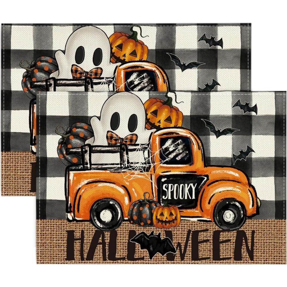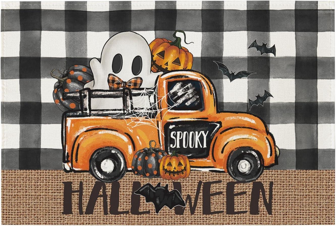 Artoid Mode Buffalo Plaid Bat Ghost Truck Spooky Halloween Placemats Set of 4, 12×18 Inch Seasonal Table Mats for Party Kitchen Dining Decoration(Black/Beige)
