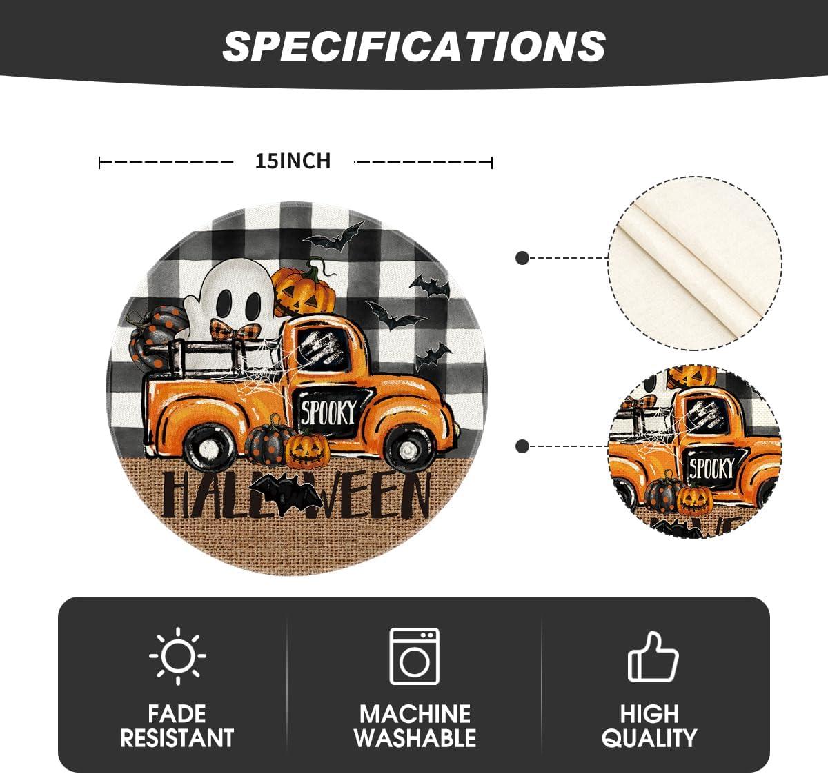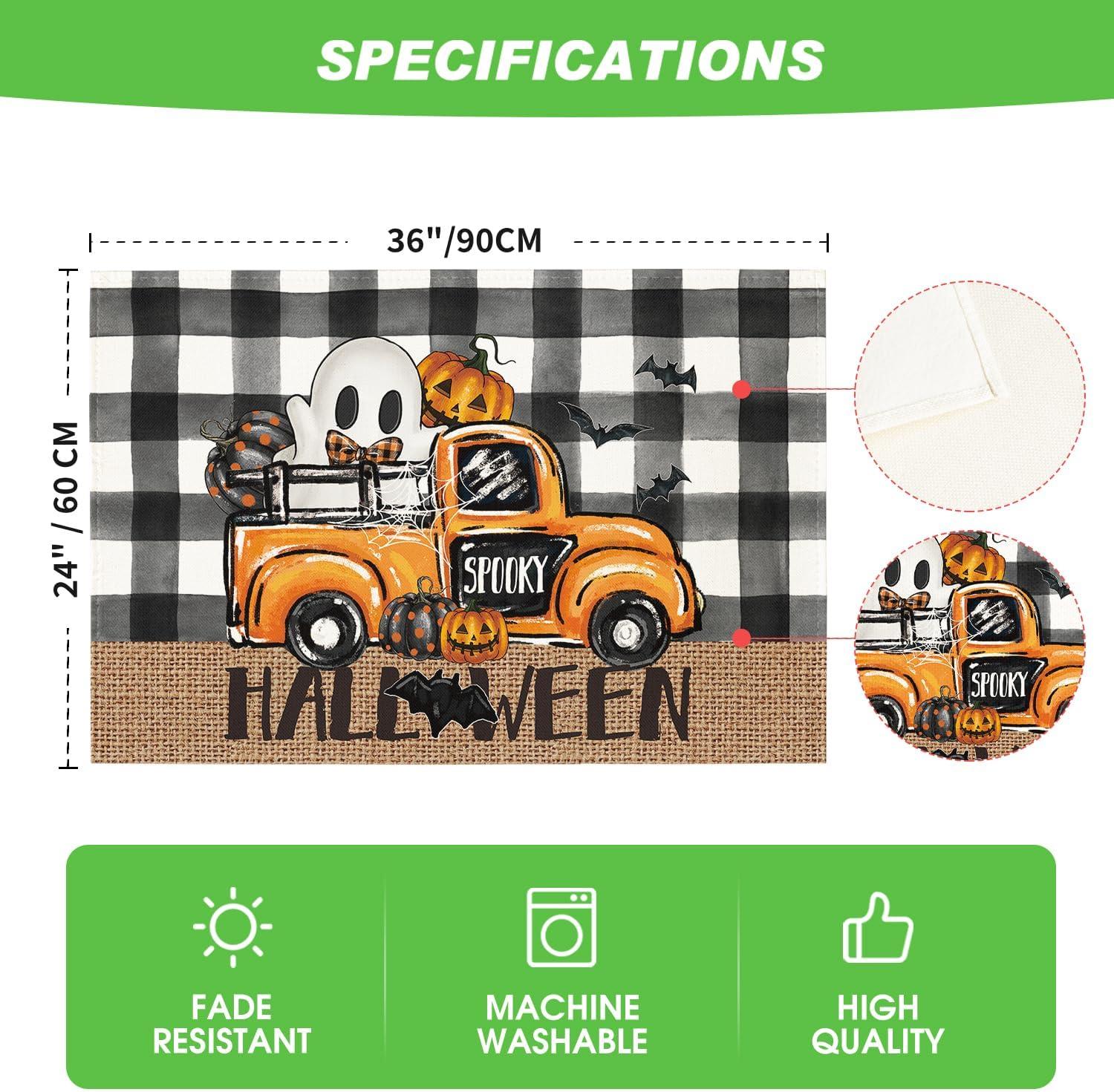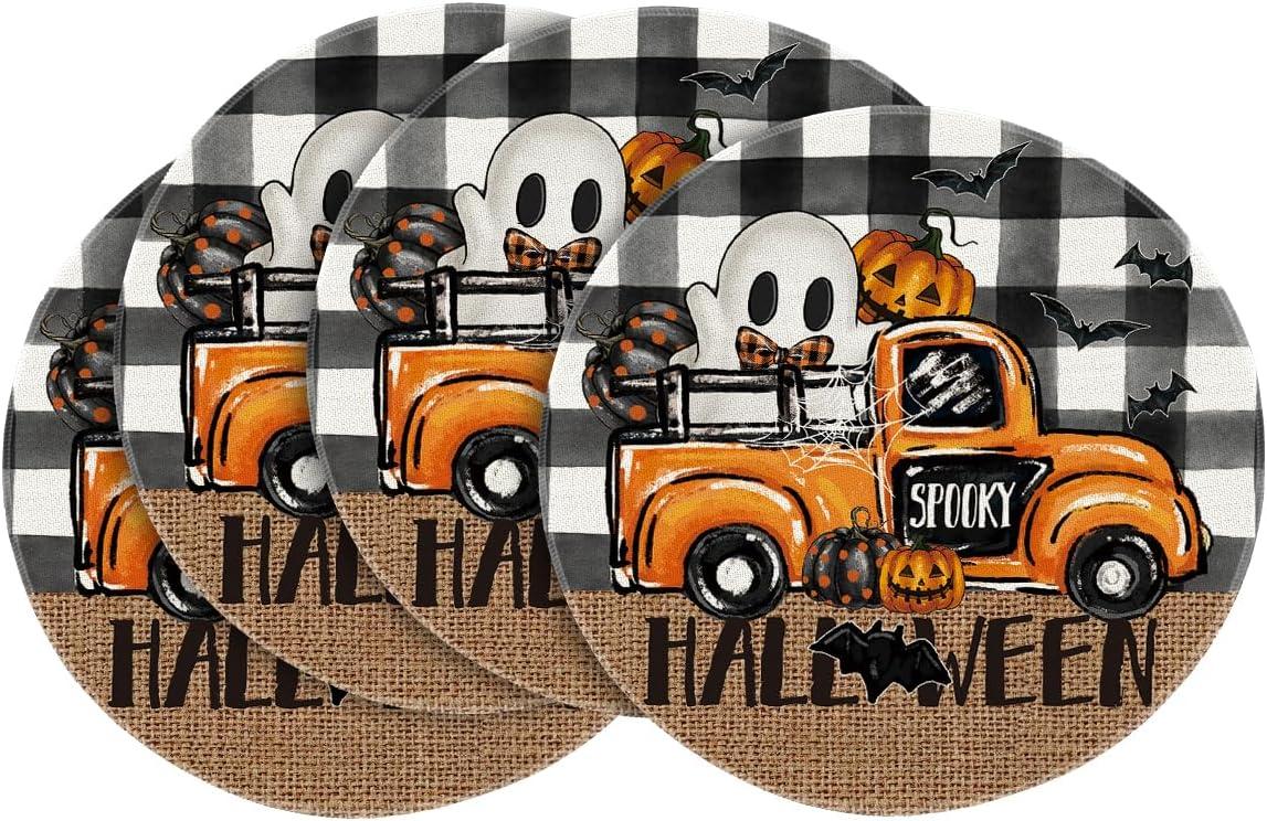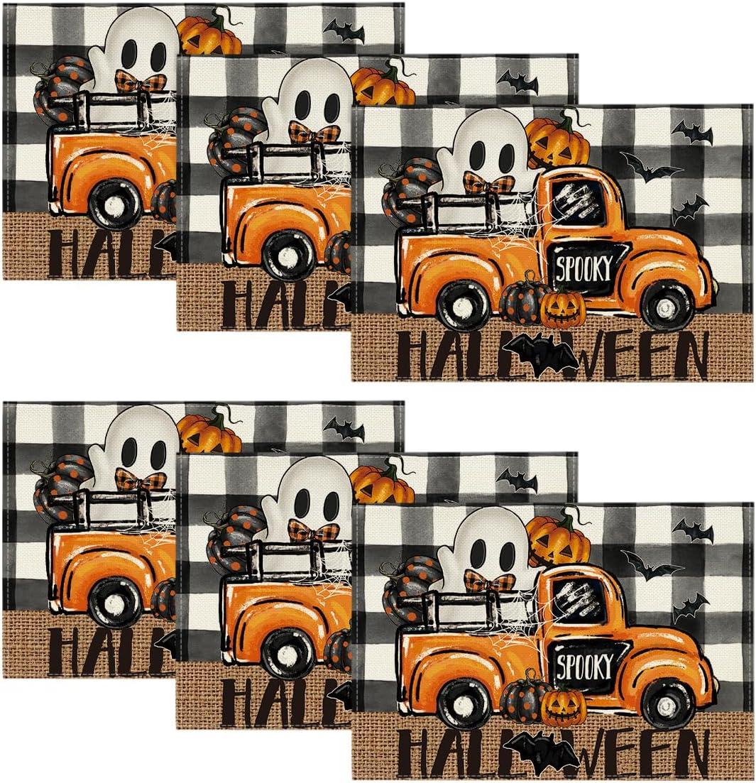 Artoid Mode Buffalo Plaid Bat Ghost Truck Spooky Halloween Placemats Set of 4, 12×18 Inch Seasonal Table Mats for Party Kitchen Dining Decoration(Black/Beige)