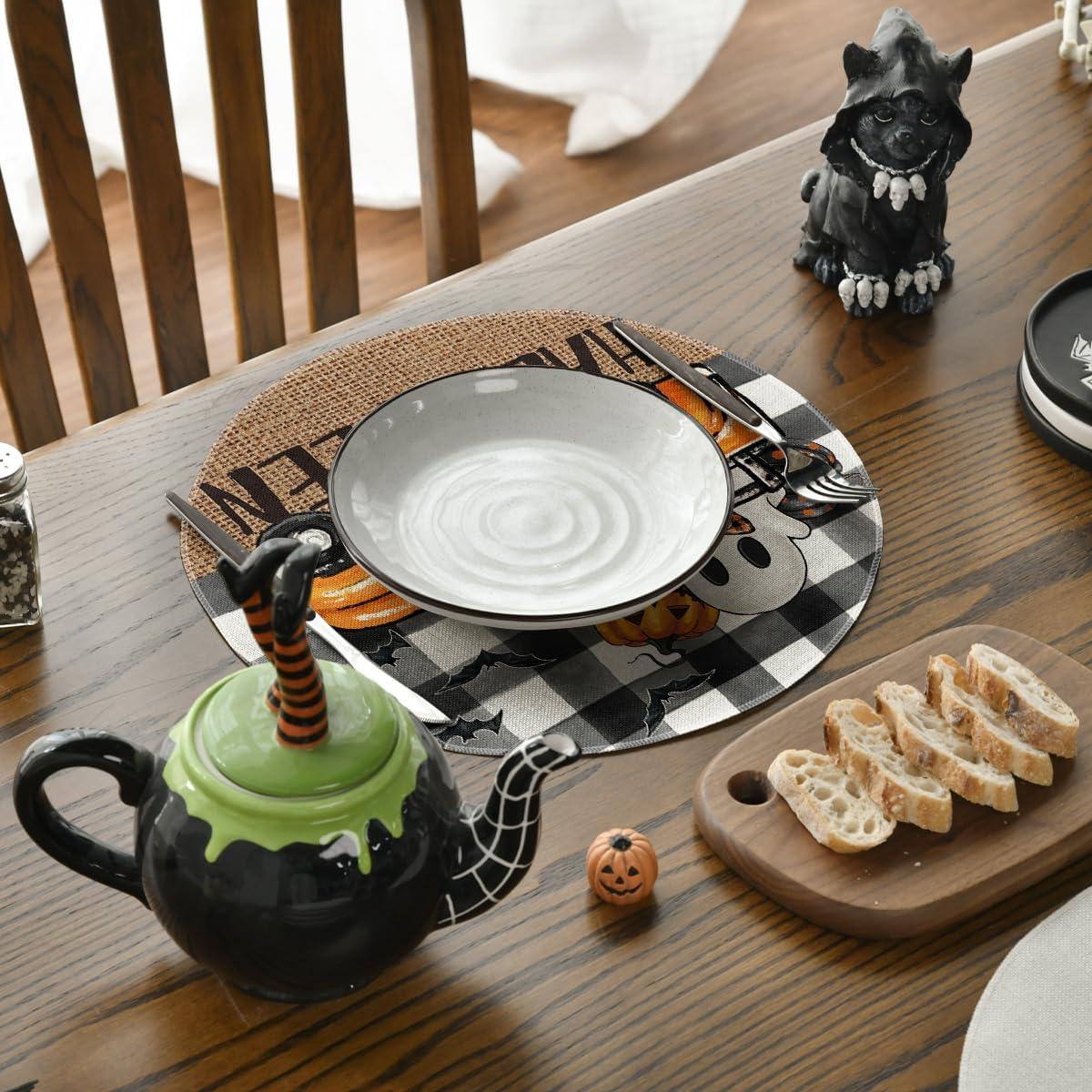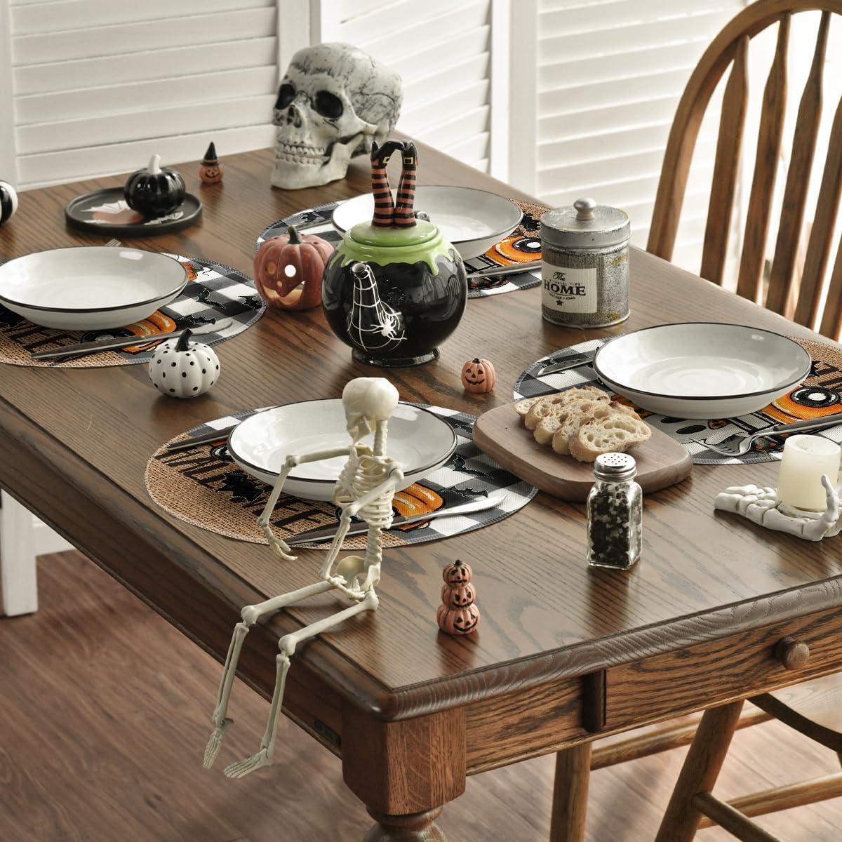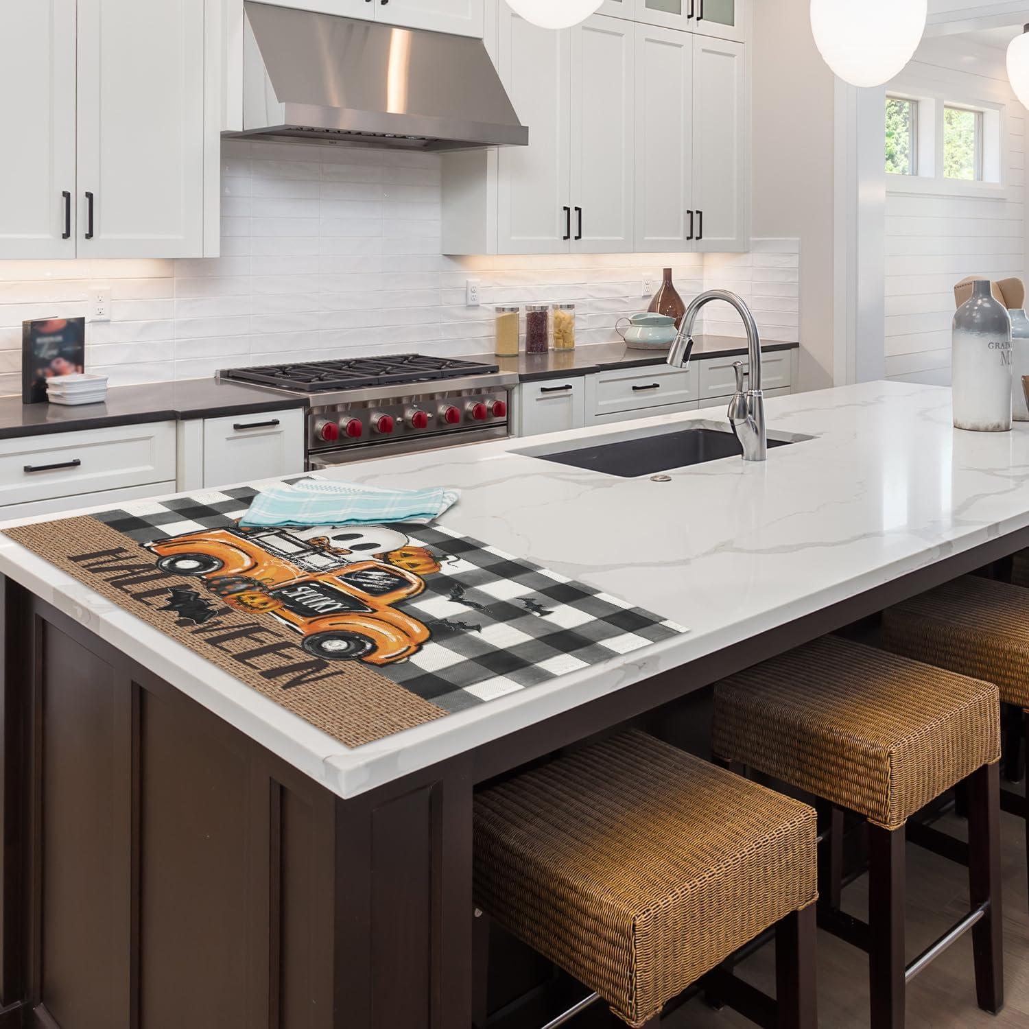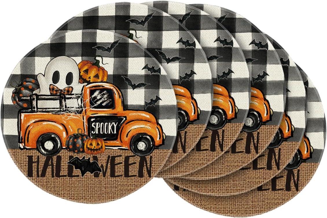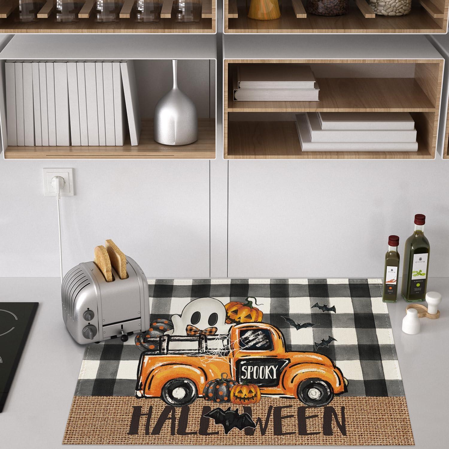 Artoid Mode Buffalo Plaid Bat Ghost Truck Spooky Halloween Placemats Set of 4, 12×18 Inch Seasonal Table Mats for Party Kitchen Dining Decoration(Black/Beige)