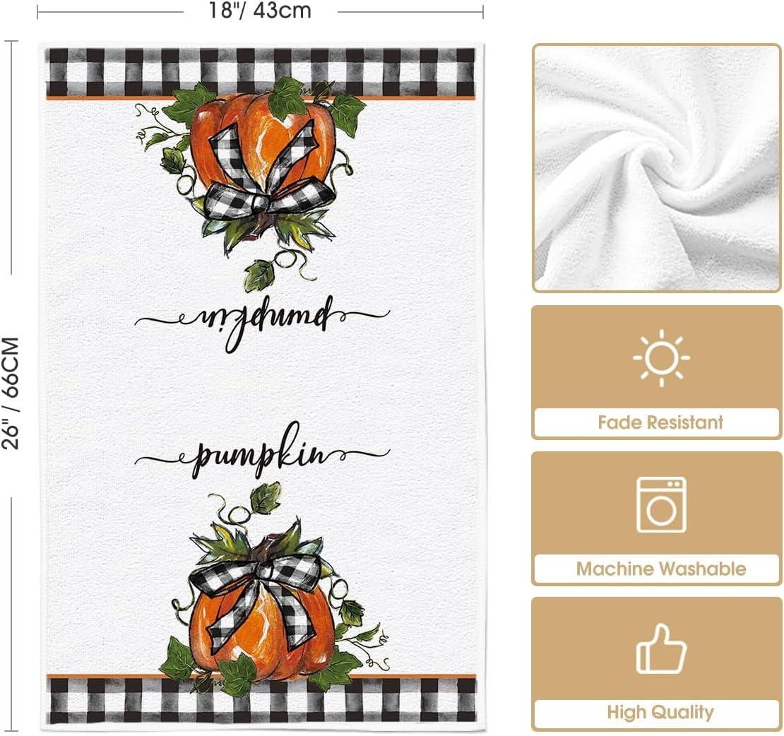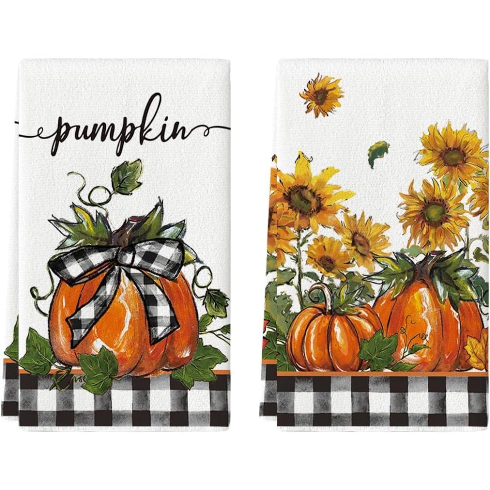 Artoid Mode Buffalo Plaid Bowknot Pumpkin Fall Kitchen Towels Dish Towels, 18×26 Inch Farmhouse Sunflower Thanksgiving Decoration Hand Towels Set of 2