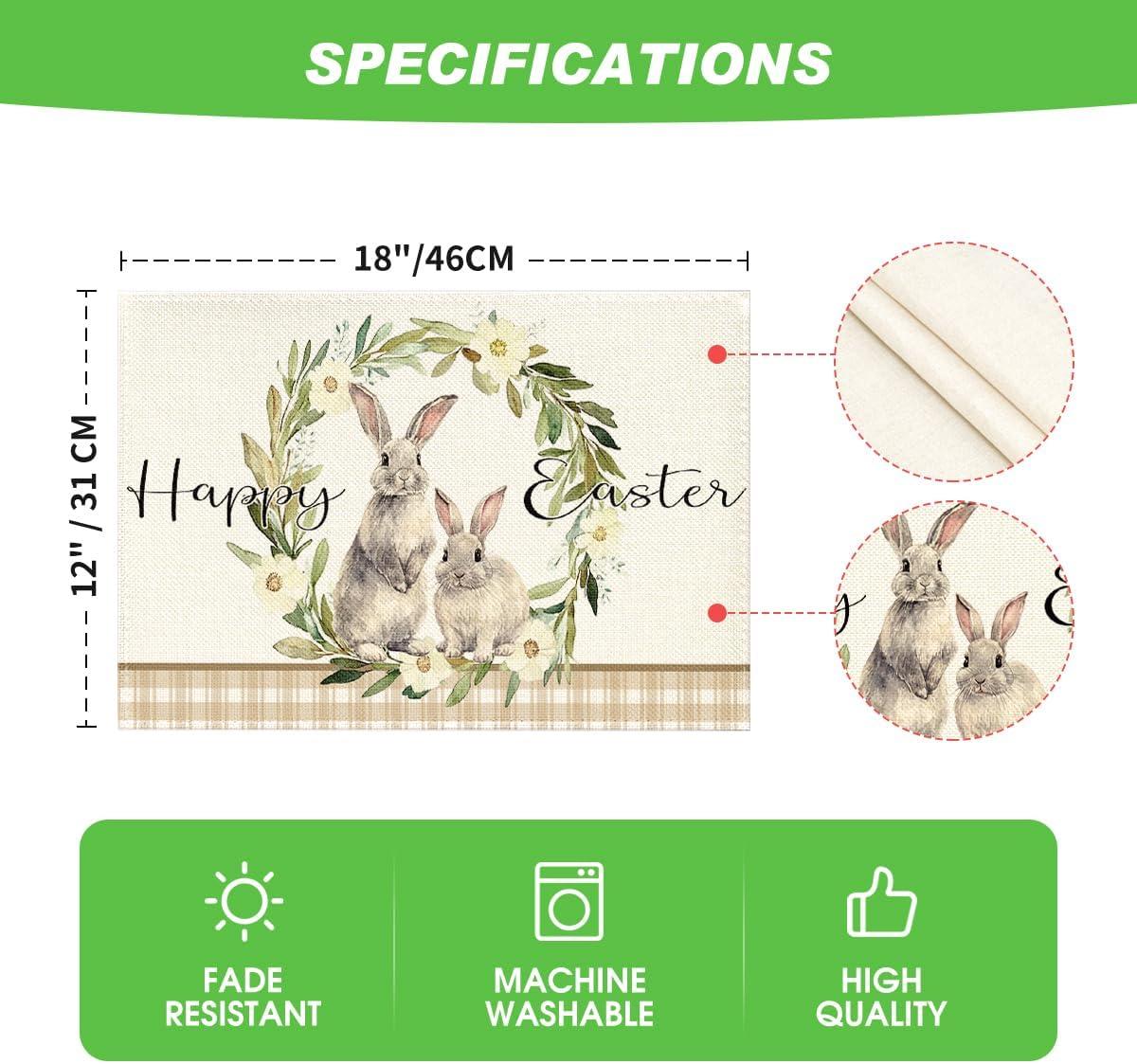 Artoid Mode Buffalo Plaid Bunny Rabbits Happy Easter Placemats Set of 4, 12×18 Inch Seasonal Flower Table Mats for Party Kitchen Dining Decoration