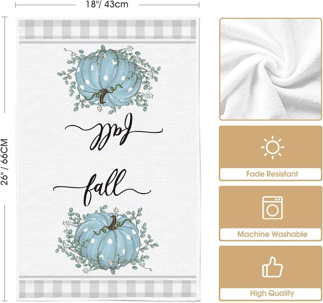Artoid Mode Buffalo Plaid Eucalyptus Leaves Pumpkin Fall Kitchen Towels Dish Towels, 18×26 Inch Farmhouse Thanksgiving Decoration Hand Towels Set of 2(Blue/Beige)