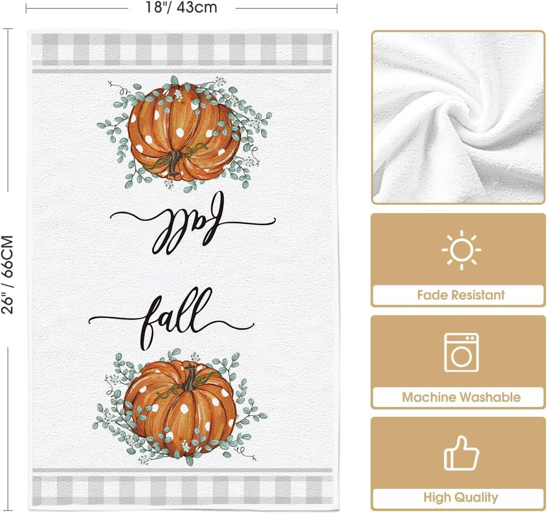 Artoid Mode Buffalo Plaid Eucalyptus Leaves Pumpkin Fall Kitchen Towels Dish Towels, 18×26 Inch Farmhouse Thanksgiving Decoration Hand Towels Set of 2(Orange/White)