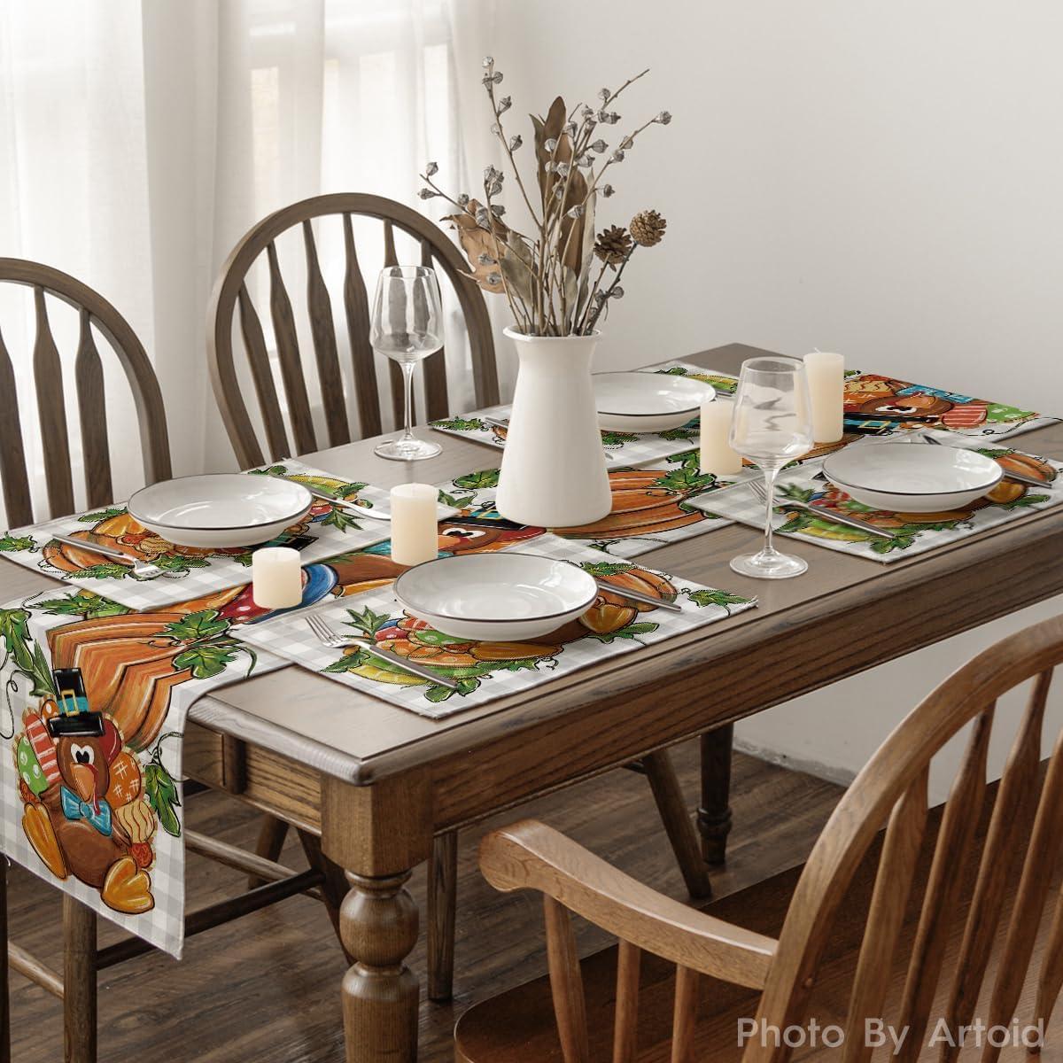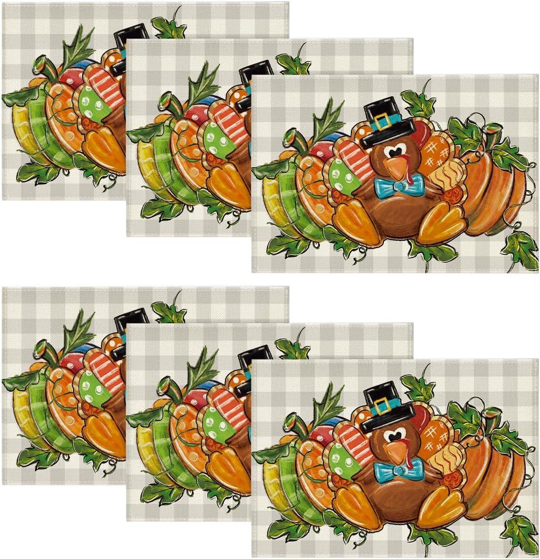 Artoid Mode Buffalo Plaid Pumpkin Turkey Thanksgiving Placemats Set of 6, 12×18 Inch Fall Harvest Table Mats for Party Kitchen Dining Decoration(Brown/Beige)