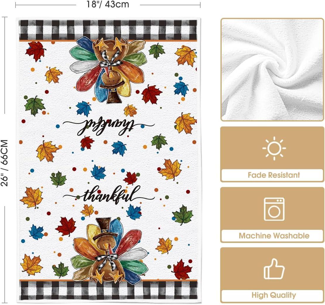Artoid Mode Buffalo Plaid Turkey Thanksgiving Kitchen Towels Dish Towels, 18×26 Inch Fall Leaves Pumpkin Decoration Hand Towels Set of 2