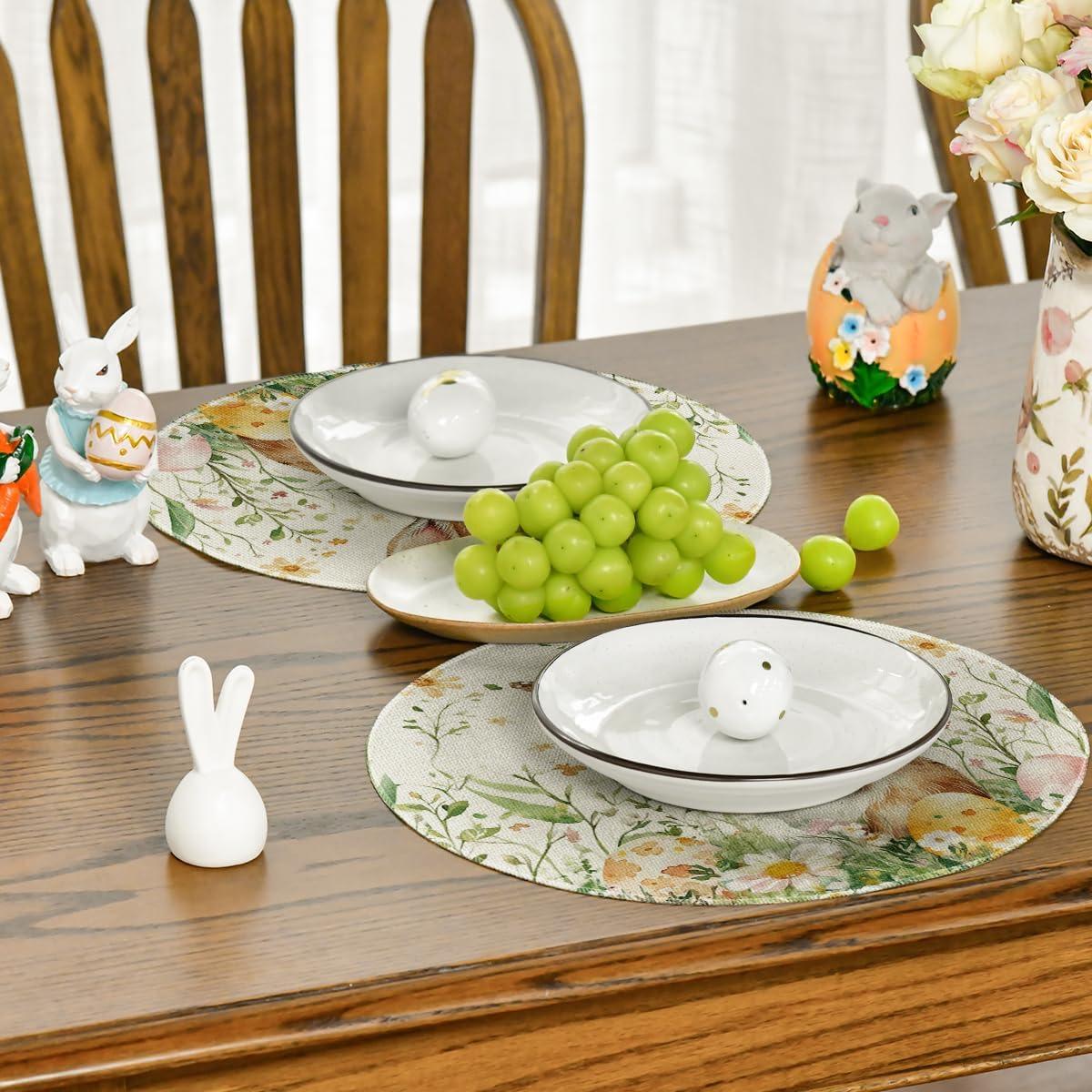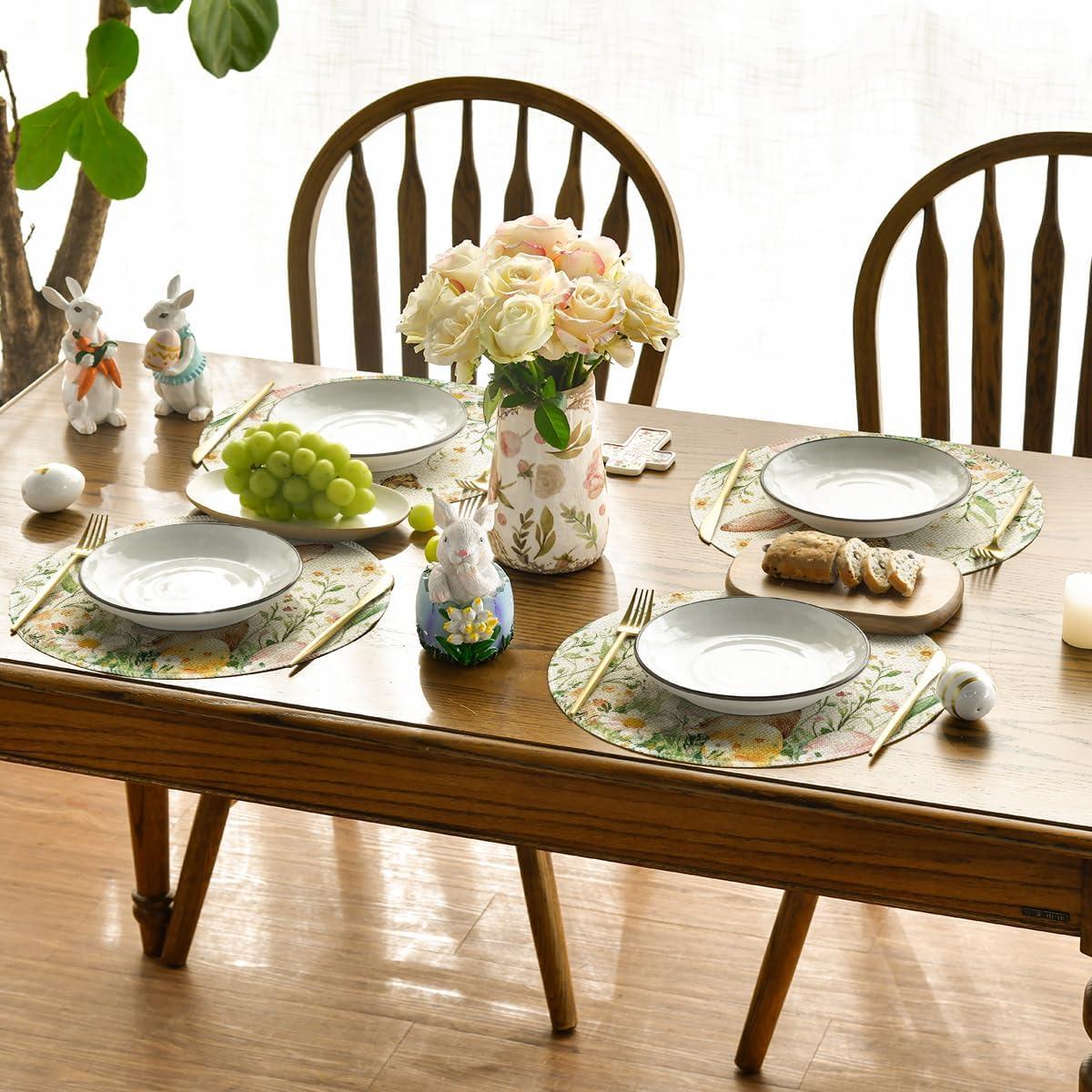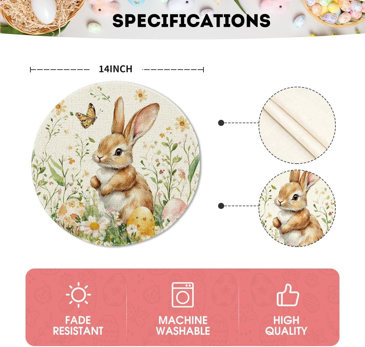 Artoid Mode Bunny Rabbit Butterfly Eggs Flowers Round Easter Placemats Set of 4, 14 Inch Spring Round Table Mats for Dining Decoration(Beige)