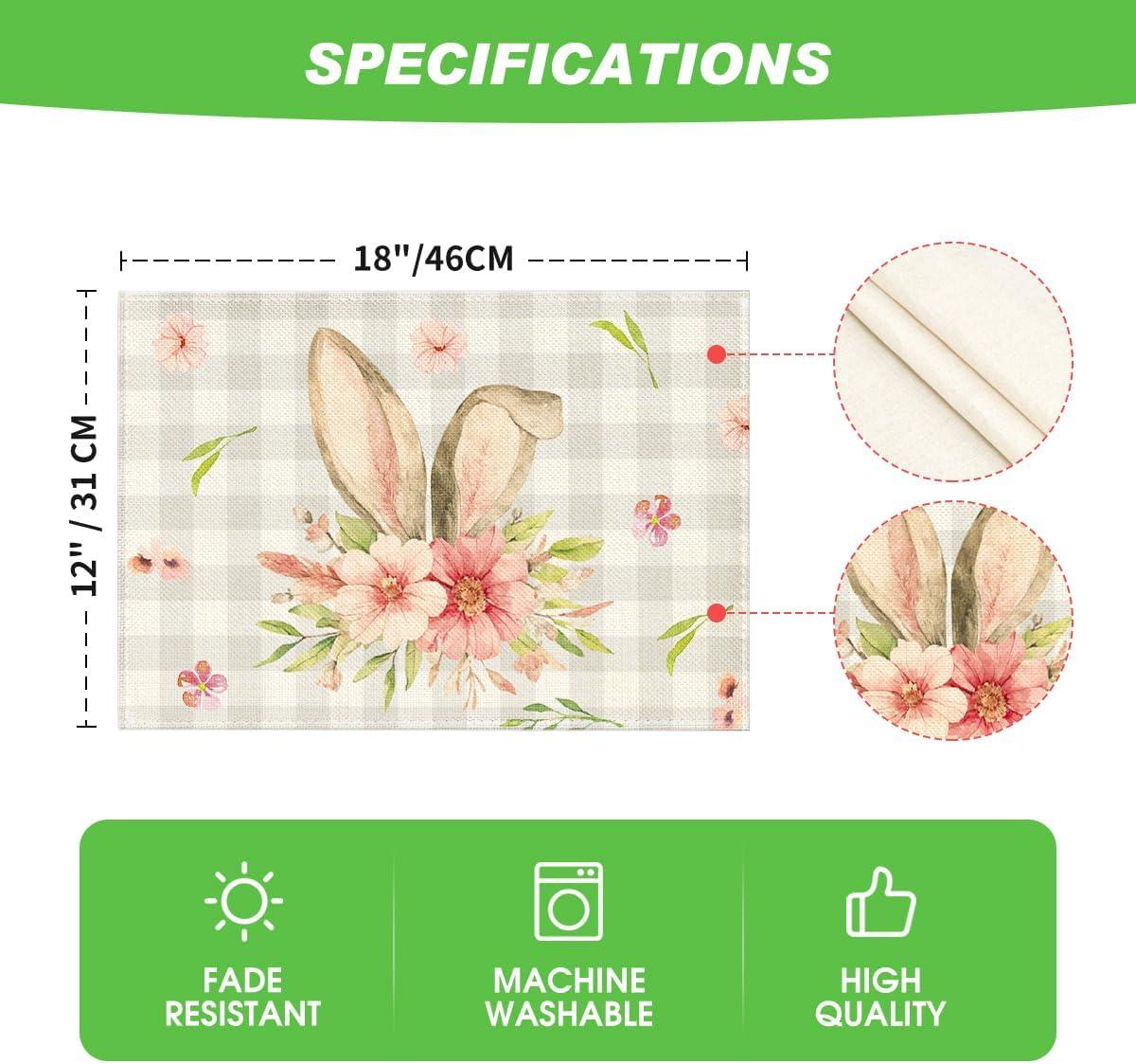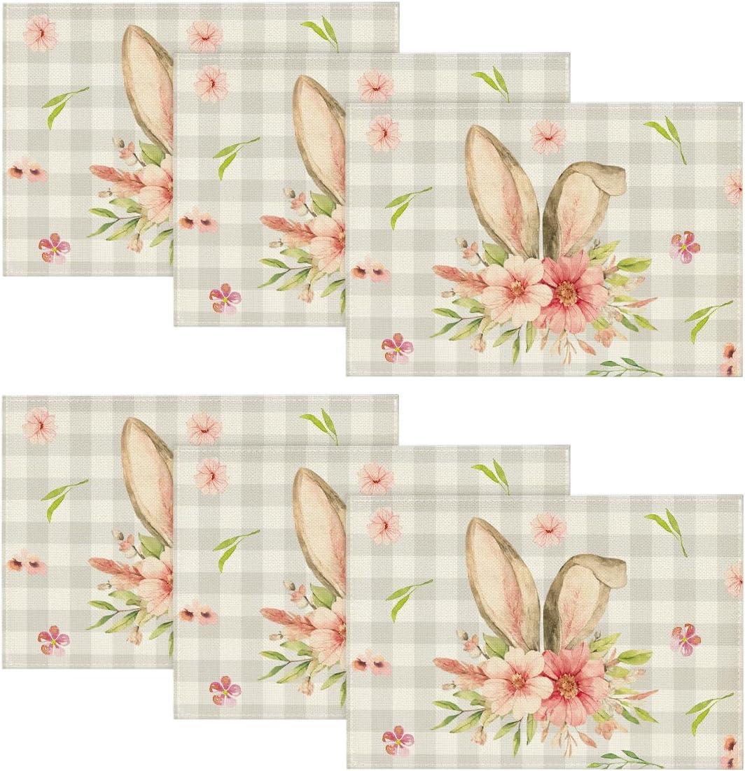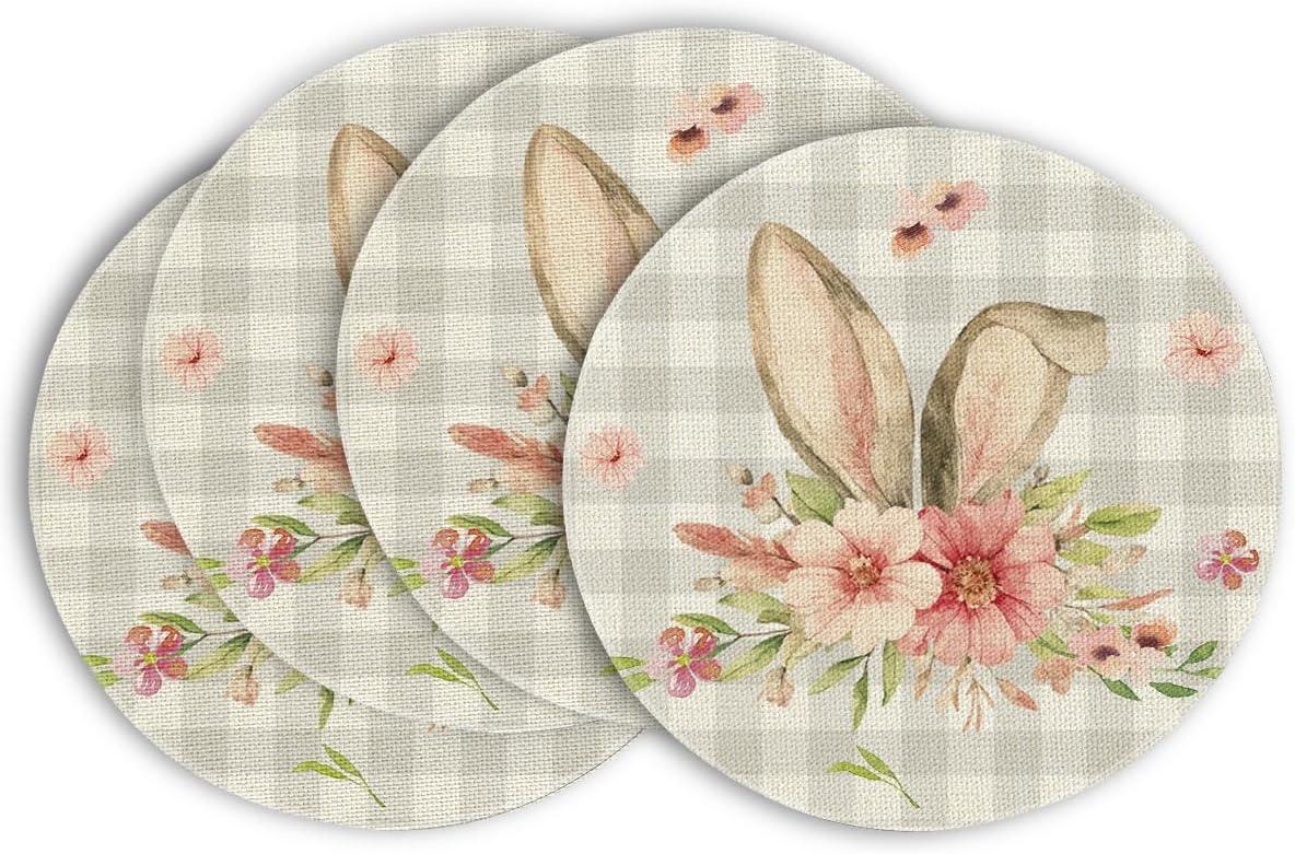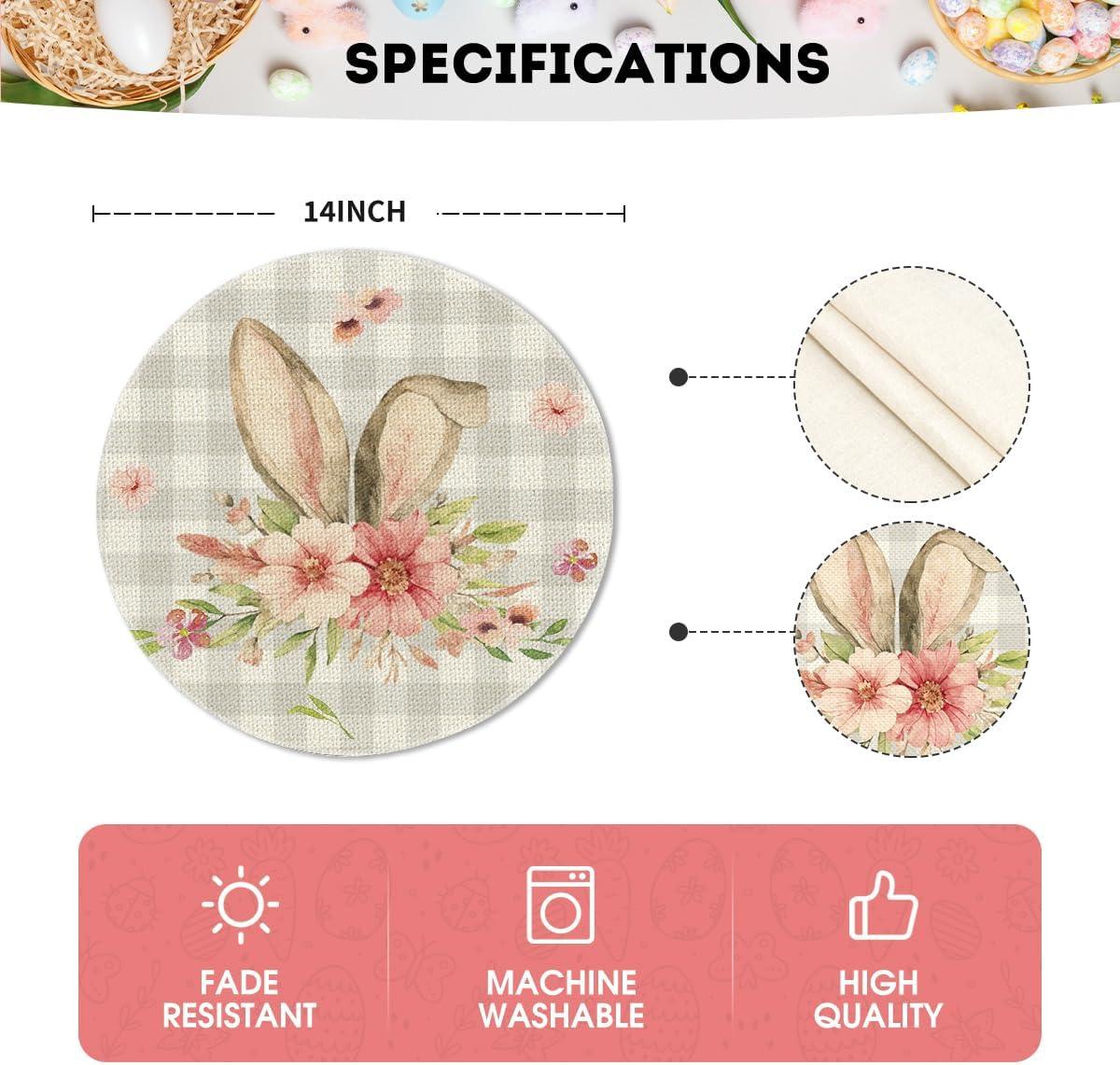 Artoid Mode Bunny Rabbit Ears Buffalo Plaid Flower Easter Round Placemats Set of 4, 15 Inch Spring Table Mats for Party Kitchen Dining Decoration(Beige)