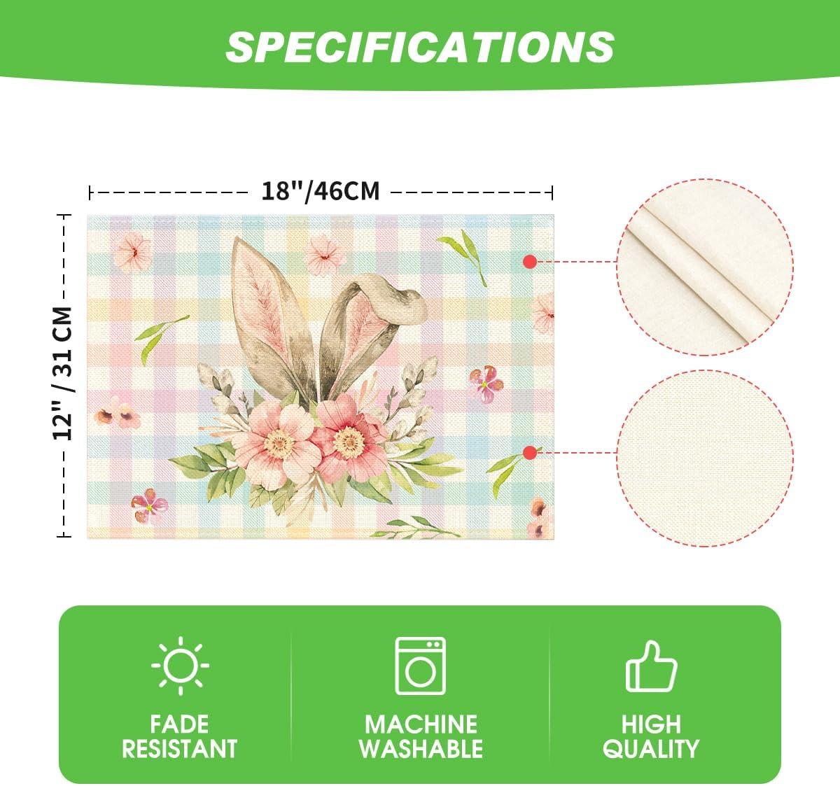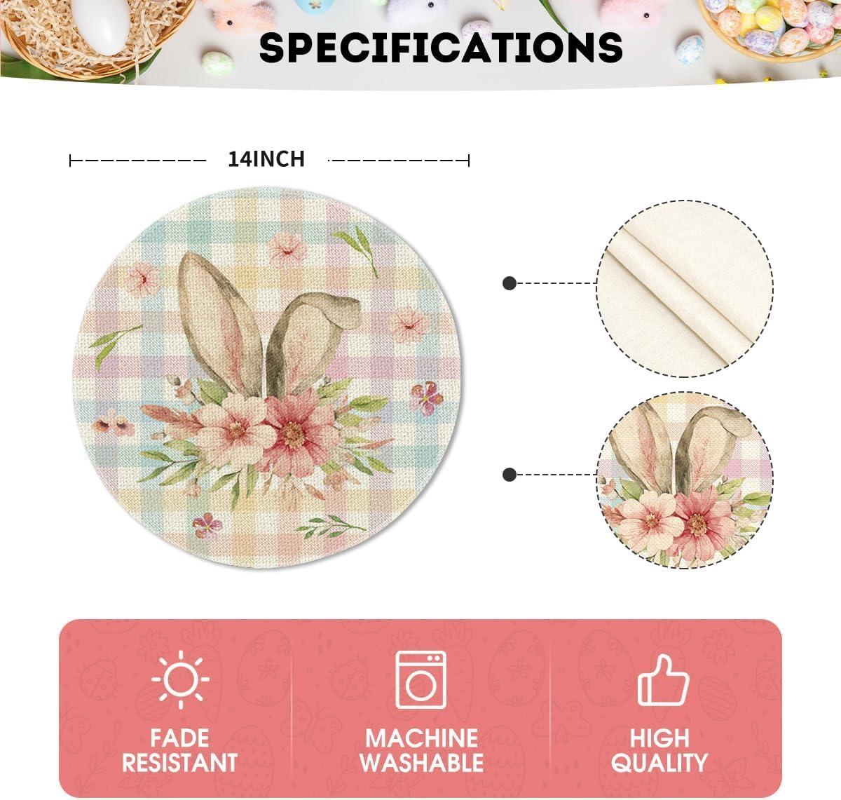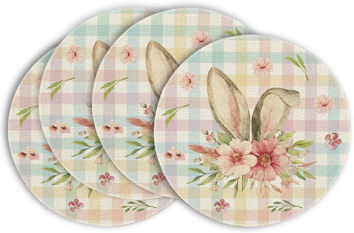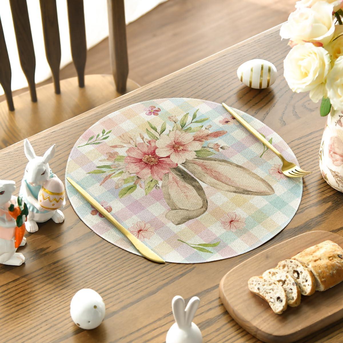 Artoid Mode Bunny Rabbit Ears Buffalo Plaid Flower Easter Round Placemats Set of 4, 15 Inch Spring Table Mats for Party Kitchen Dining Decoration(Blue/Pink)