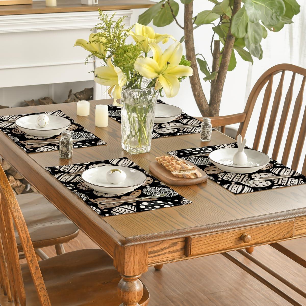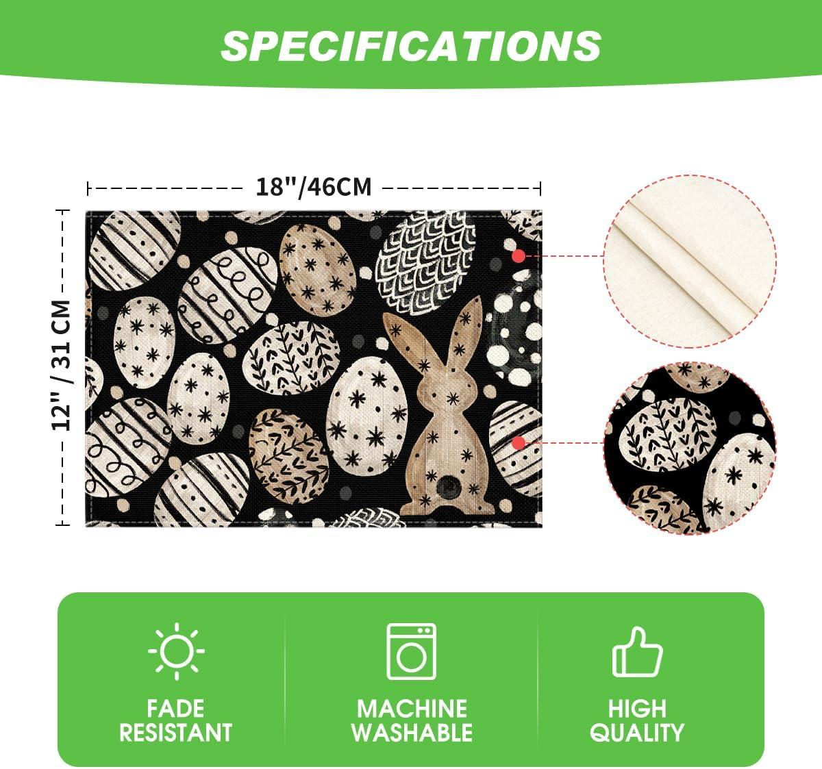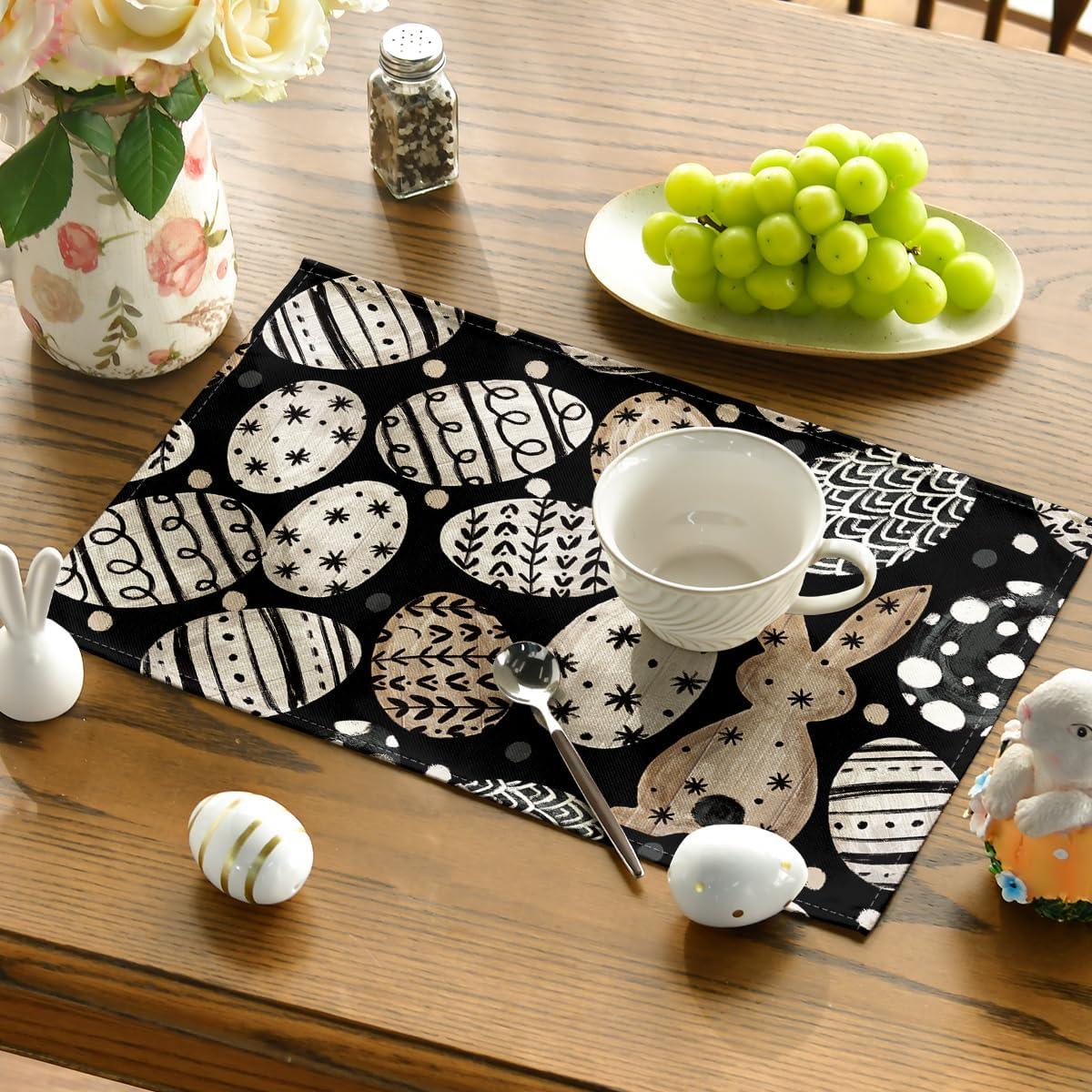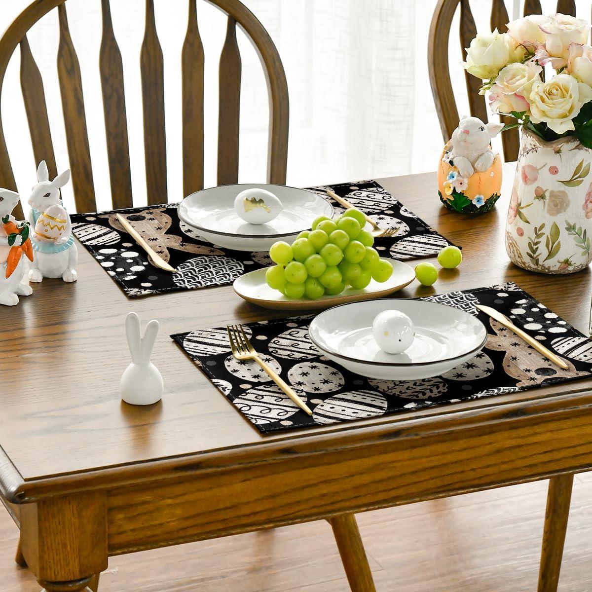 Artoid Mode Bunny Rabbit Eggs Flowers Easter Placemats Set of 4, 12×18 Inch Seasonal Spring Holiday Table Mats for Party Kitchen Dining Decoration(Black)
