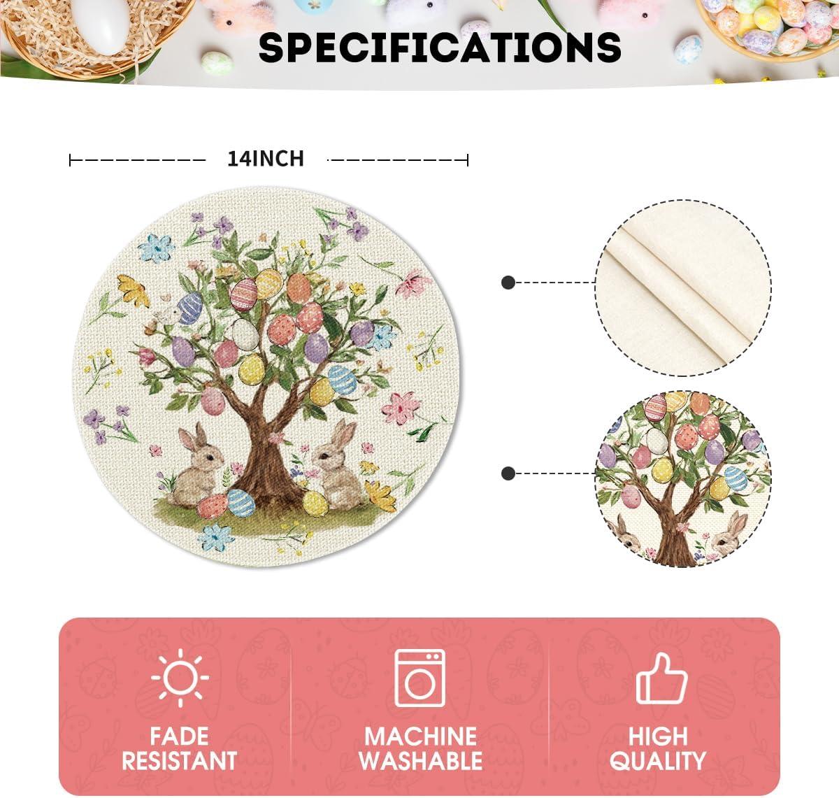 Artoid Mode Bunny Rabbit Eggs Tree Flowers Round Easter Placemats Set of 4, 14 Inch Spring Round Table Mats for Dining Decoration(Beige)