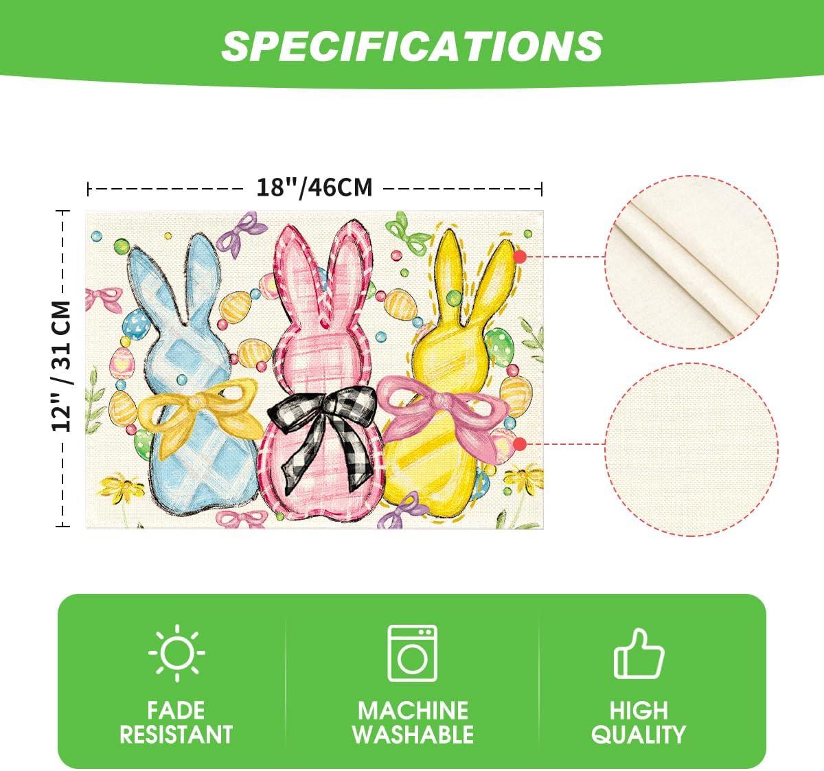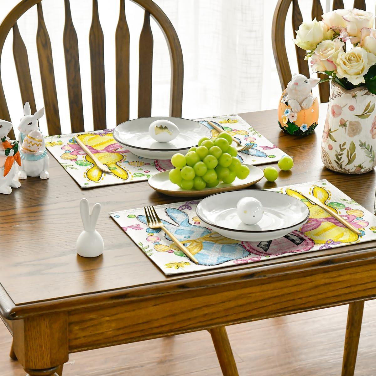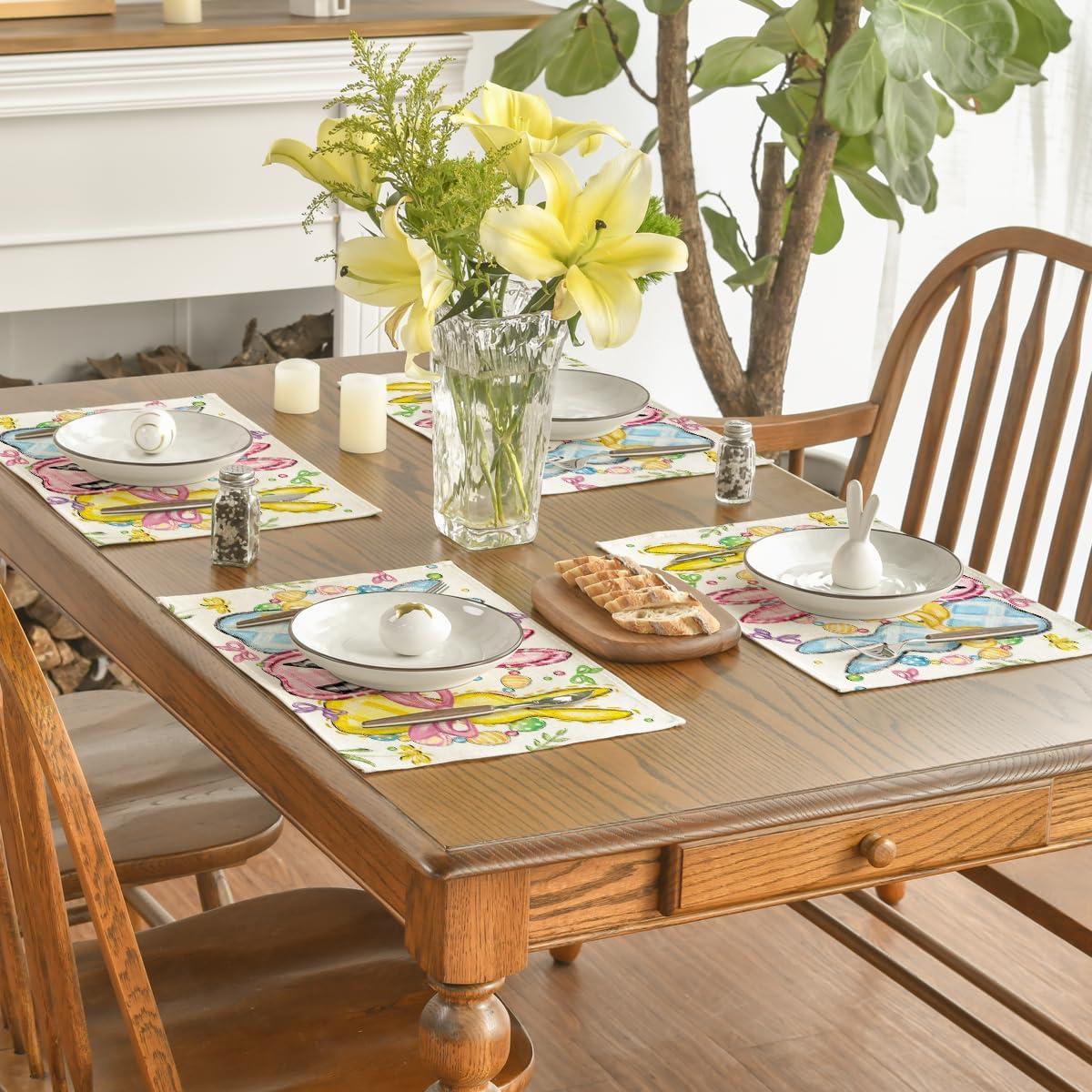 Artoid Mode Bunny Rabbits Eggs Easter Placemats Set of 4, 12×18 Inch Floral Bow Seasonal Spring Holiday Table Mats for Party Kitchen Dining Decoration(Beige)