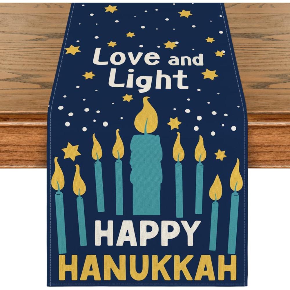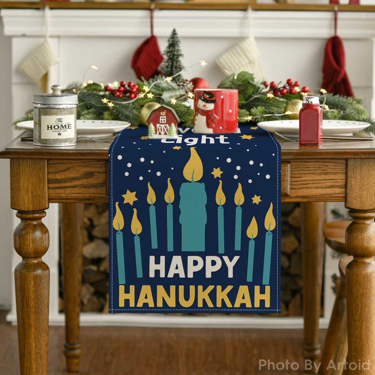 Artoid Mode Candle Hexagram Love and Light Happy Hanukkah Table Runner, Chanukah Kitchen Dining Table Decoration for Home Party Decor 13×72 Inch