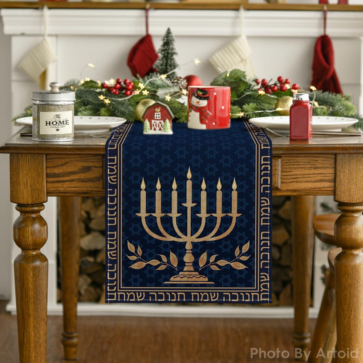 Artoid Mode Candle Menorah Hanukkah Table Runner, Hexagram Chanukah Holiday Kitchen Dining Table Decoration for Home Party Decor 13×72 Inch(Blue)