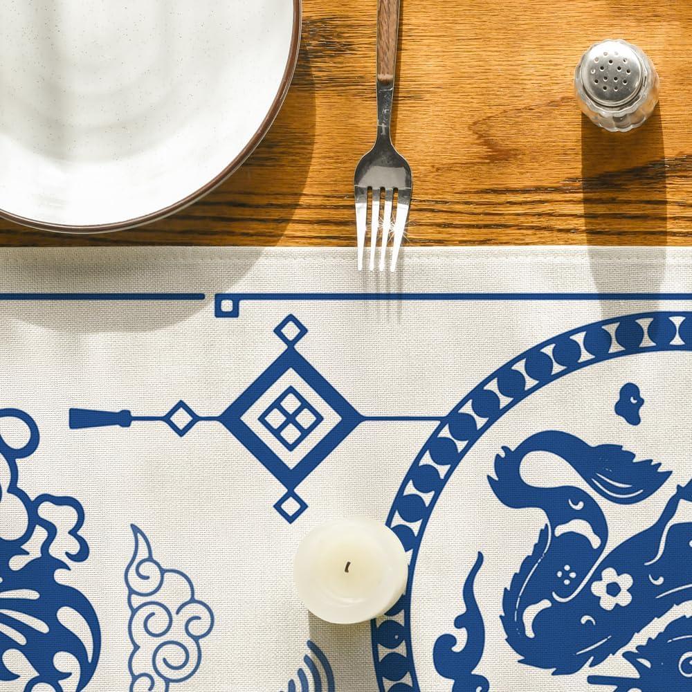 Artoid Mode Chinese Zodiac Dragon 2025 Happy New Year Table Runner, Spring Festival Winter Kitchen Dining Table Decoration for Home Party 13×72 Inch(Beige/Blue)