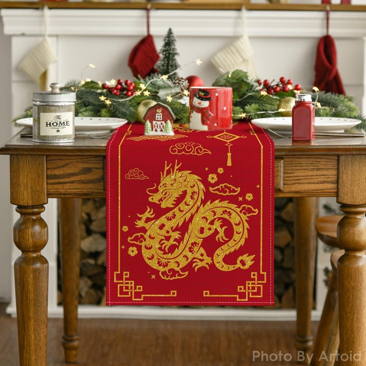 Artoid Mode Chinese Zodiac Dragon 2025 Happy New Year Table Runner, Spring Festival Winter Kitchen Dining Table Decoration for Home Party 13×72 Inch(Red)