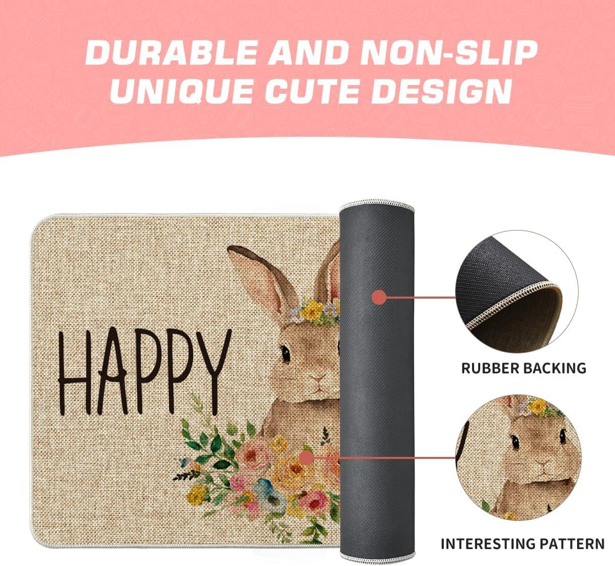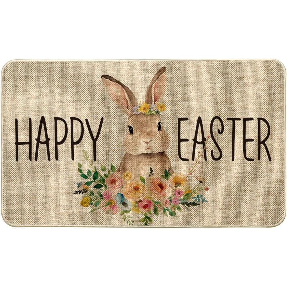 Artoid Mode Cute Rabbit Flowers Happy Easter Welcome Decorative Doormat, Seasonal Spring Low-Profile Rug Switch Mat for Indoor Outdoor 17×29 Inch